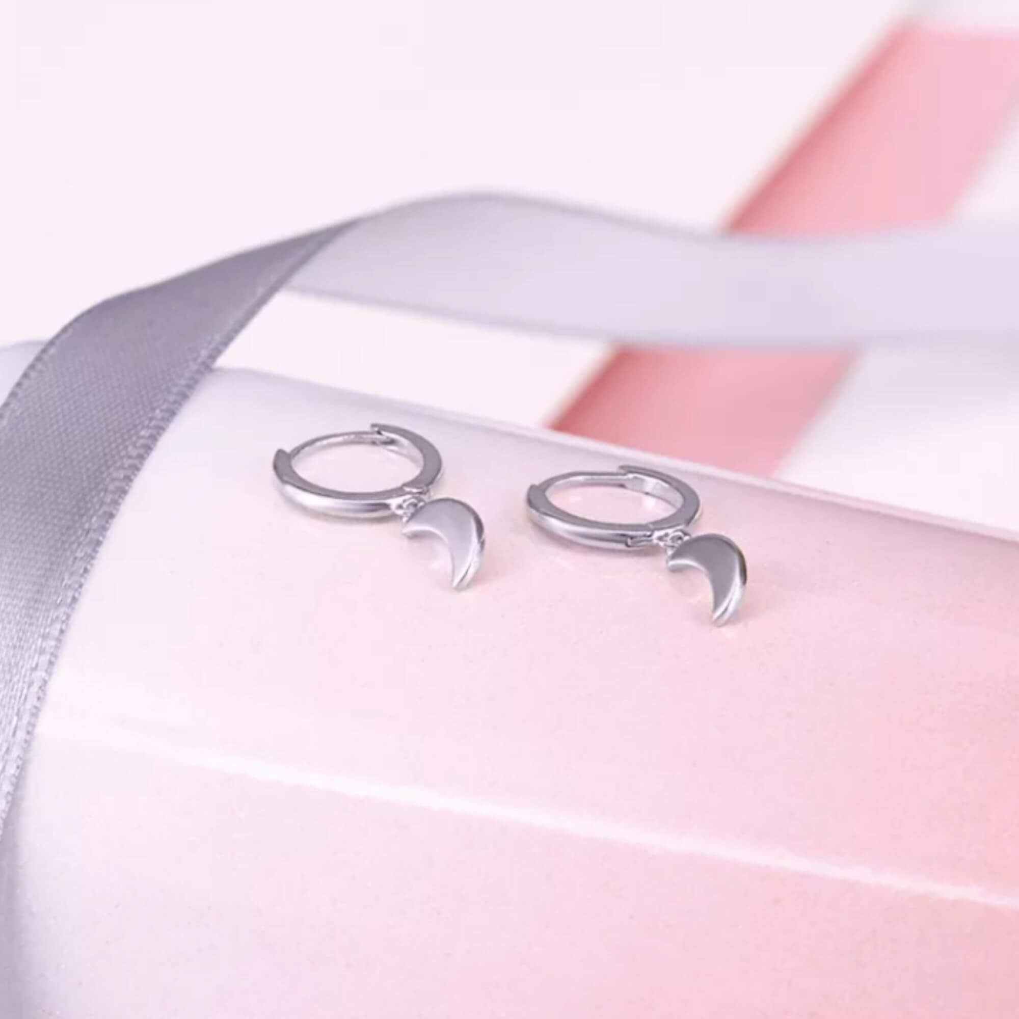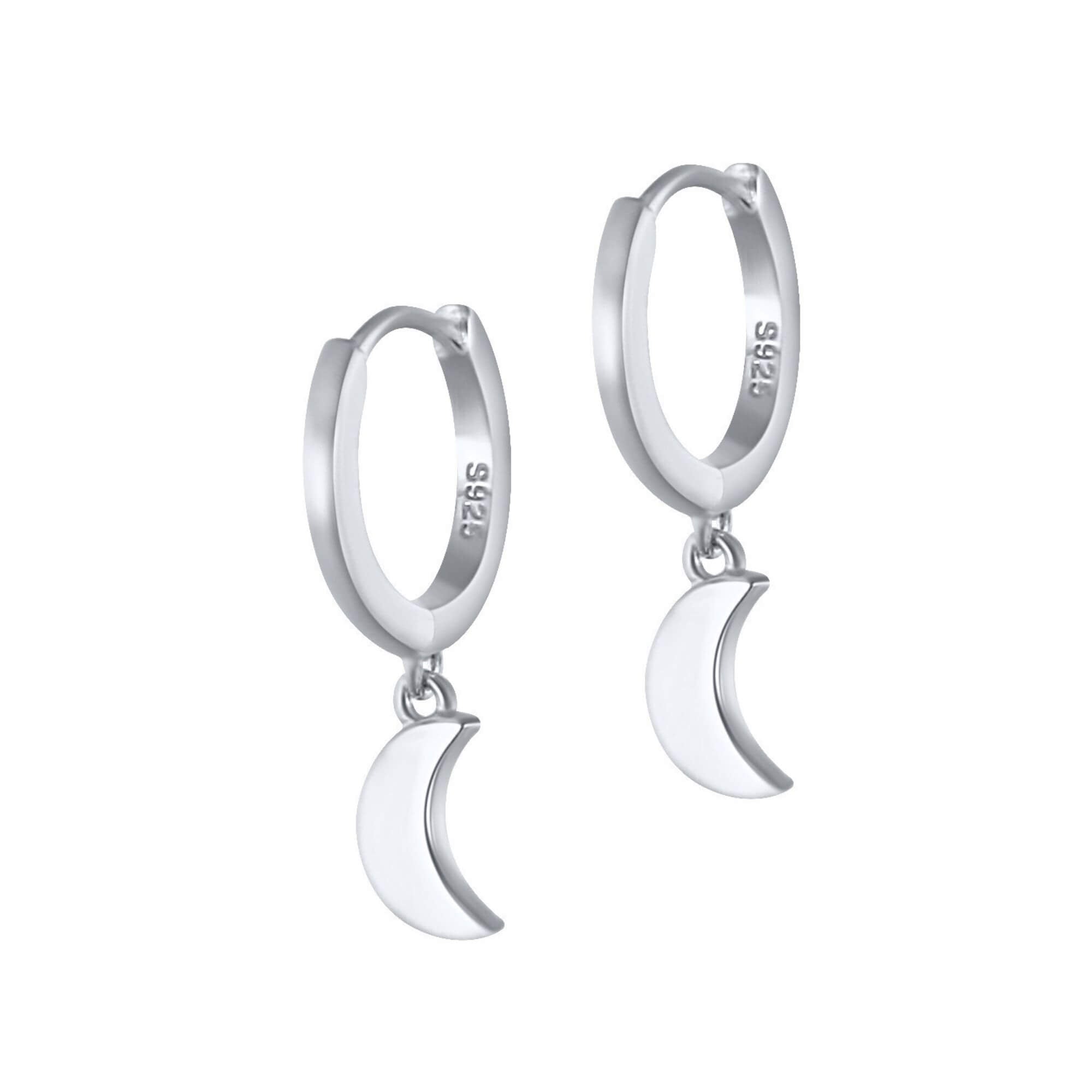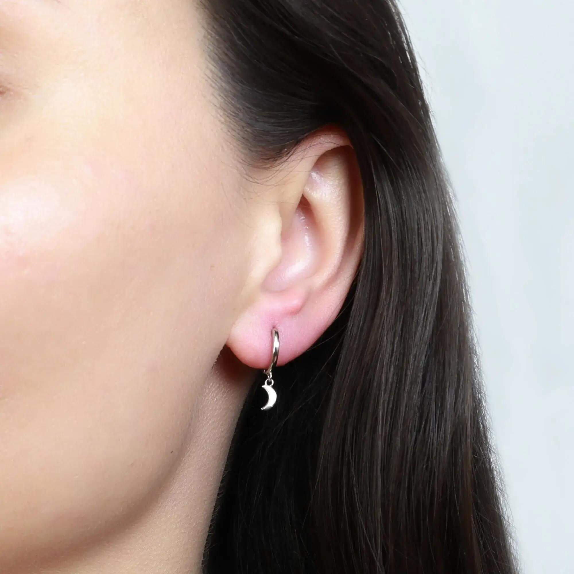 A pair of silver huggie hoops with dangling moon pendants that sit just below the ear. Their playful shape and petite size make them perfect for mixing with other styles or wearing solo for a subtle cosmic touch.