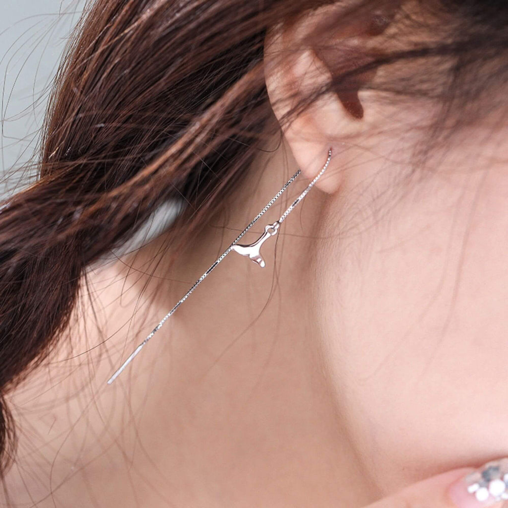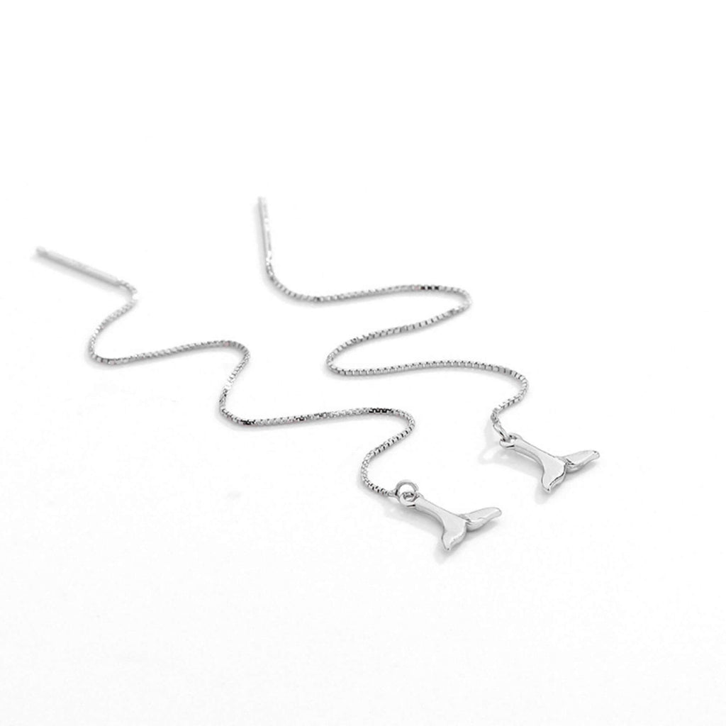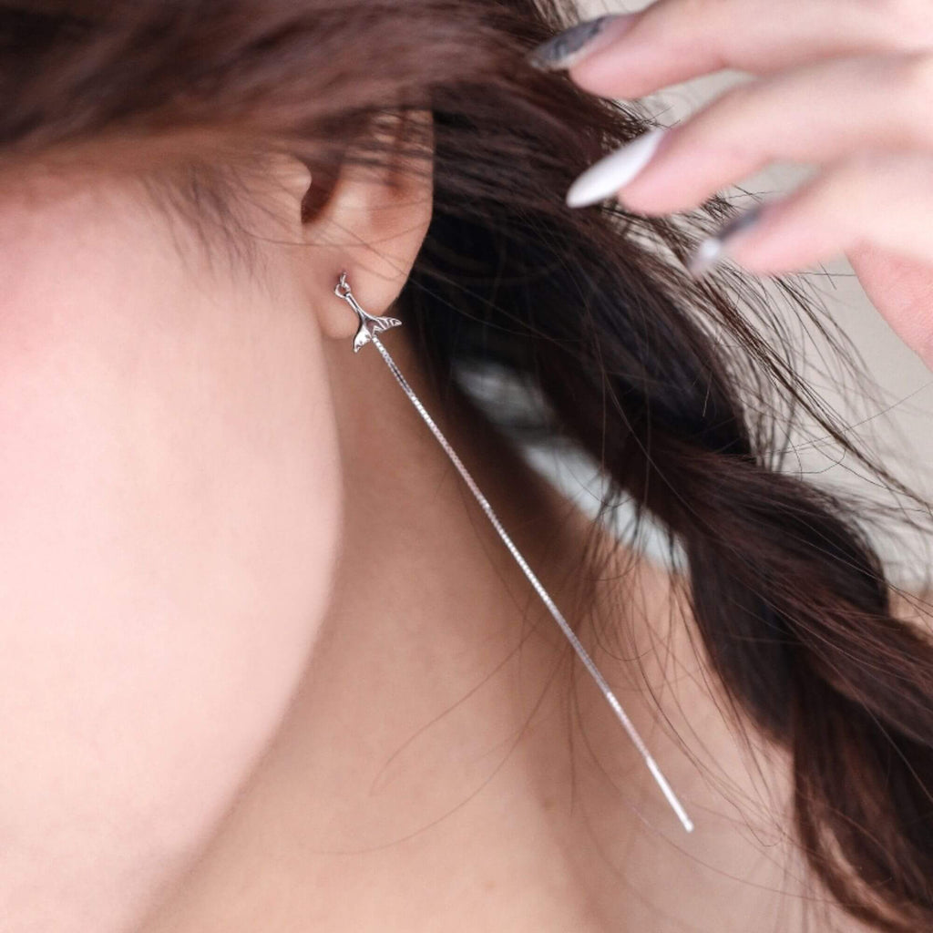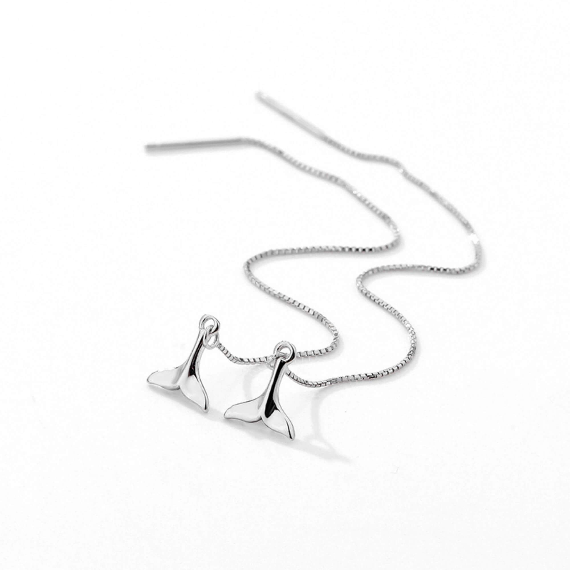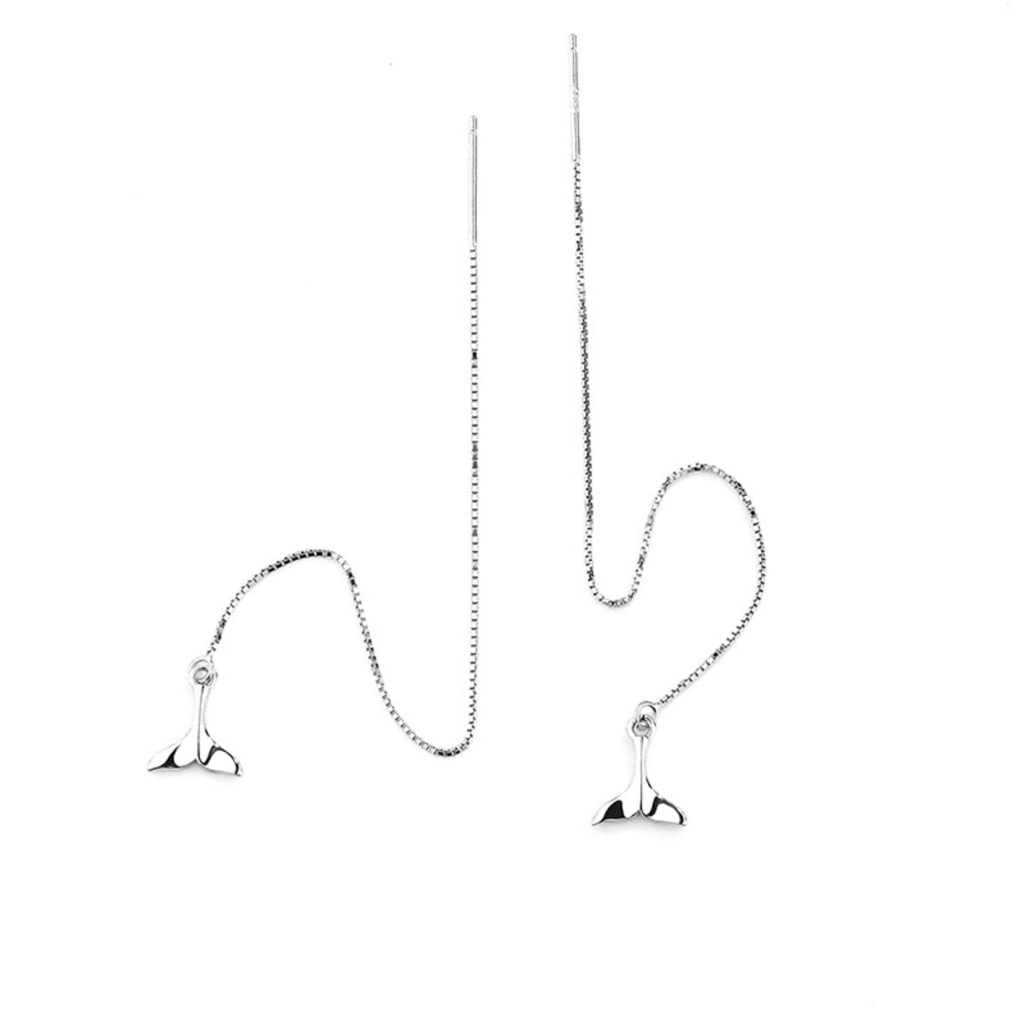 These silver earrings feature a finely sculpted mermaid tail attached to a long chain. The blend of simple design and 10 cm length result in a look, perfect for someone who likes a little extra flair without being flashy.