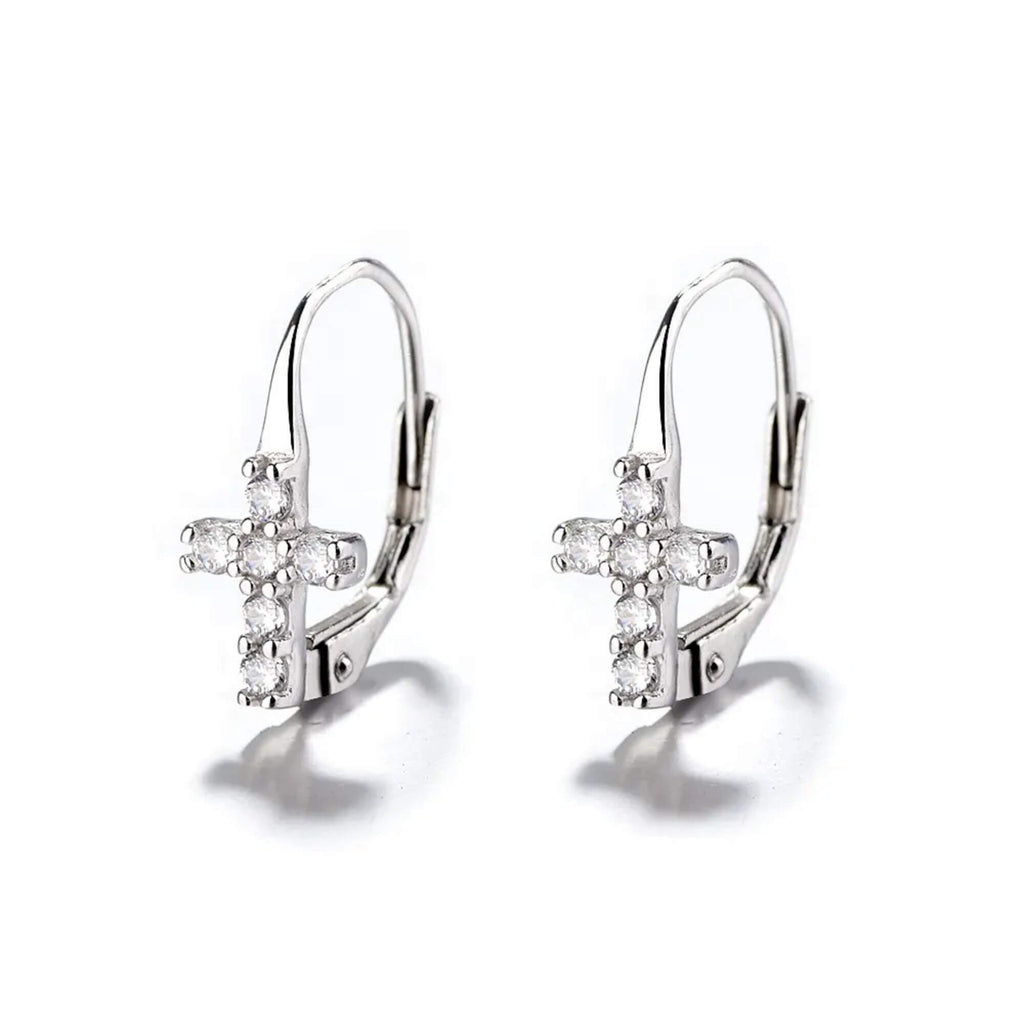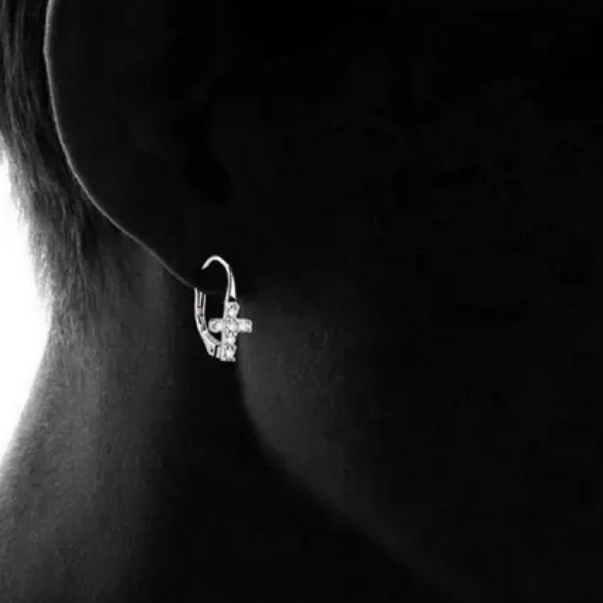 Silver earrings with a cross design and six round cubic zirconia stones. Merging timeless symbolism with a contemporary aesthetic, they offer a touch of sparkle, perfect for expressing faith in style.