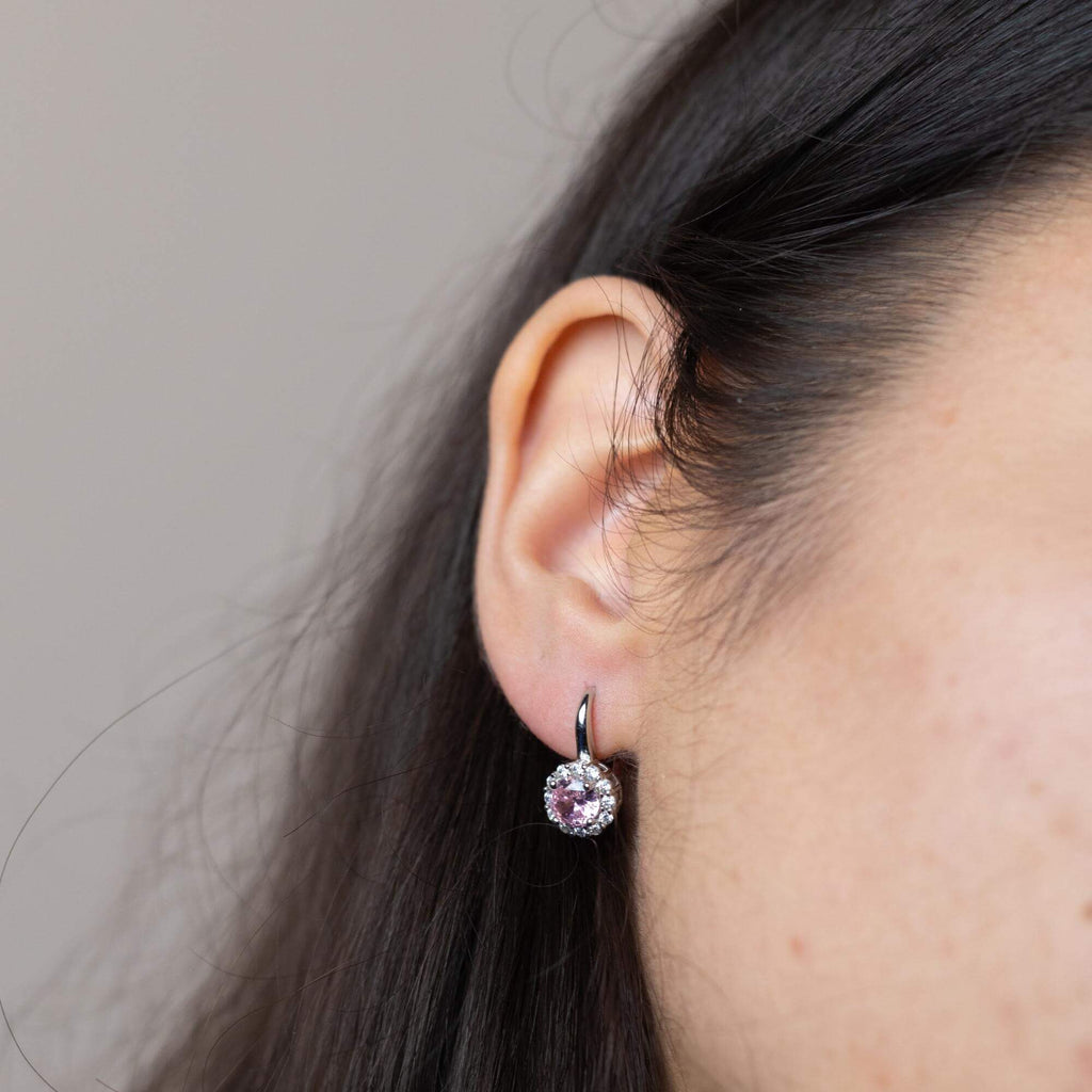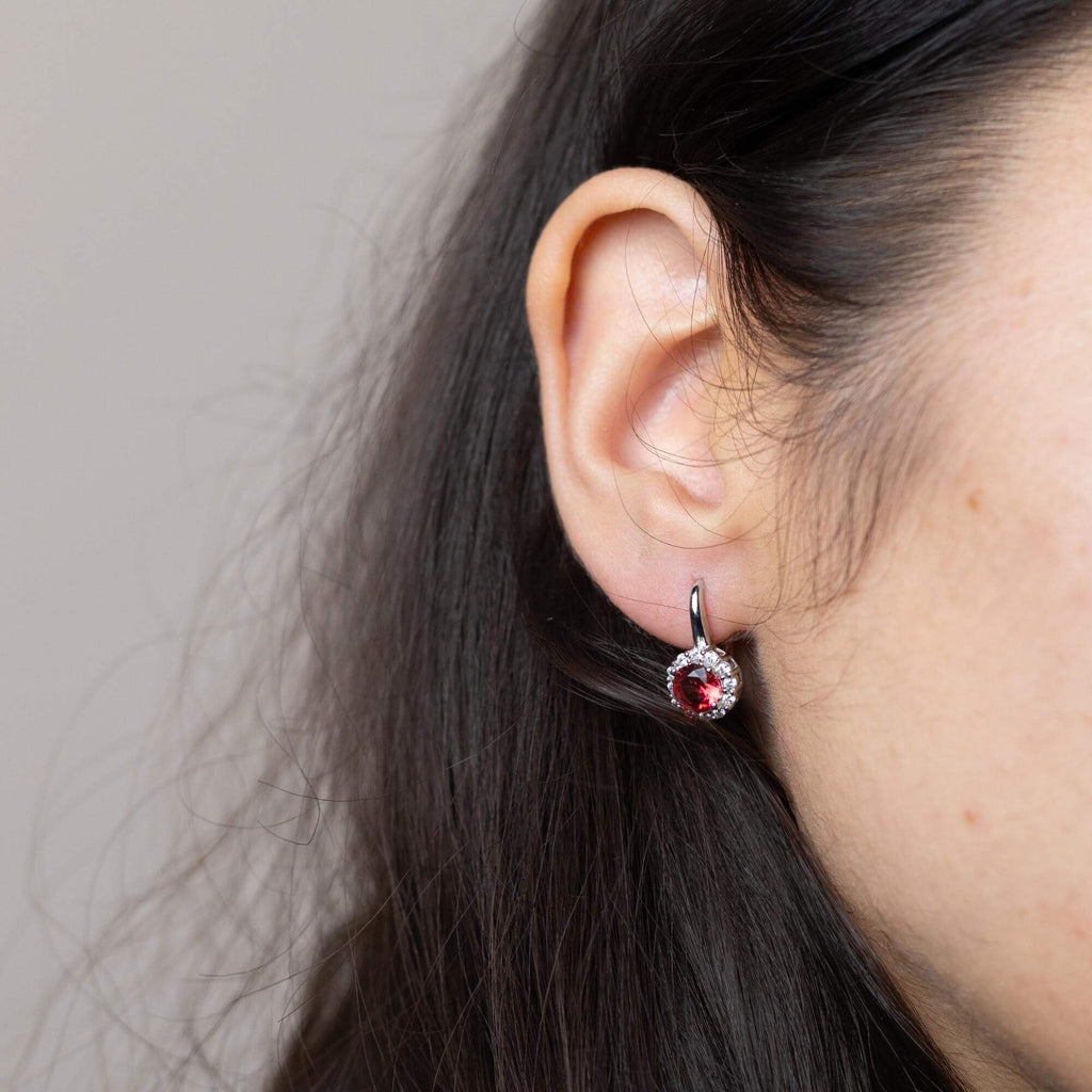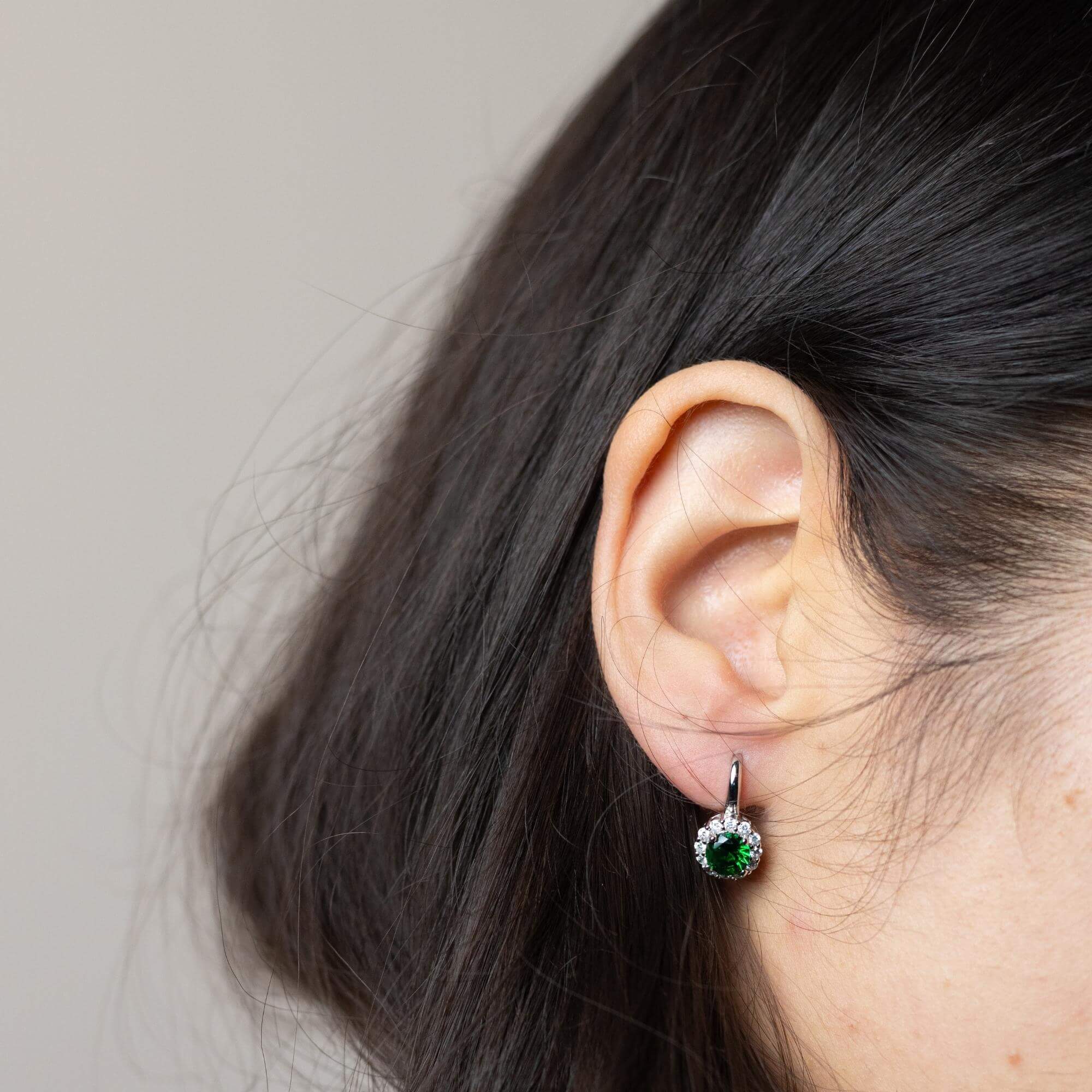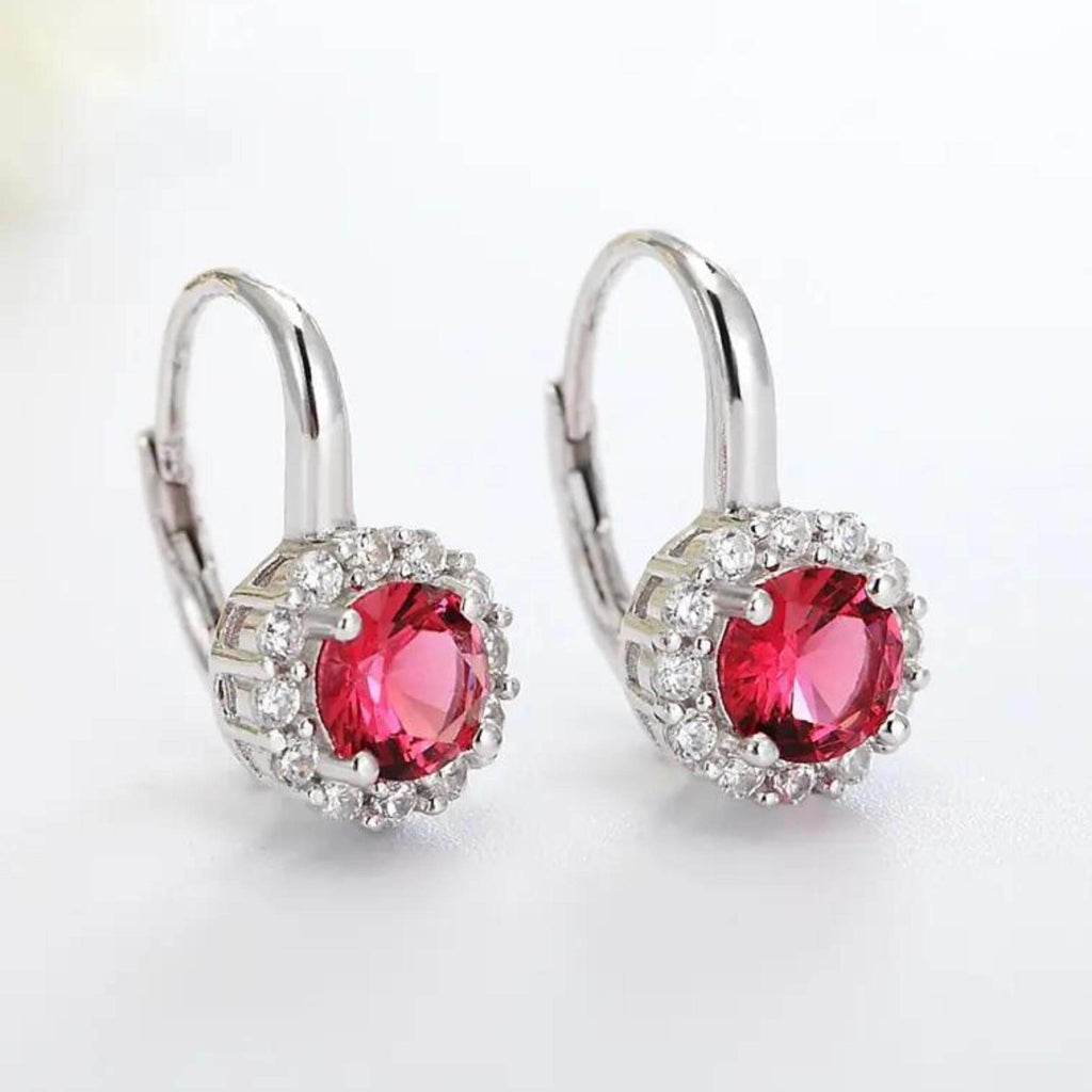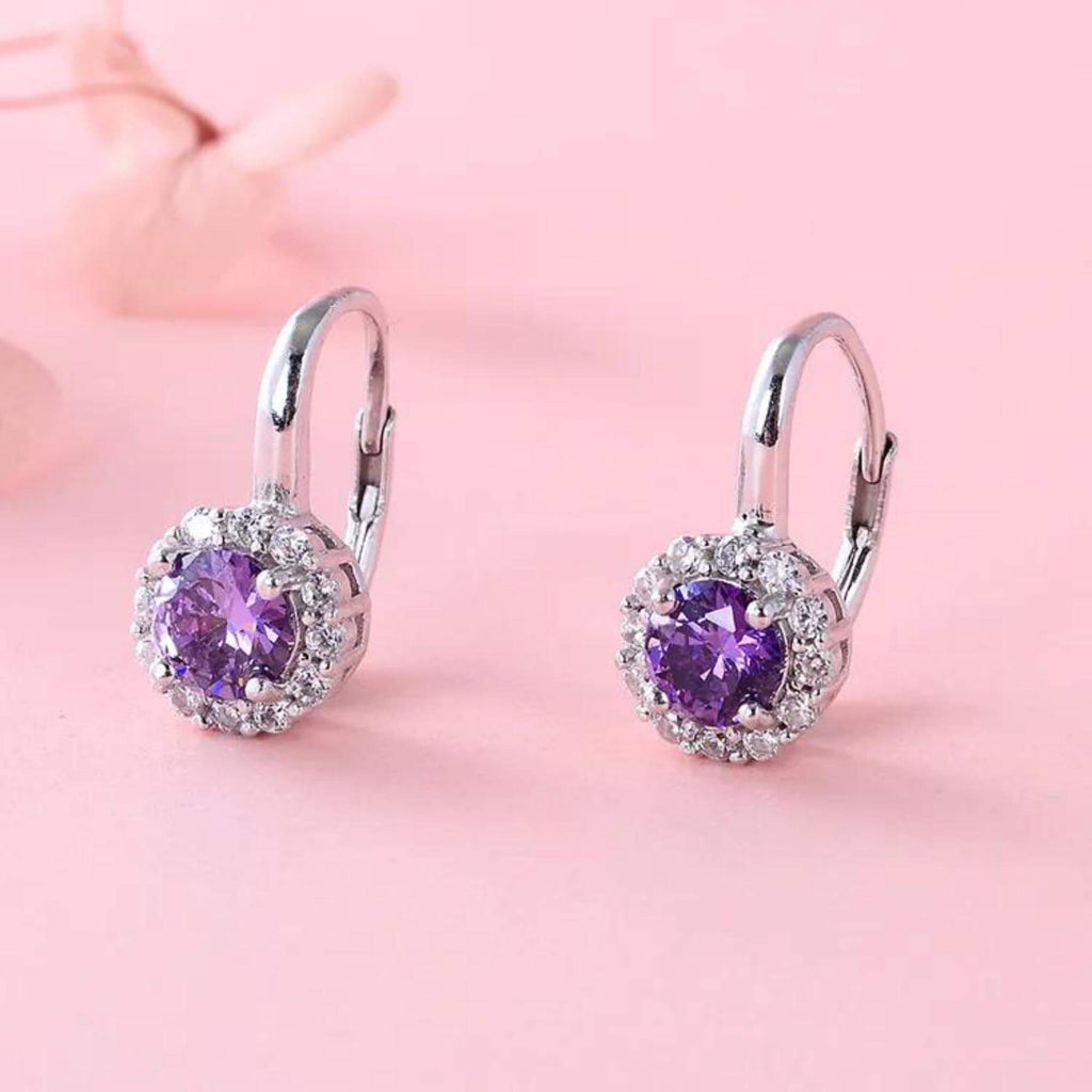 Silver earrings available in six different colors, each set with a single cubic zirconia stone. Choose from green, purple, pink, blue, silver, or red depending on your mood or outfit. A great way to bring in a pop of color without going over the top.