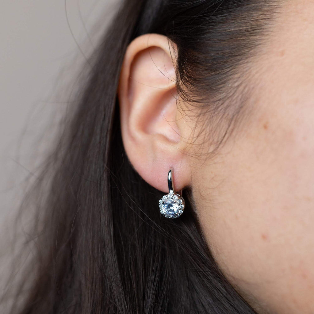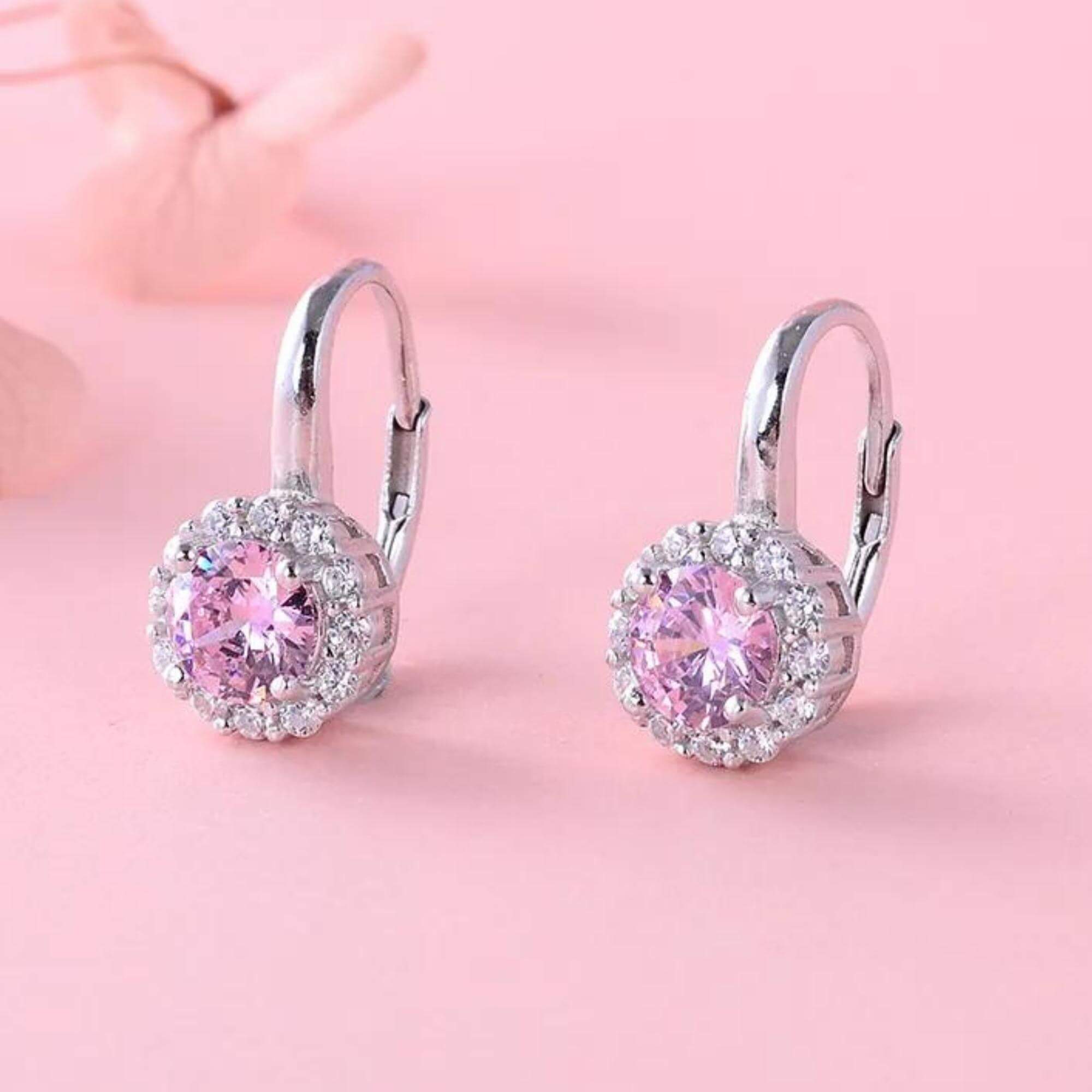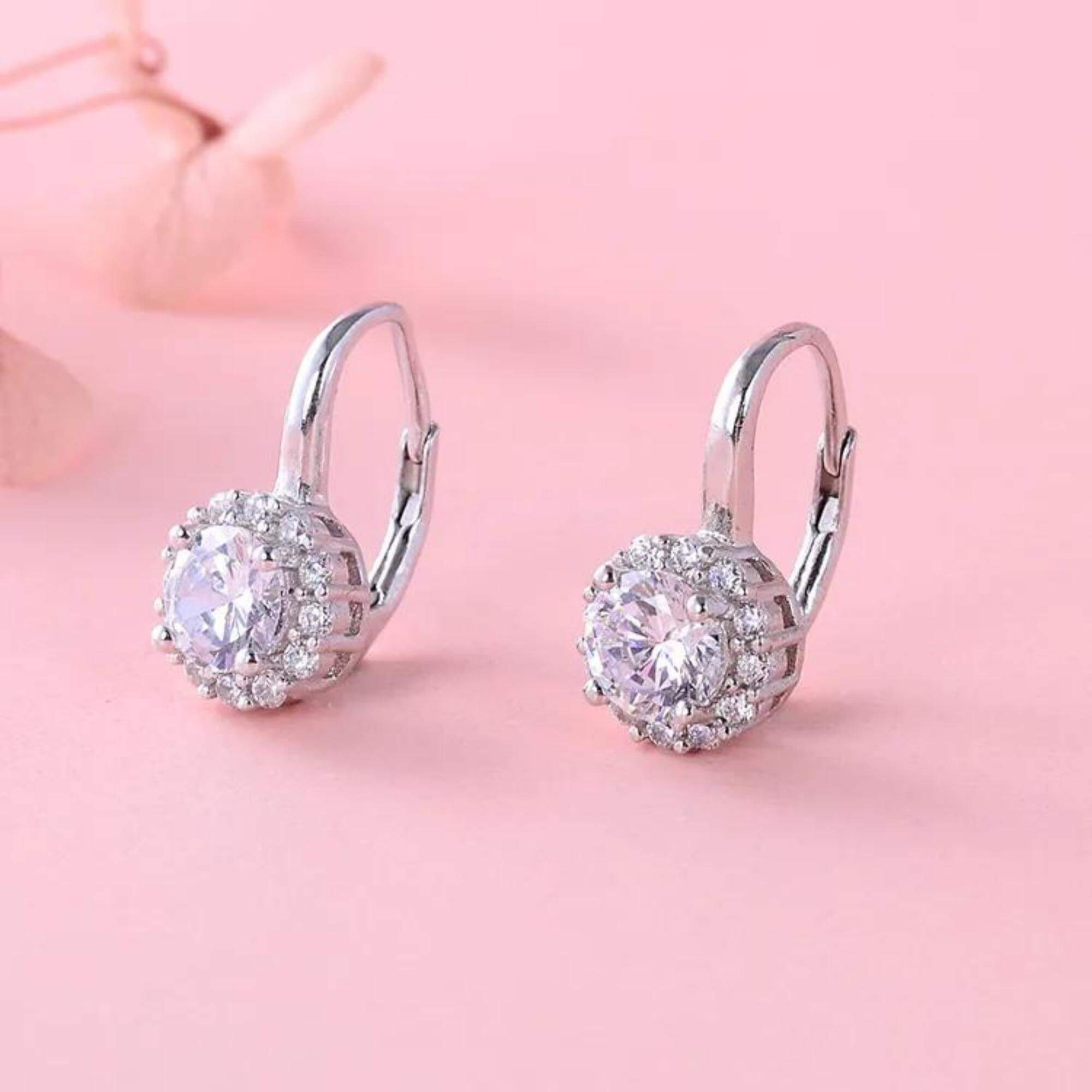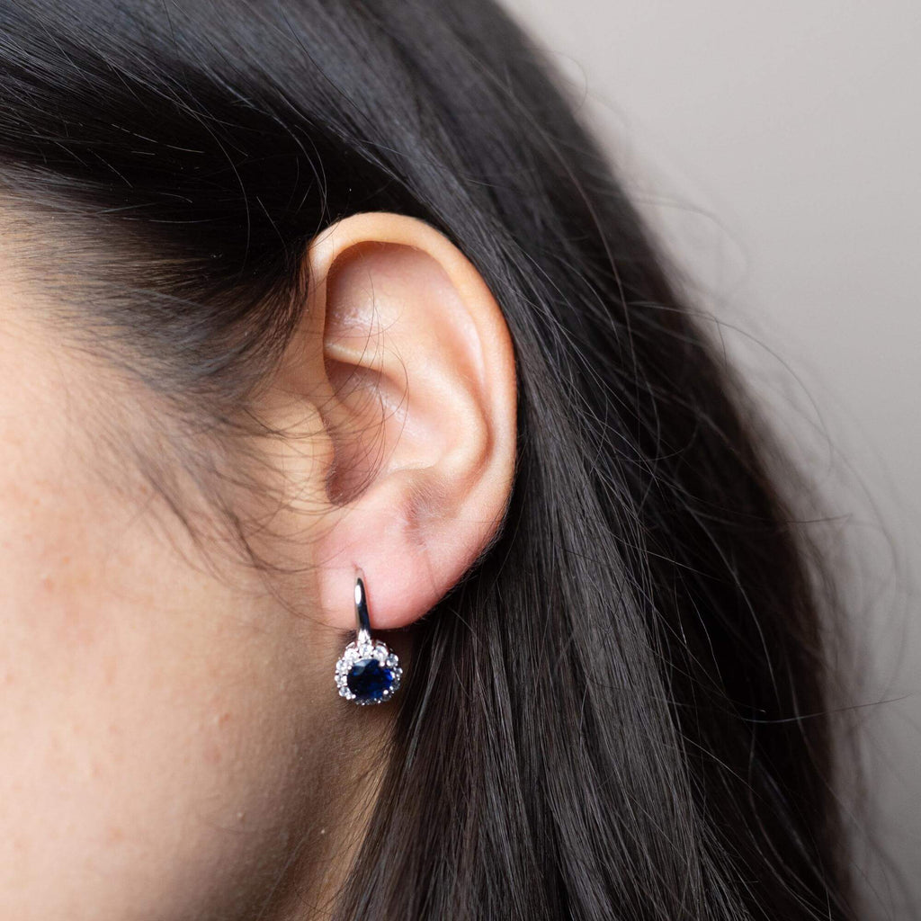 Silver earrings available in six different colors, each set with a single cubic zirconia stone. Choose from green, purple, pink, blue, silver, or red depending on your mood or outfit. A great way to bring in a pop of color without going over the top.