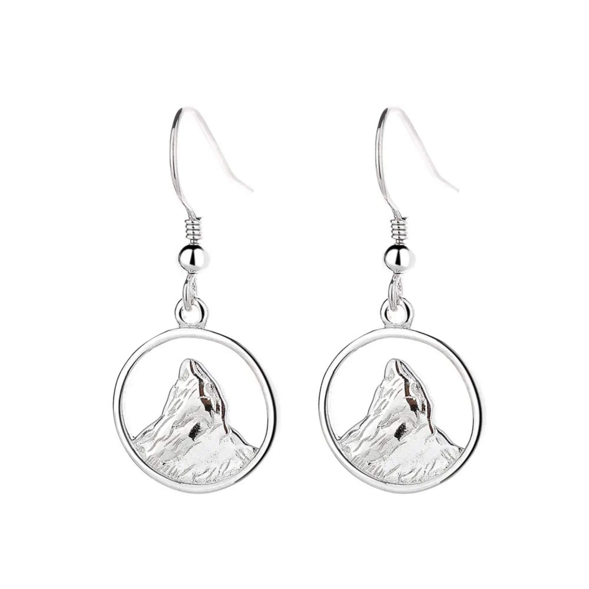 Silver earrings featuring a mountain silhouette framed in a circle. The design captures the quiet strength and beauty of nature, making them a thoughtful choice for those who feel connected to the outdoors.