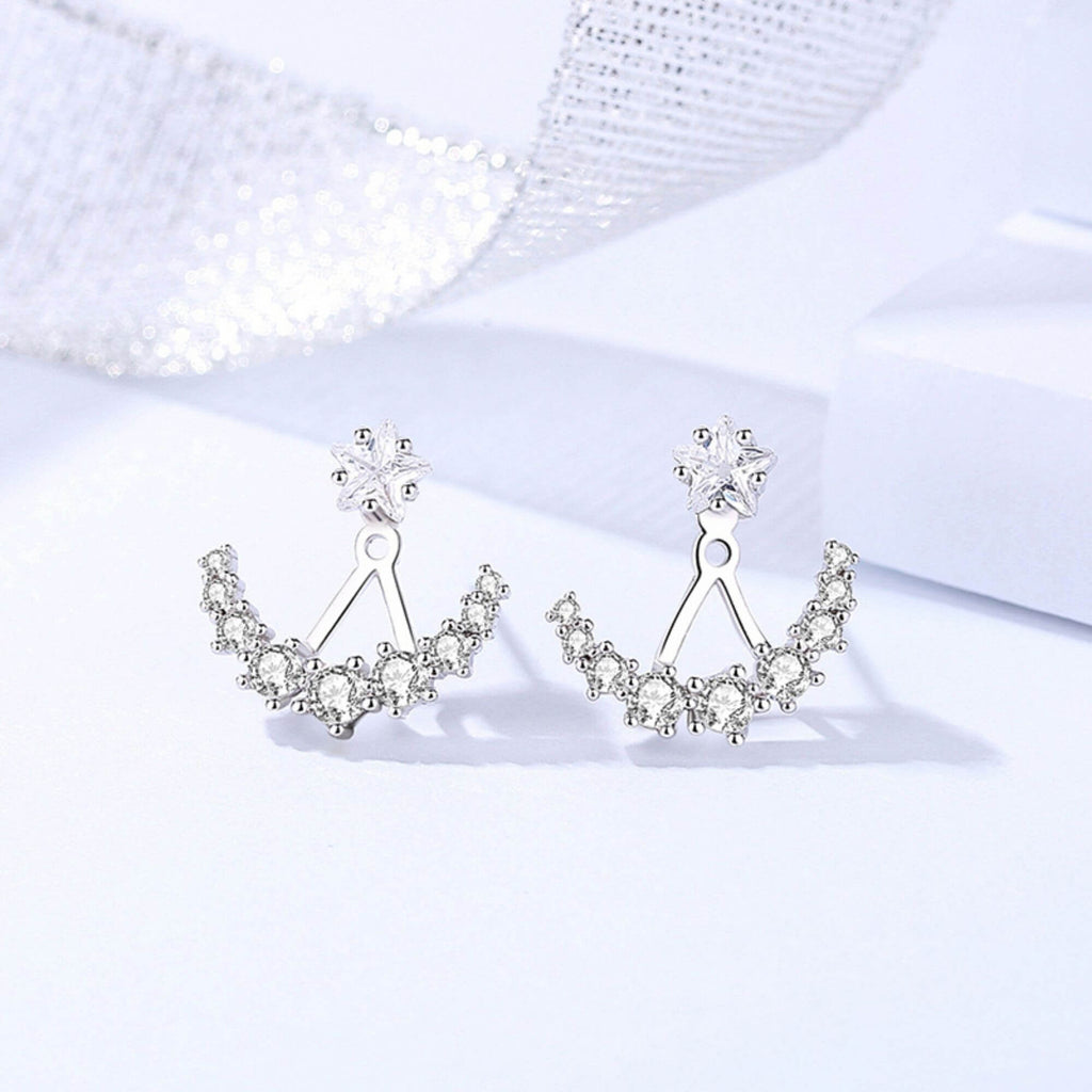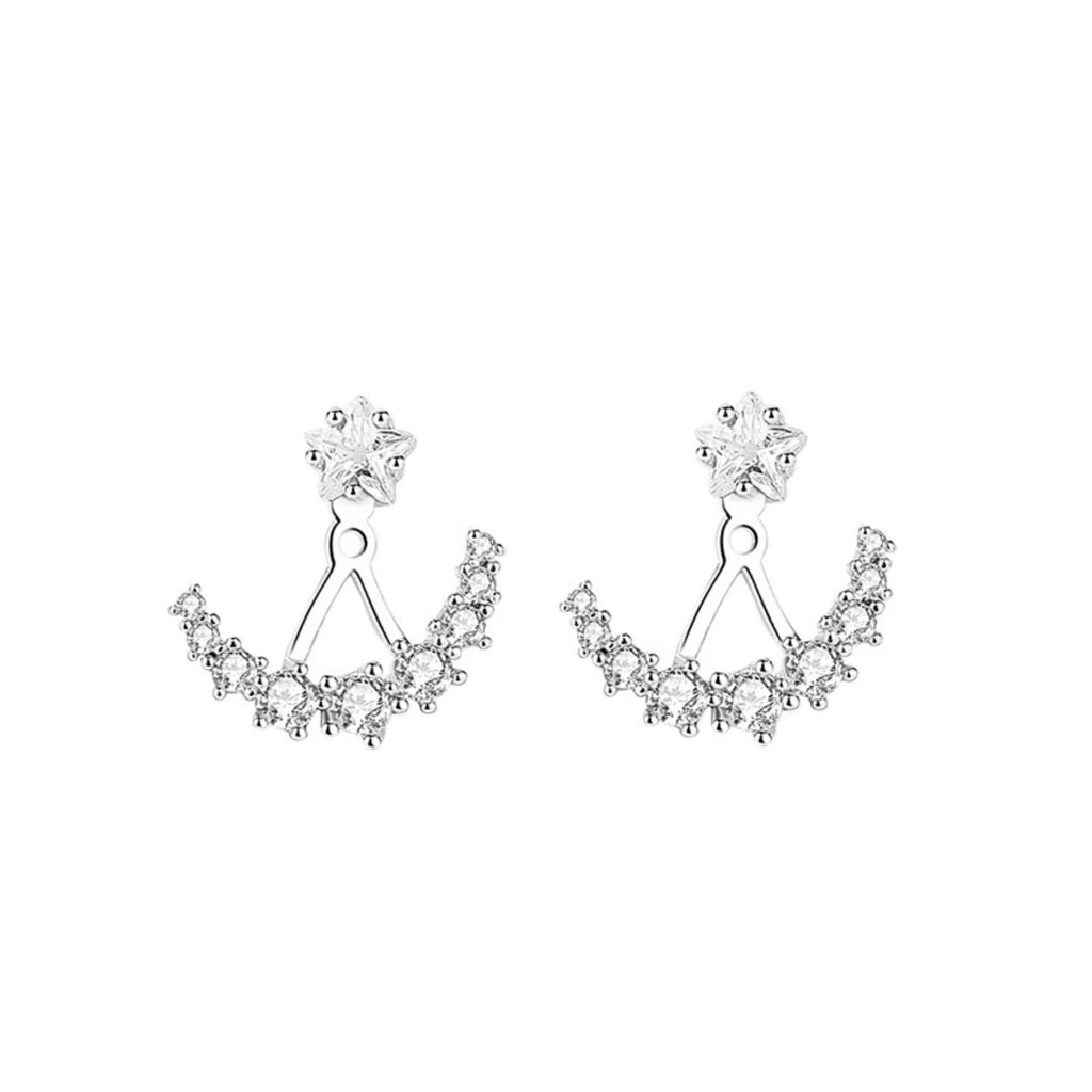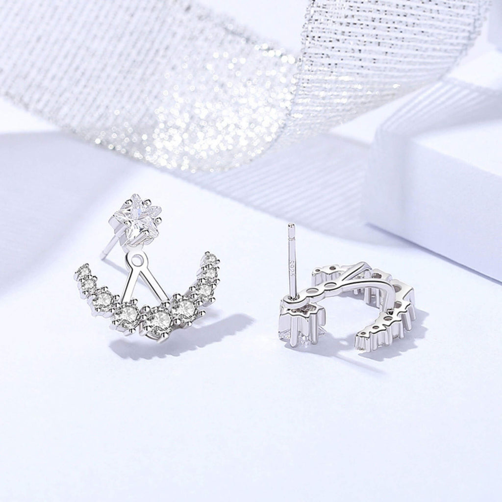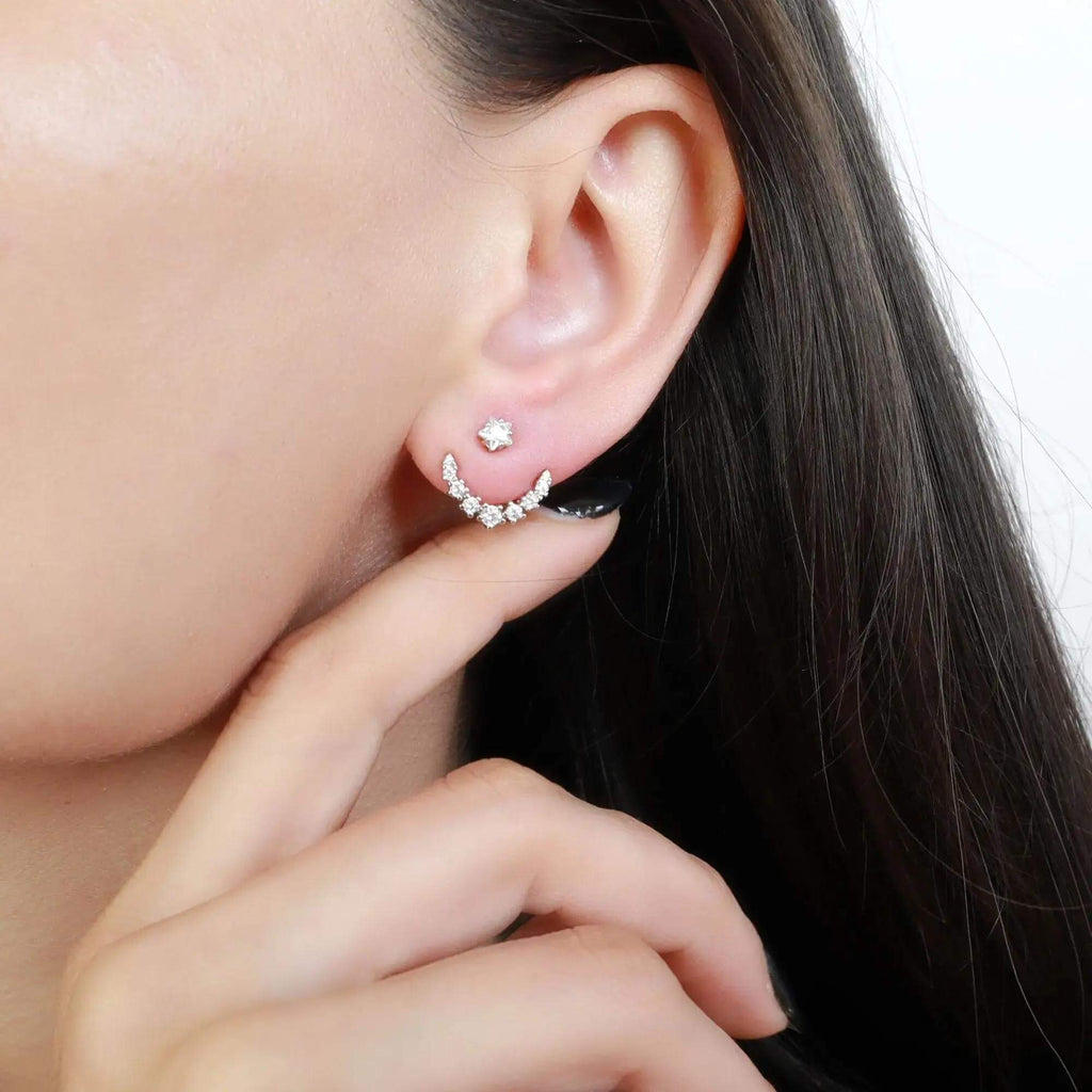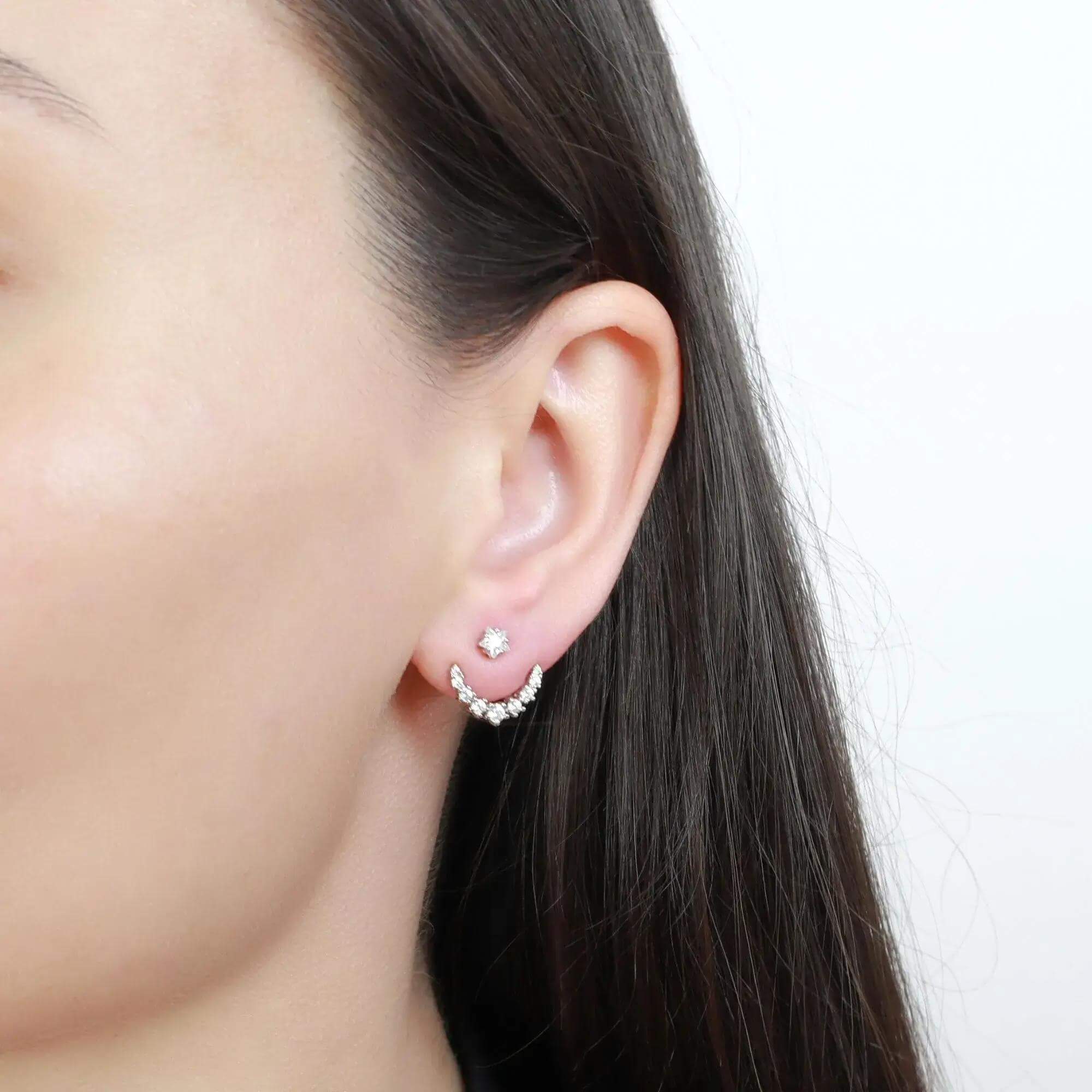 A curved pair of silver earrings that can be worn in different ways depending on the placement of your piercing. The design gently follows the line of the ear, offering a simple and well-fitted look with a modern edge.