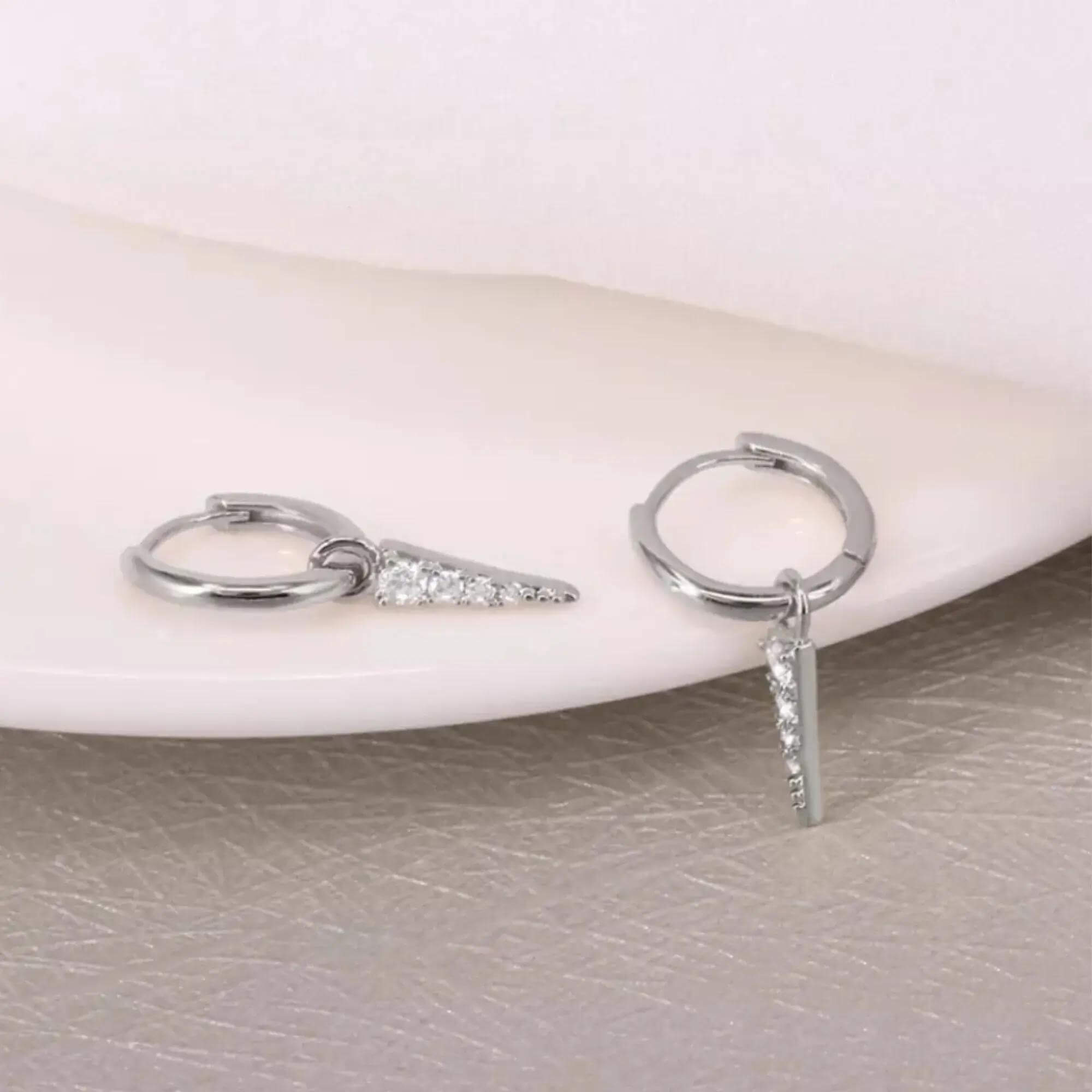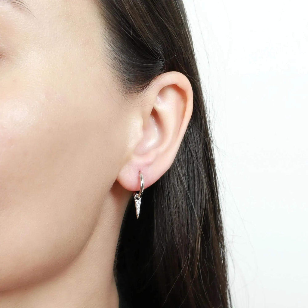 Delicate with a modern touch, these silver hoop earrings feature a small triangular pendant that drops just below the lobe. A fresh take on a timeless silhouette, perfect for adding contemporary design to your look.