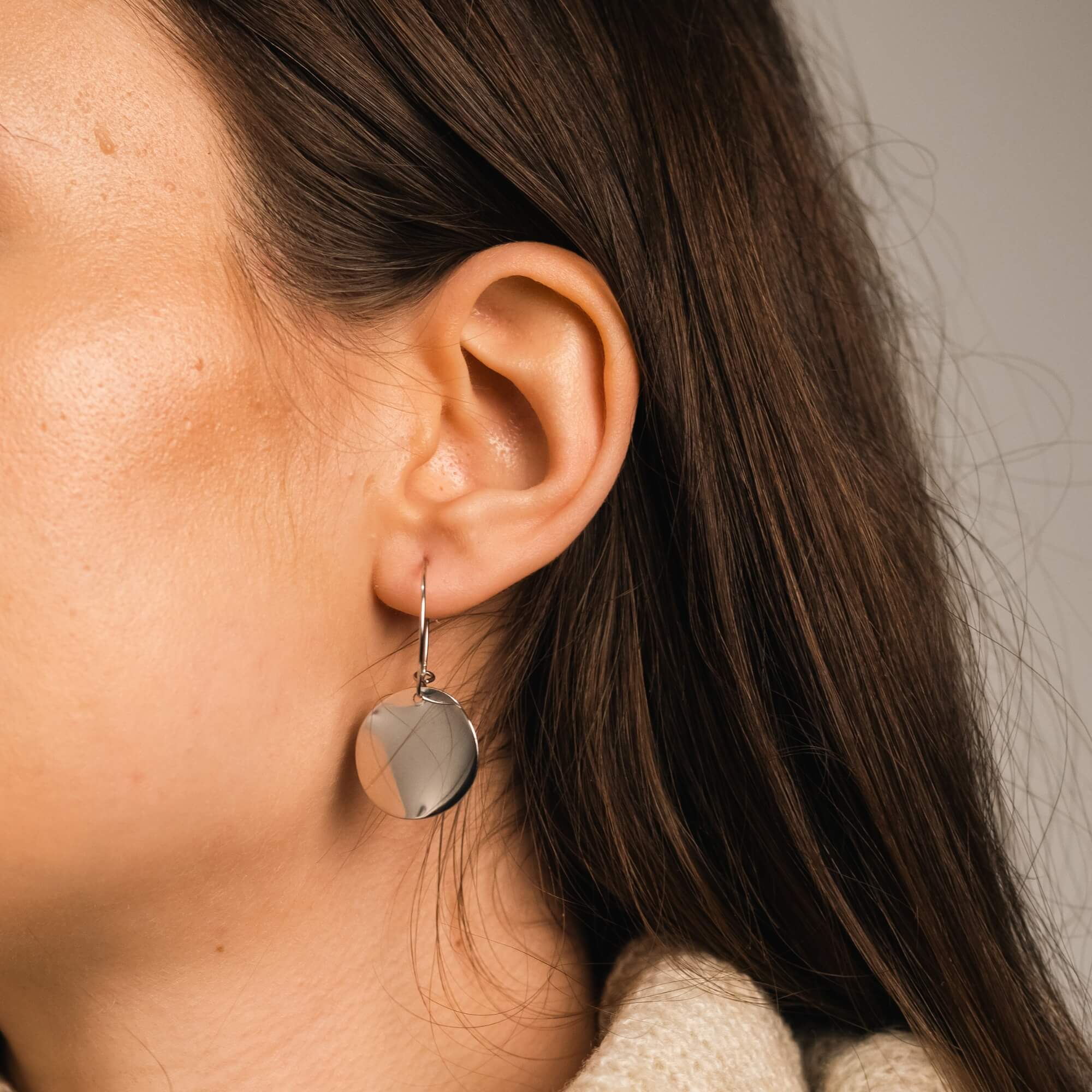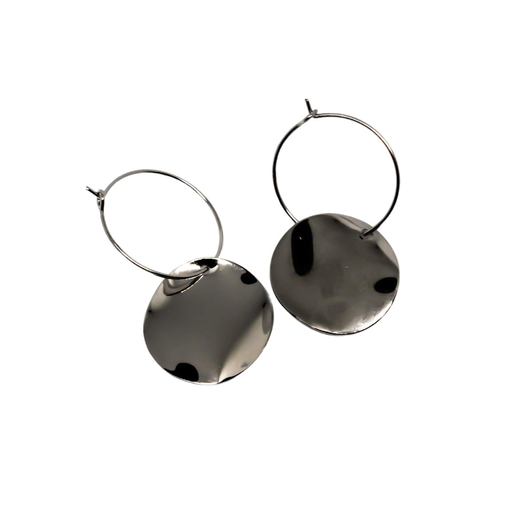 Silver hoop earrings with unique discs that have a soft, uneven surface catching light naturally. The organic shapes give them a relaxed feel, perfect for adding a subtle statement to everyday looks. A versatile pair that stands for modern simplicity.