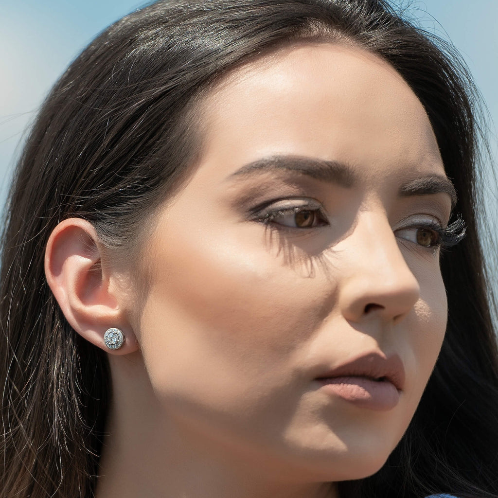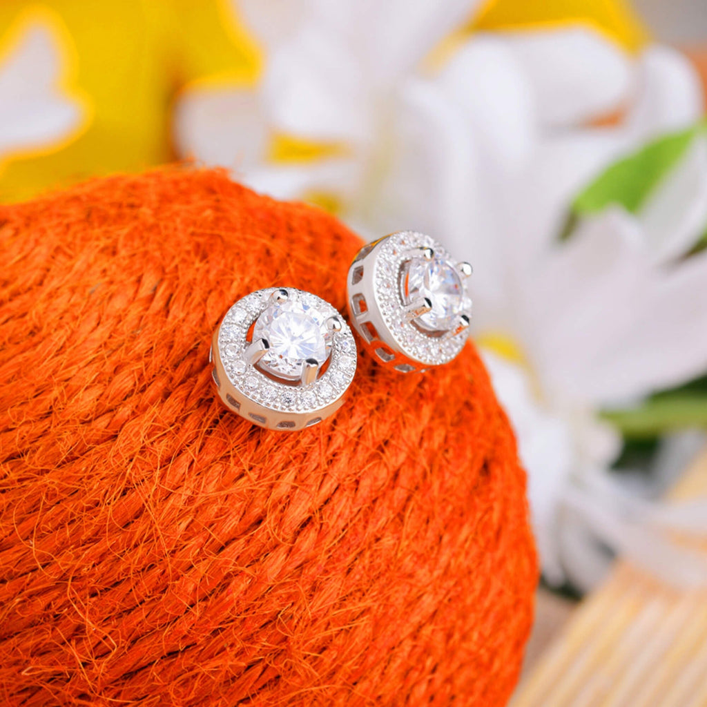 Silver earrings featuring a large cubic zirconia at the center, framed by a clean border of smaller gemstones. The sparkle is bold but not overdone, making them a great choice when you want a dainty finish without too much fuss.