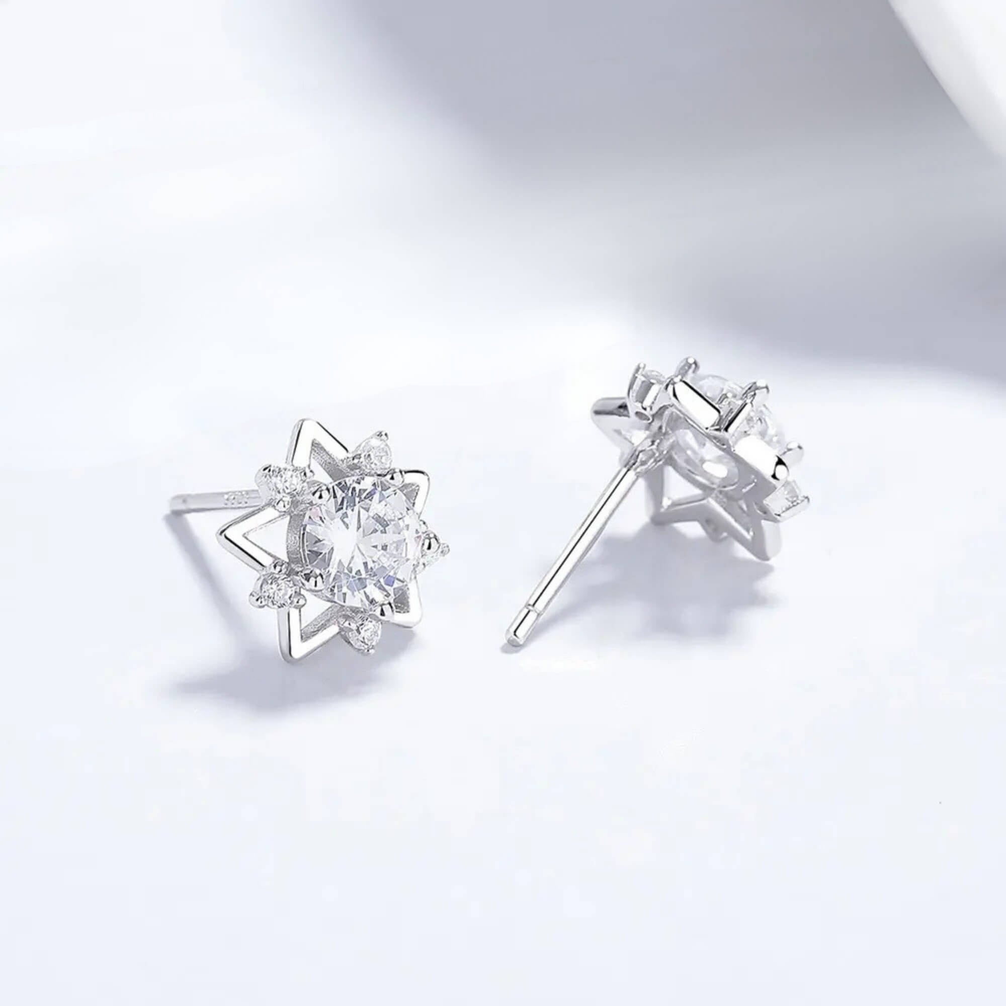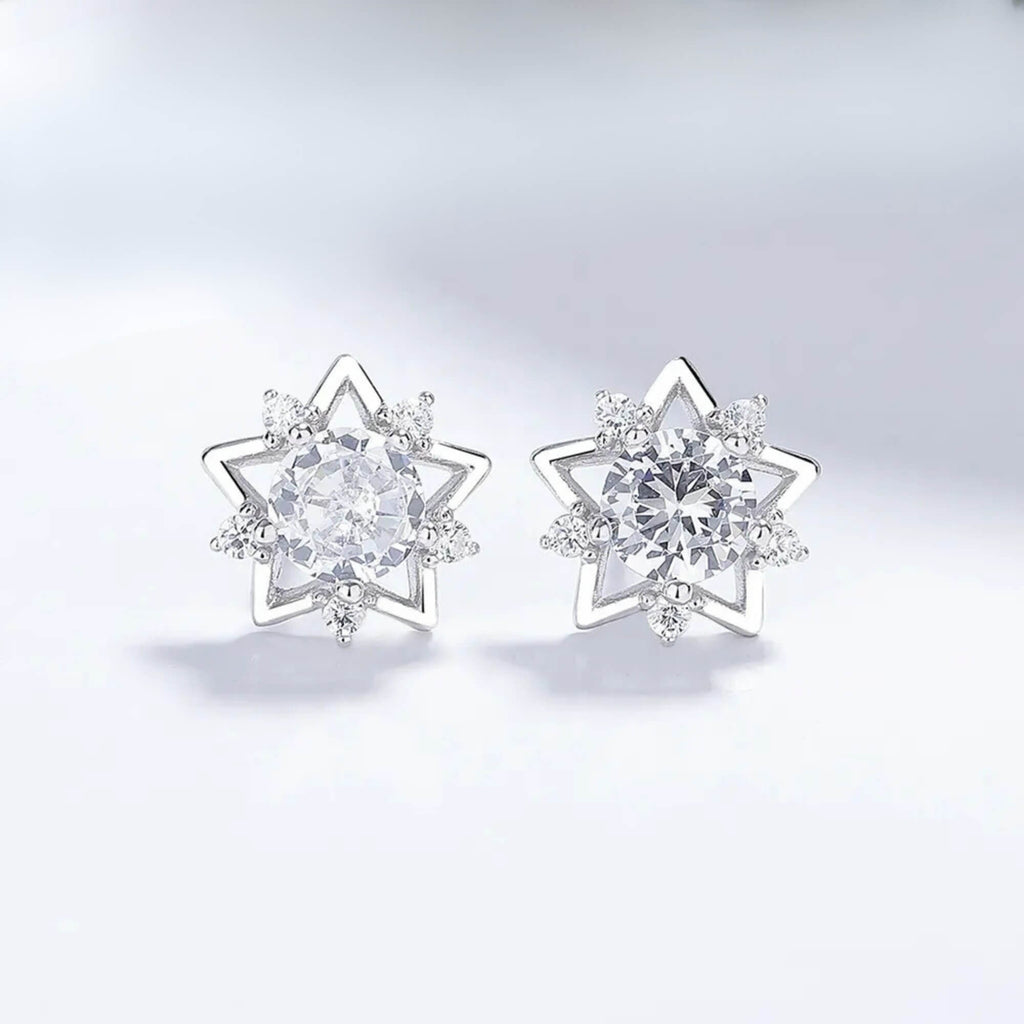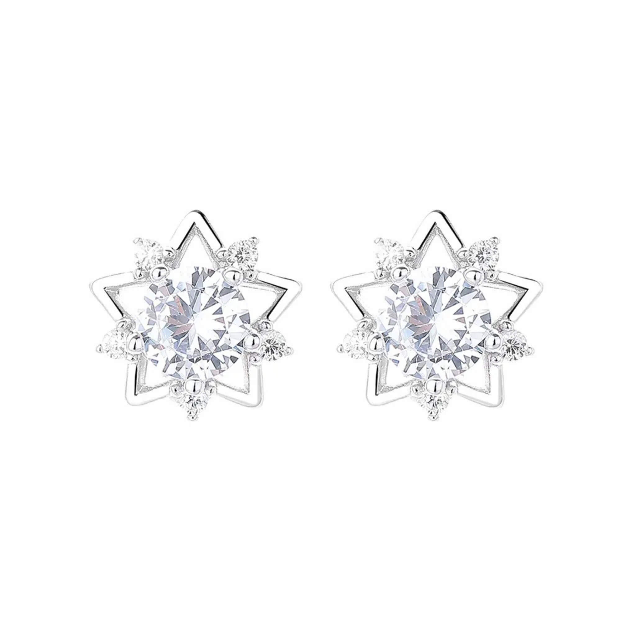 Silver stud earrings shaped like stars, centered with a brilliant round cubic zirconia and framed by five smaller stones. The geometric outline keeps the look sharp, while the gems brings just the right amount of sparkle.