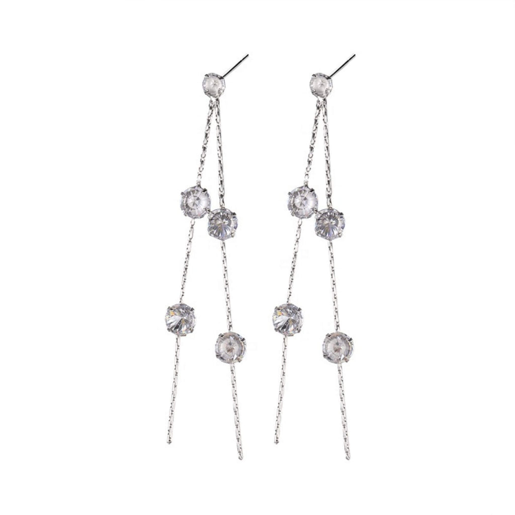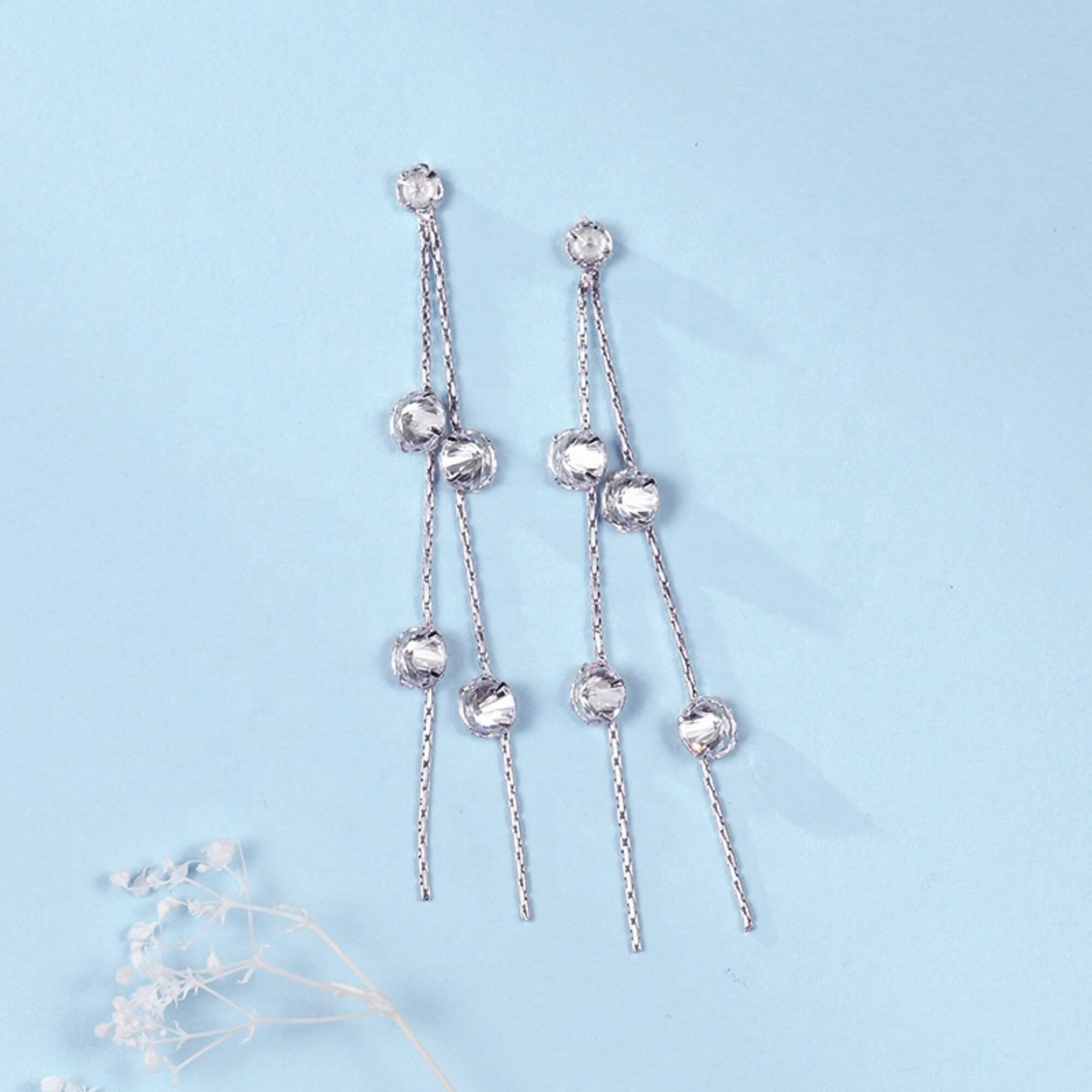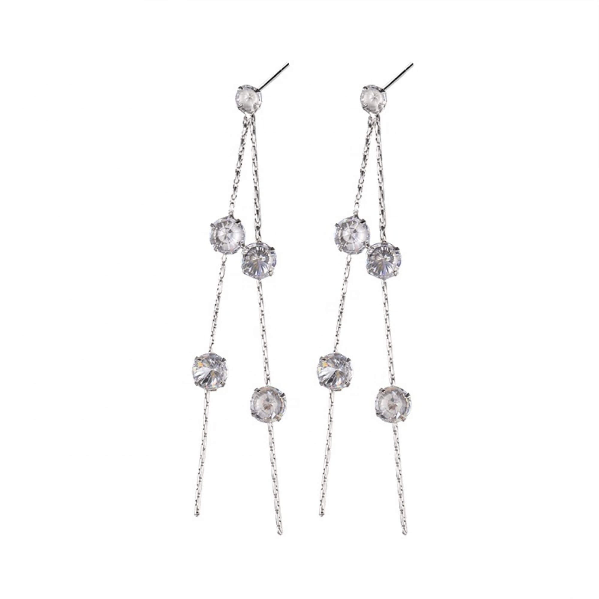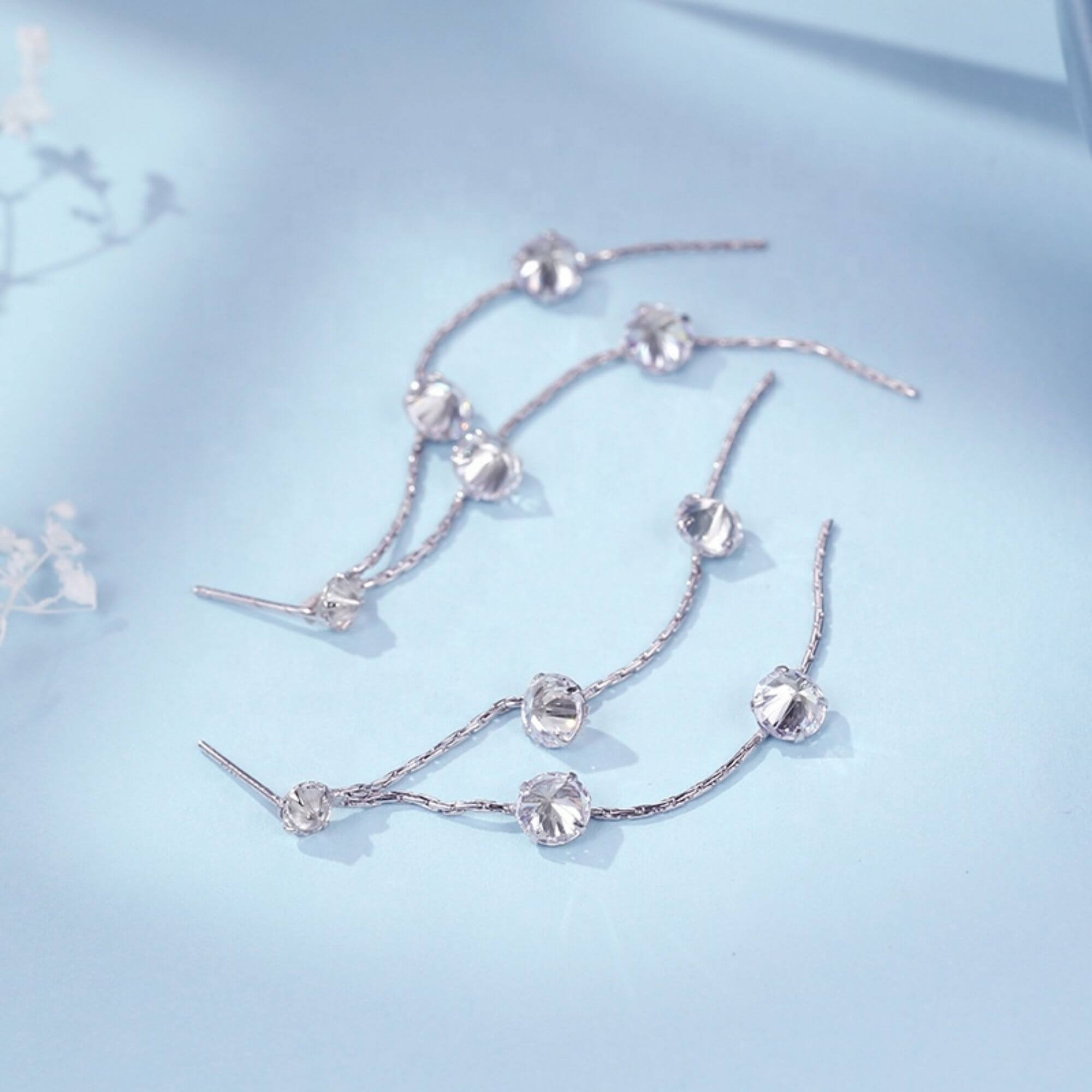 Silver earrings with a 6.5 cm drop, accented by ten tiny zirconia stones spaced along the length. Elegant and lightweight, they sway gently as you move, adding just the right amount of sparkle for both everyday wear and special plans.
