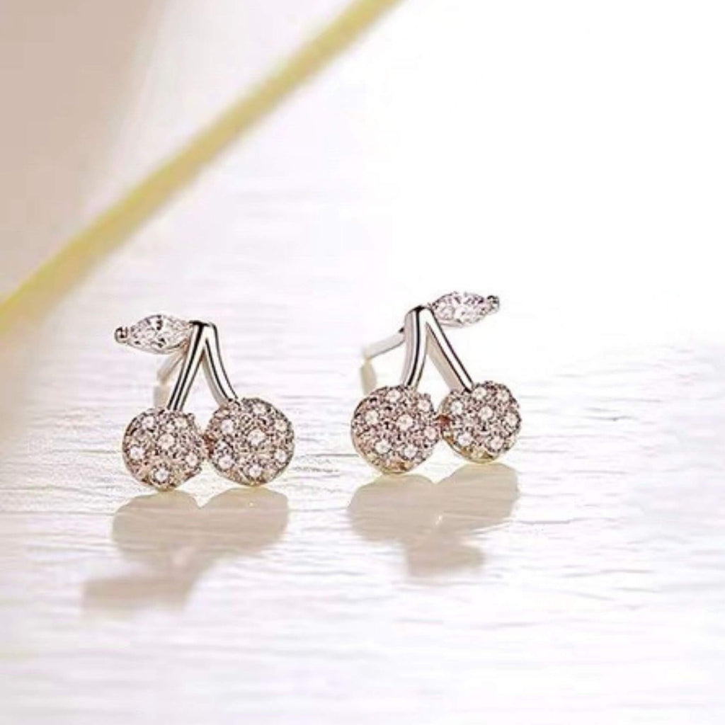 Silver earrings in the shape of sweet cherries, detailed with delicate cubic zirconia for a touch of light-catching sparkle. A playful design that brings a sense of joy and a fresh, uplifting feel.
