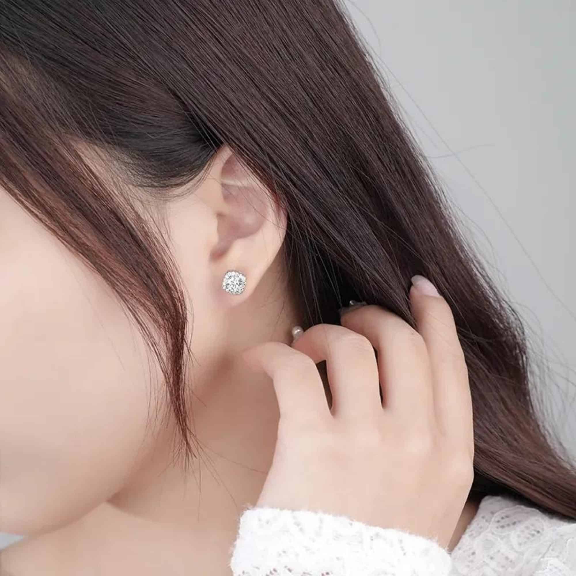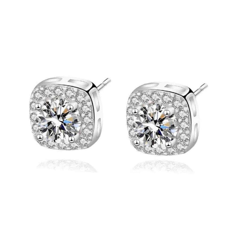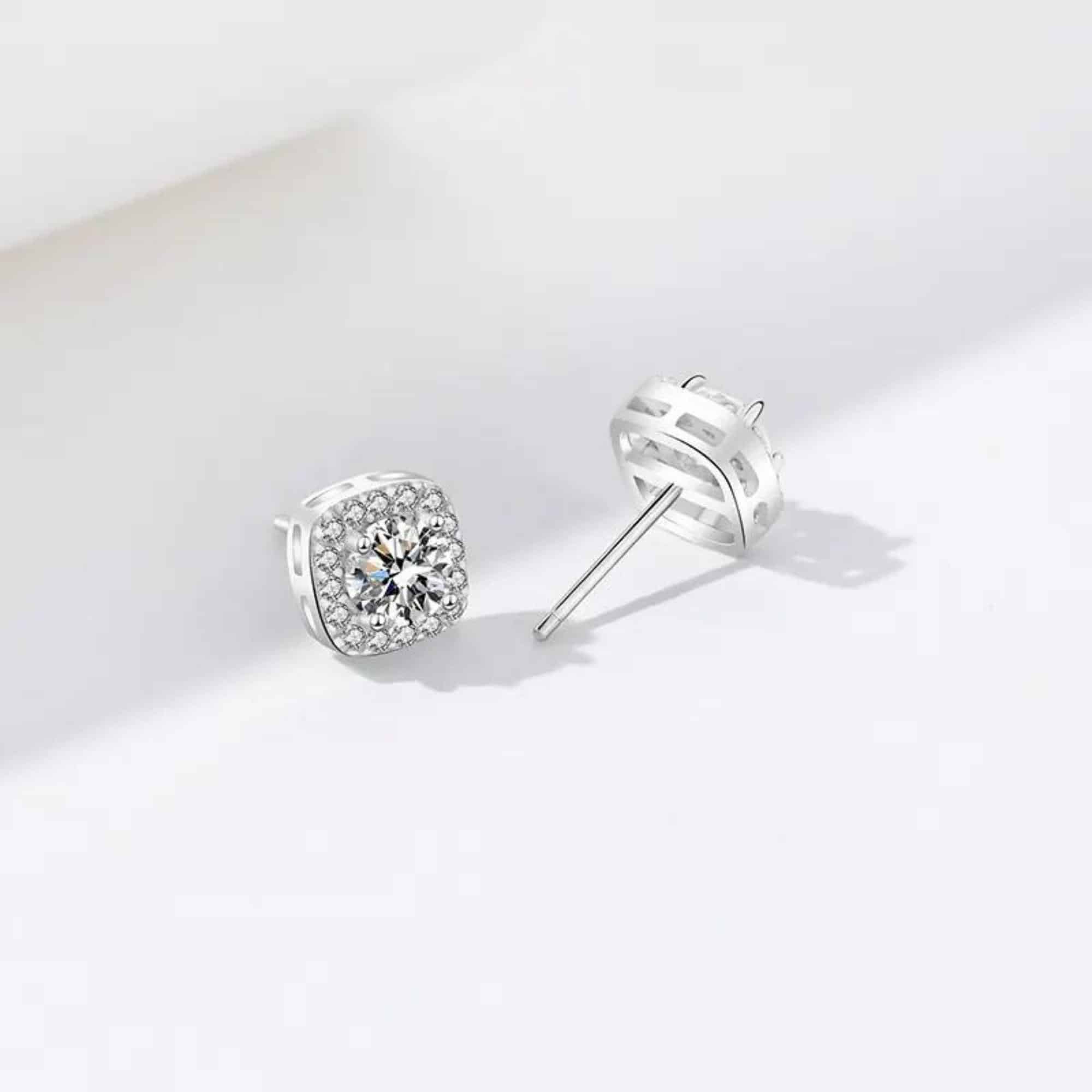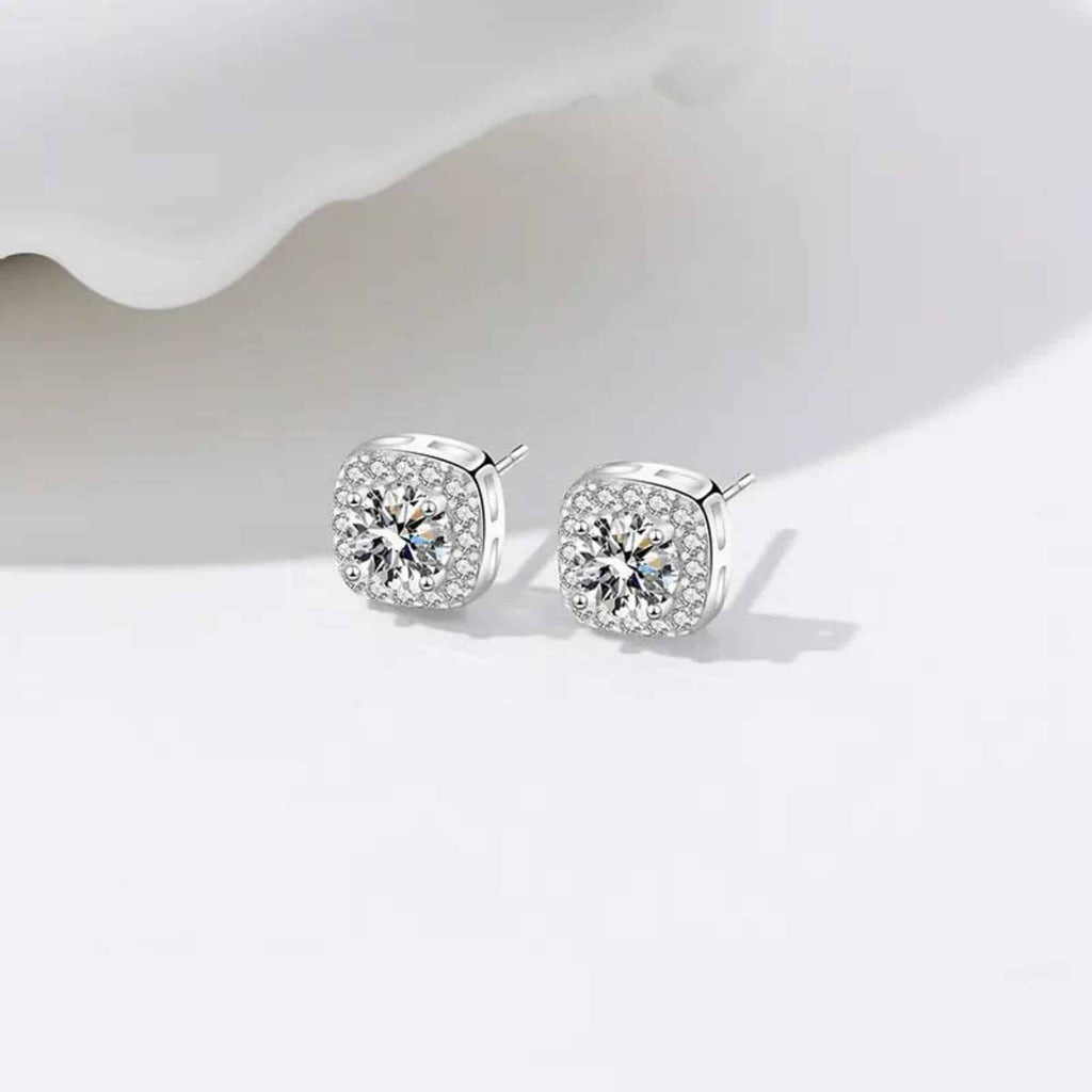 Silver stud earrings featuring a round moissanite gemstone framed by a halo of cubic zirconia. The balanced sparkle and classic shape make them a great fit for both everyday wear and formal moments.