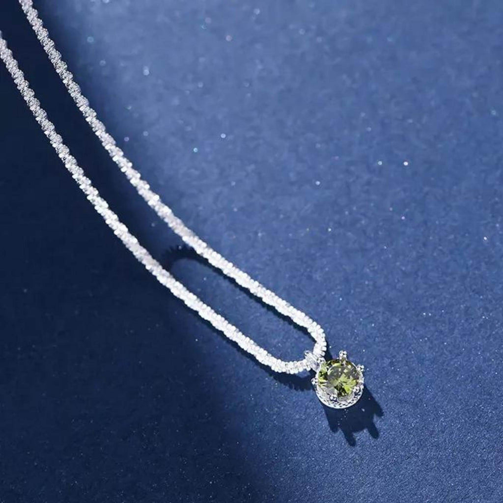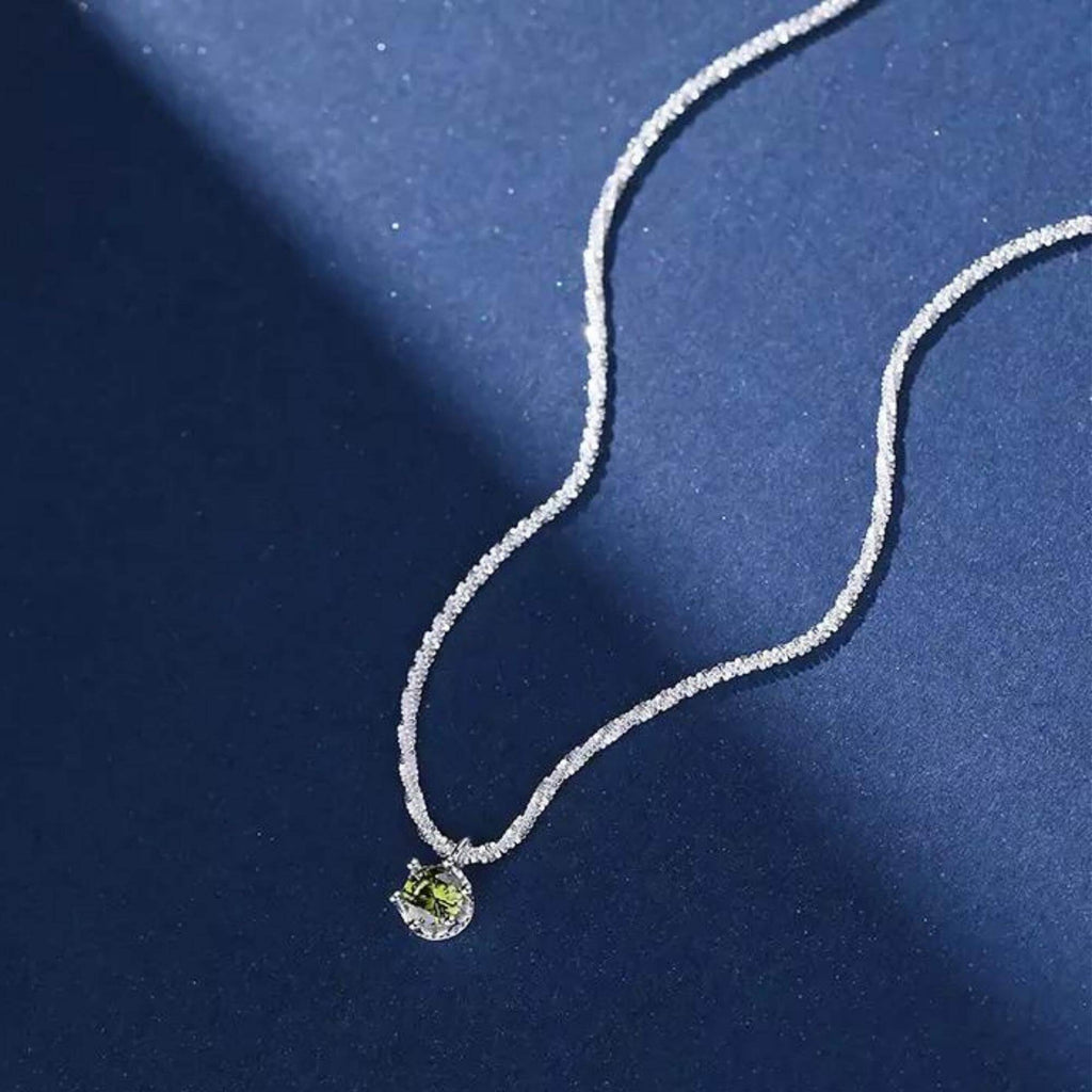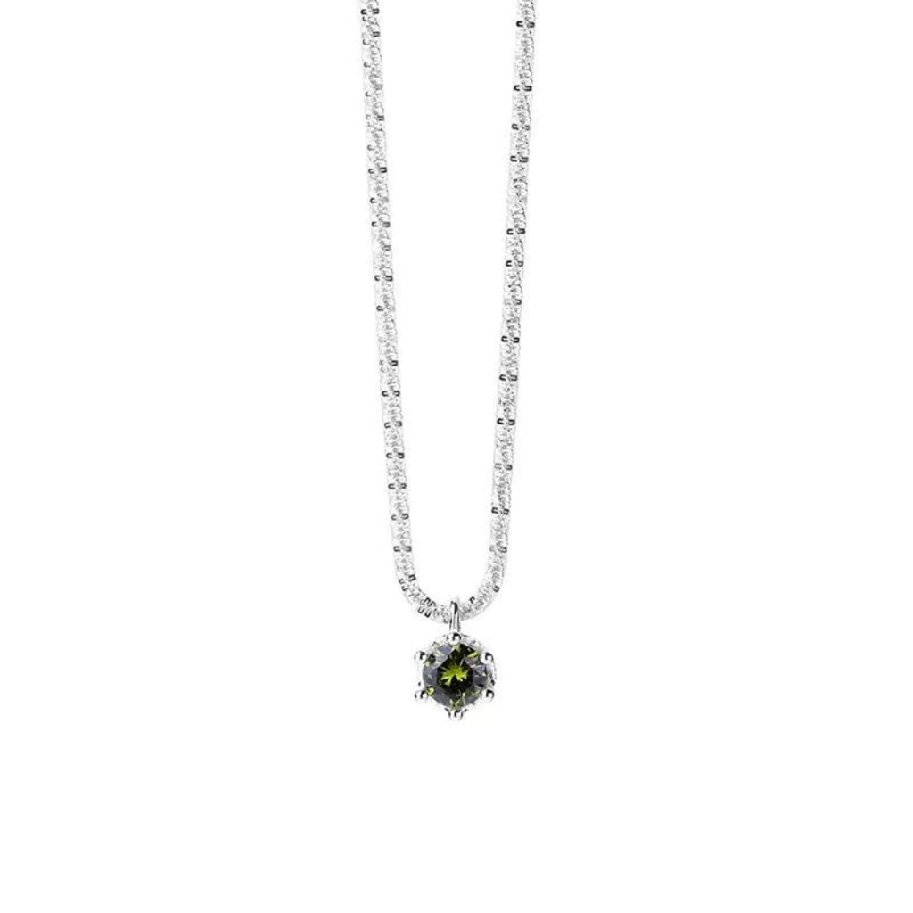 Silver necklace with a fine chain and a round pendant set with a deep green cubic zirconia in a prong setting. The rich color stands out against the bright silver, keeping the focus on the stone. Easy to wear on its own as a focal point or layered with a shorter chain for added detail.