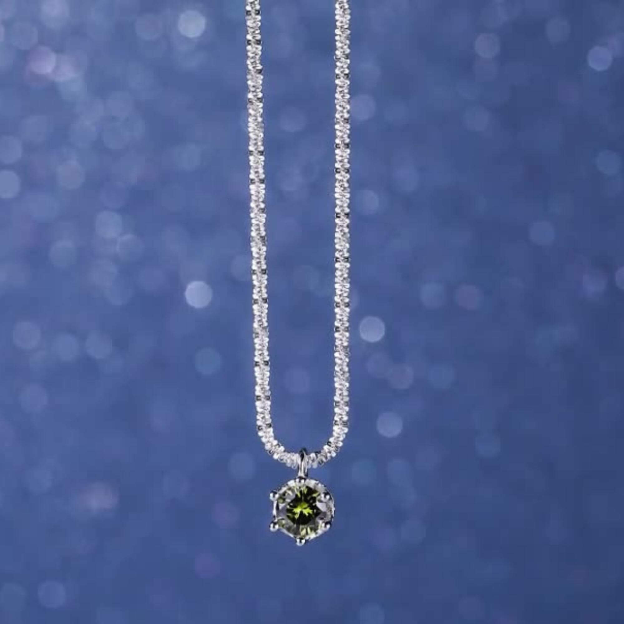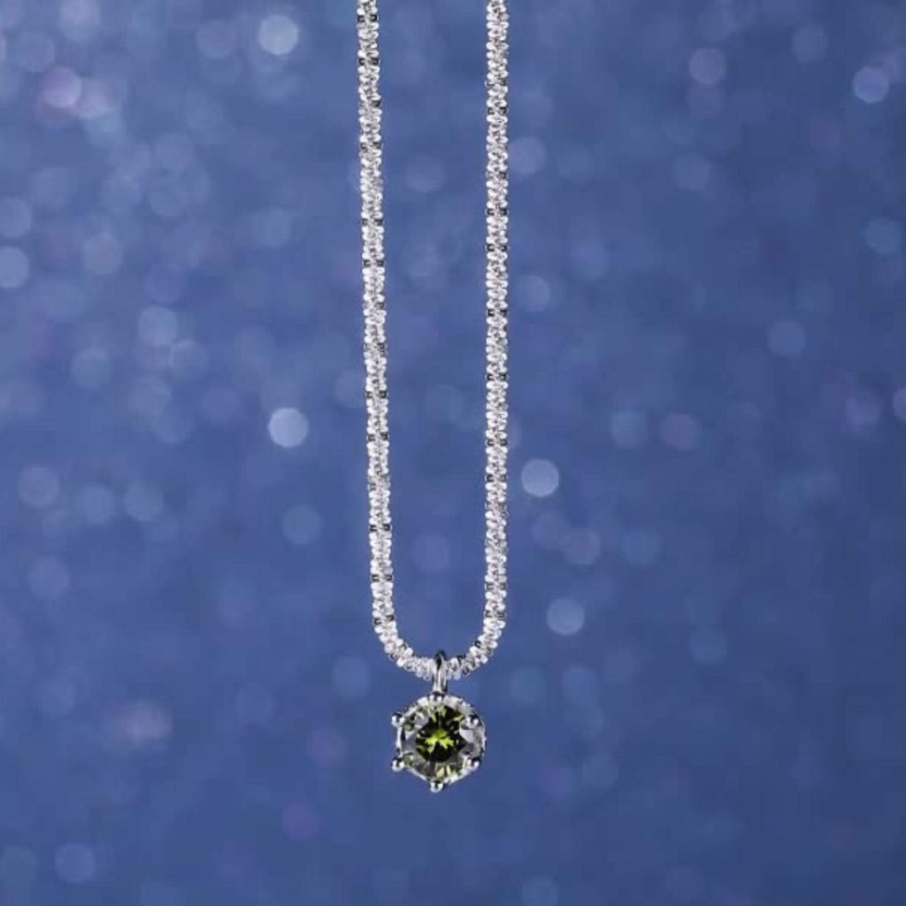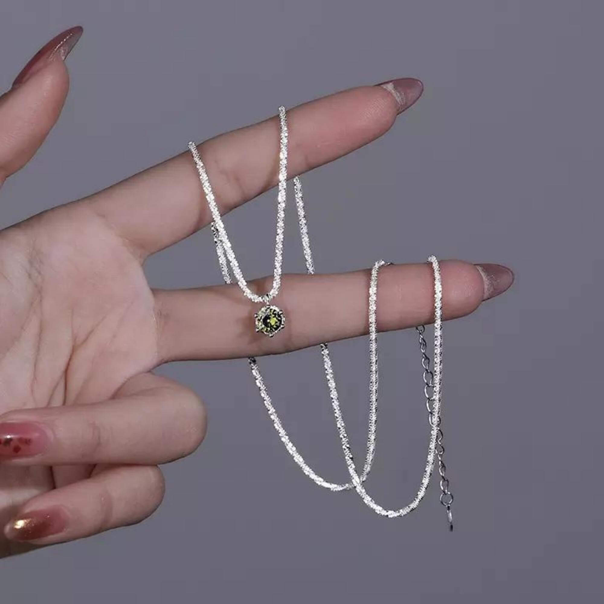 Silver necklace with a fine chain and a round pendant set with a deep green cubic zirconia in a prong setting. The rich color stands out against the bright silver, keeping the focus on the stone. Easy to wear on its own as a focal point or layered with a shorter chain for added detail.