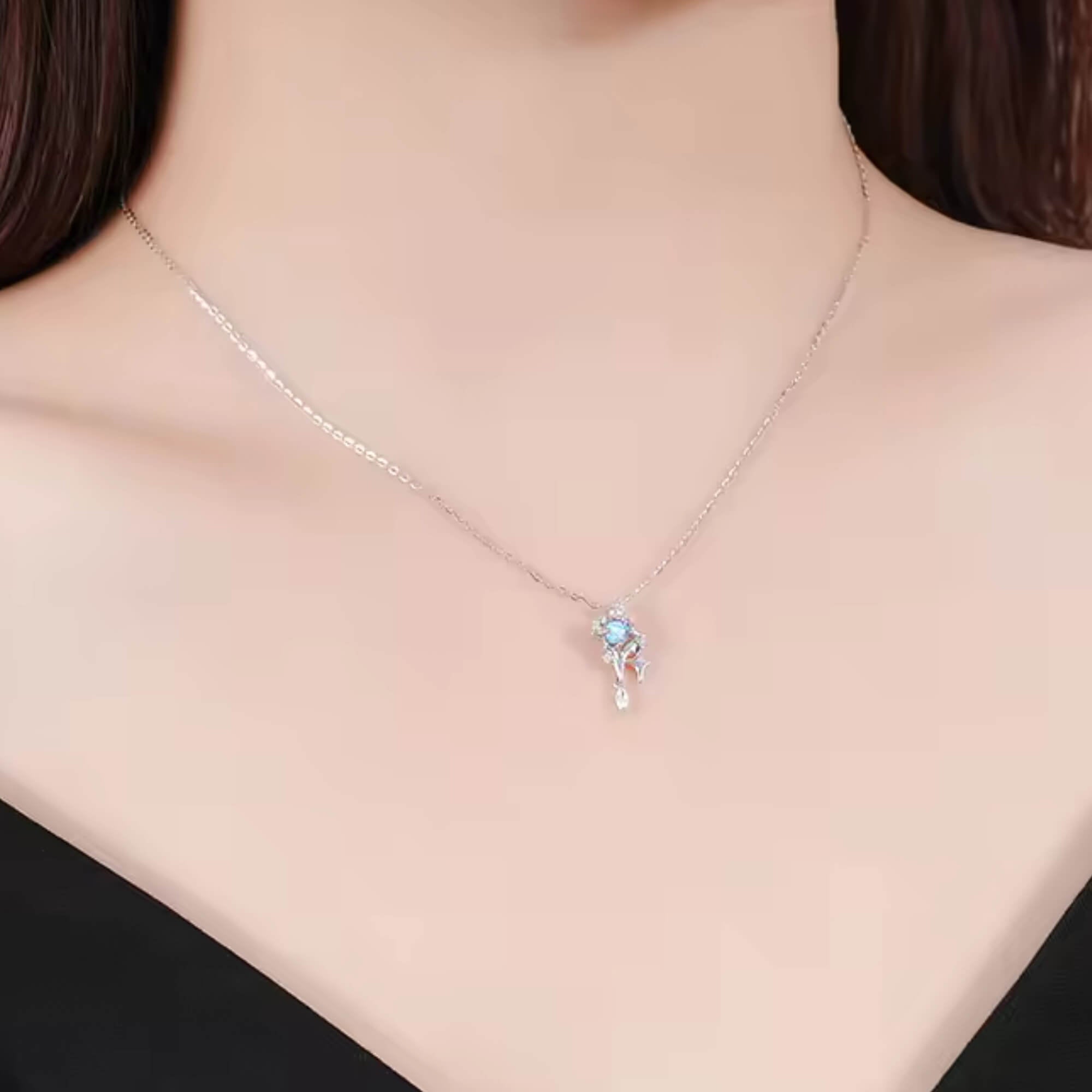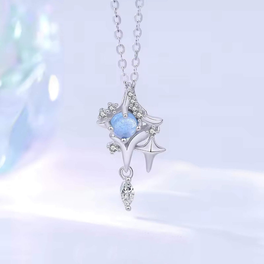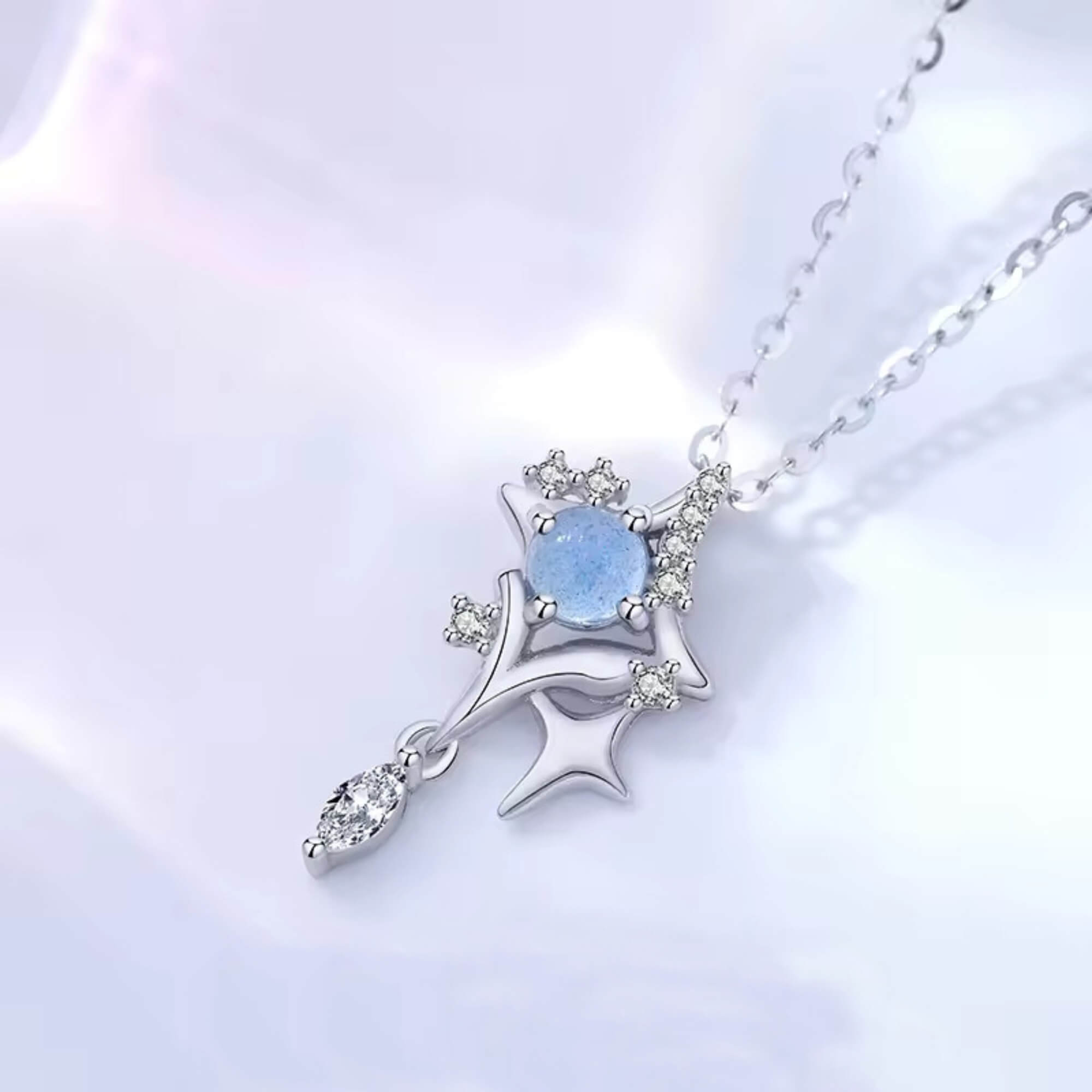 Sterling silver necklace with a celestial-inspired design, centered around a soft sky-blue crystal. Star-like shapes accented with cubic zirconia surround the gemstone, while a teardrop-shaped detail hangs below, enhancing the design’s delicate and mesmerizing look.