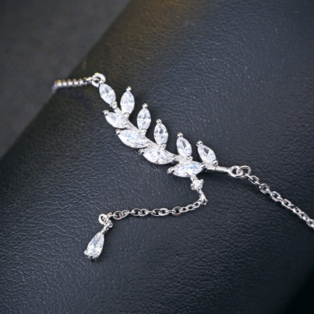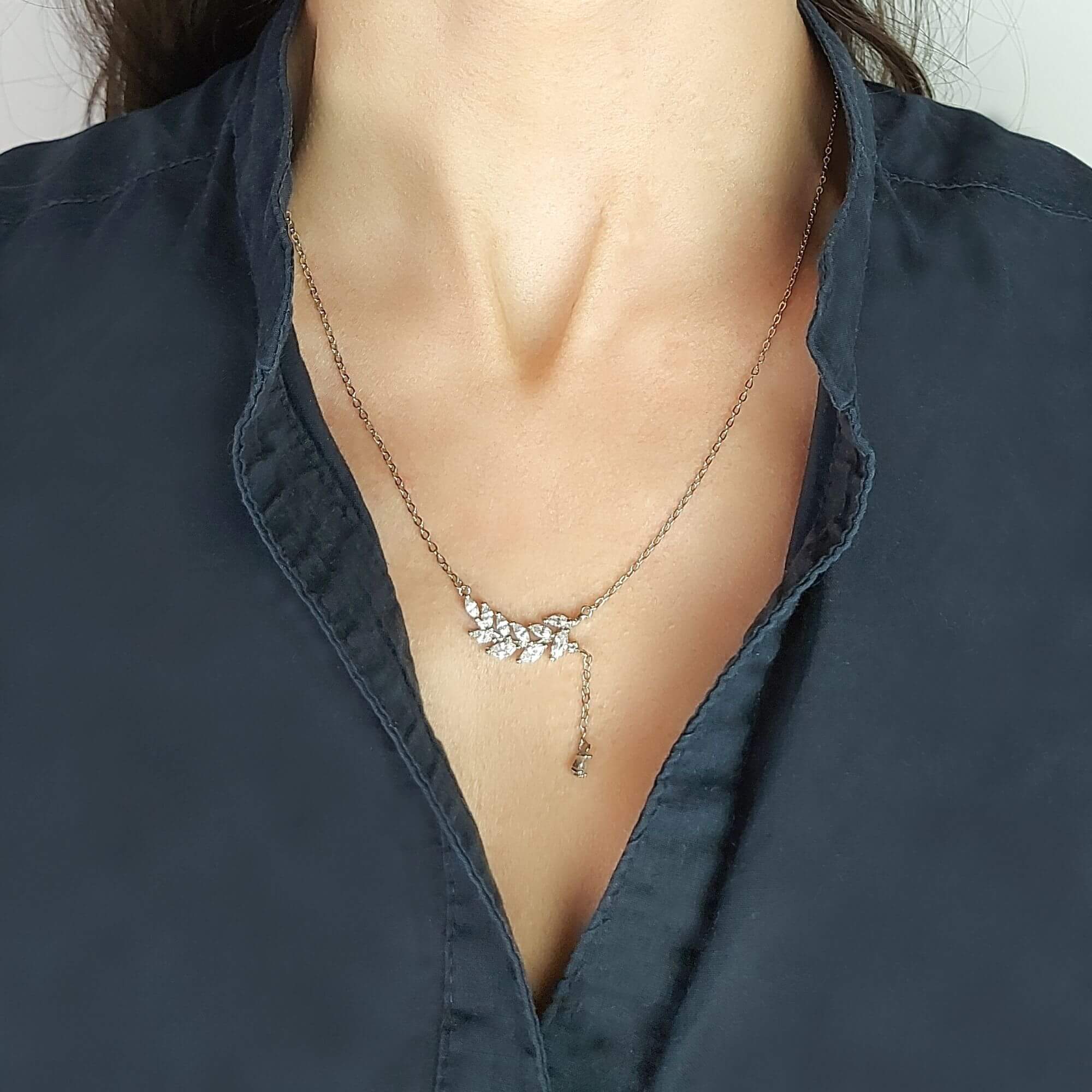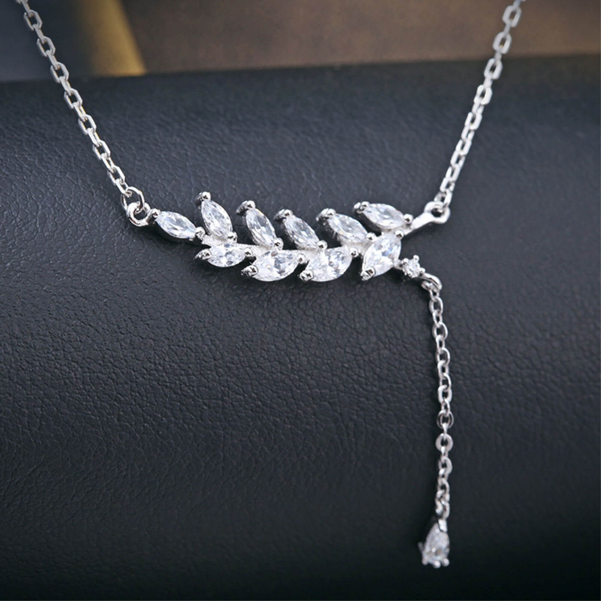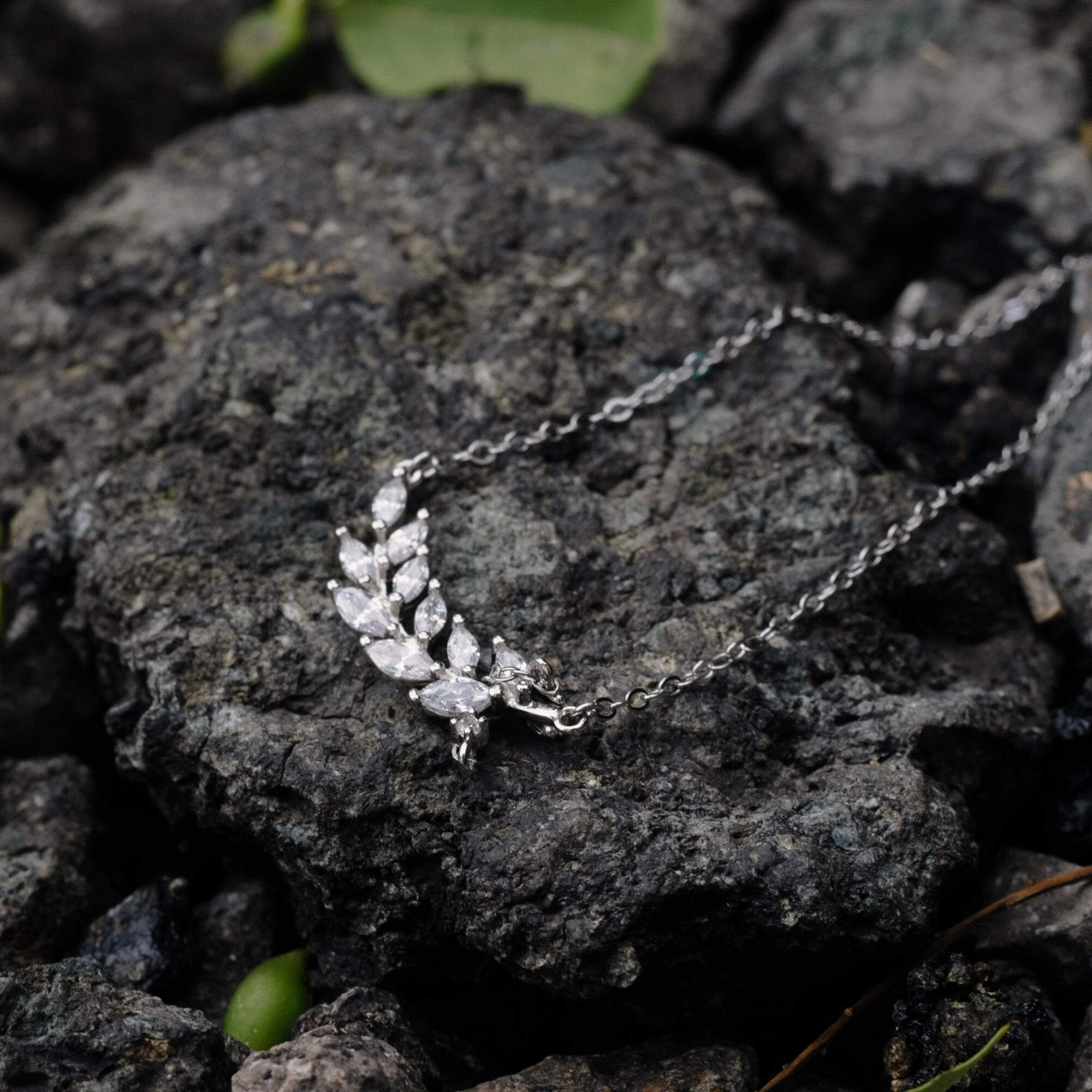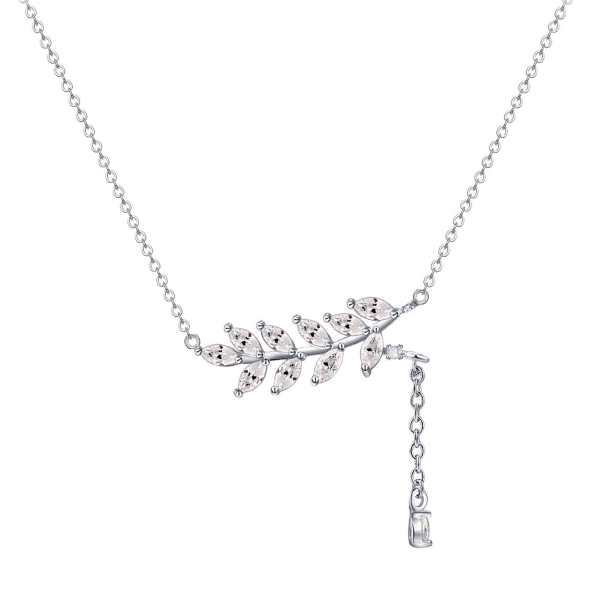 Silver necklace featuring a branch-shaped pendant with leaves detailed in small cubic zirconia. A short chain drop extends from one side of the branch, adding an extra decorative element. The detailed leaf design gives the piece a fresh, organic look that stands out while remaining easy to style.