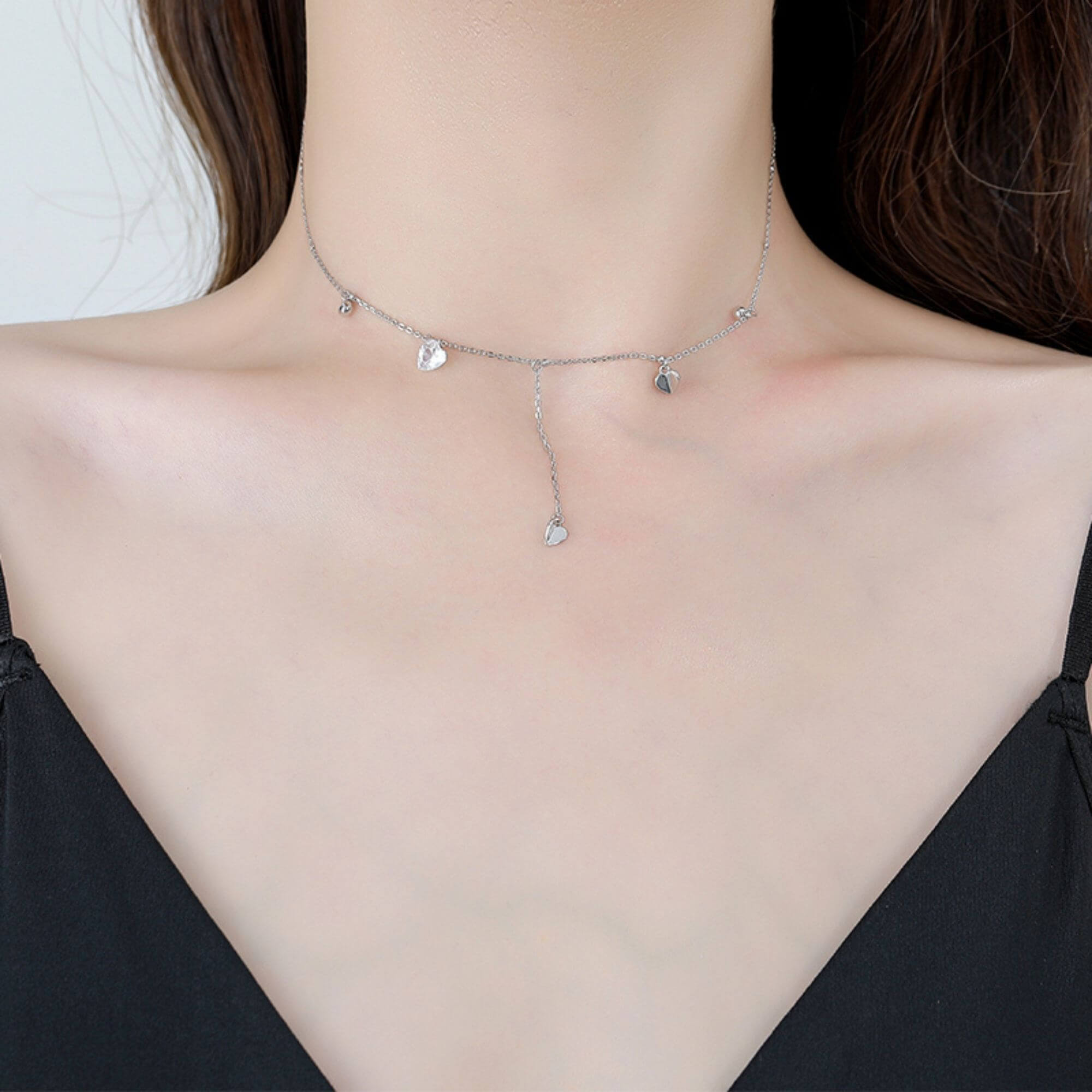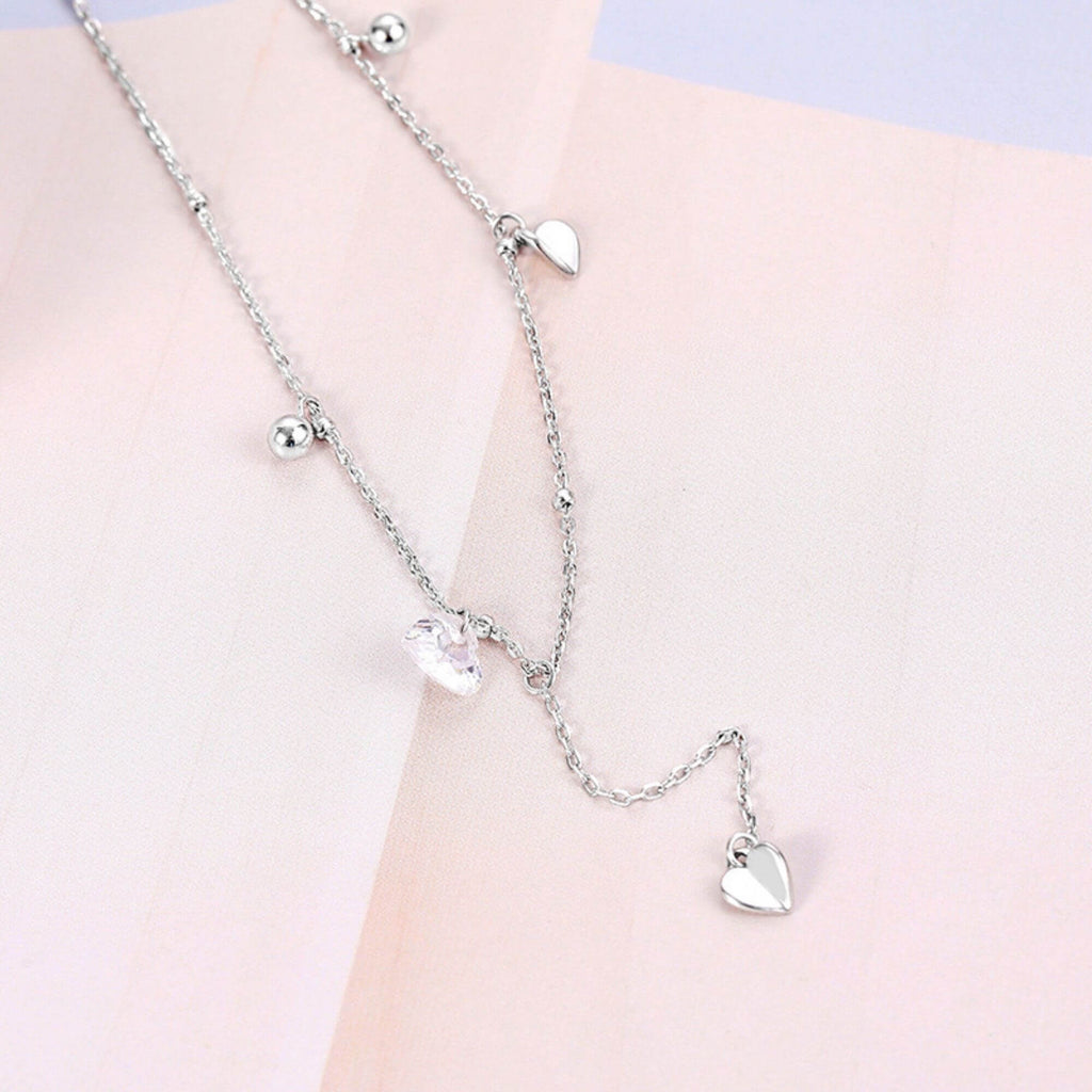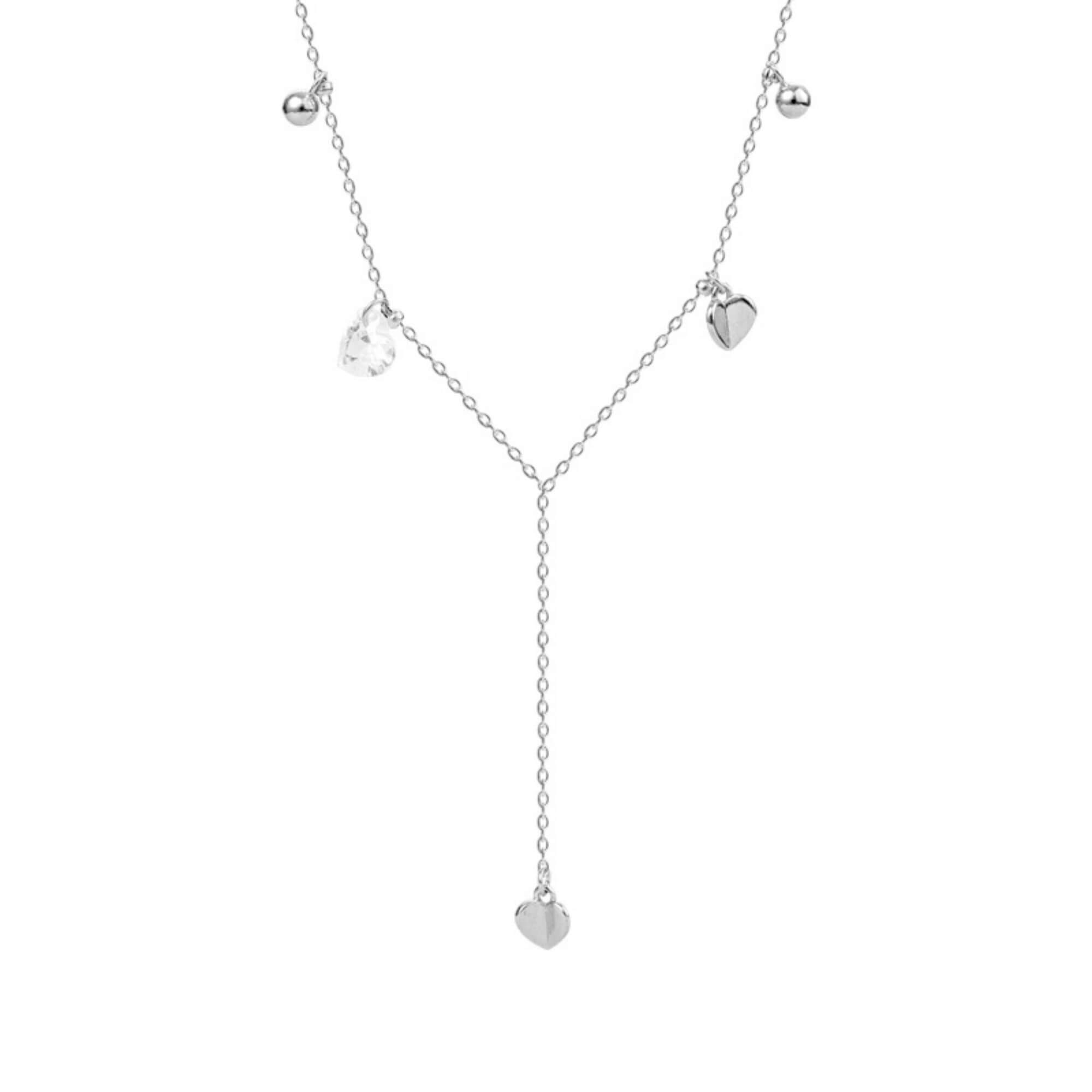 Sterling silver necklace in a choker-style length, featuring a drop chain with a small heart pendant at the end. Additional elements, including a heart, a bead, and a crystal-like detail, are spaced along the chain. A simple yet distinctive design that works well for both casual wear and more dressed-up looks.