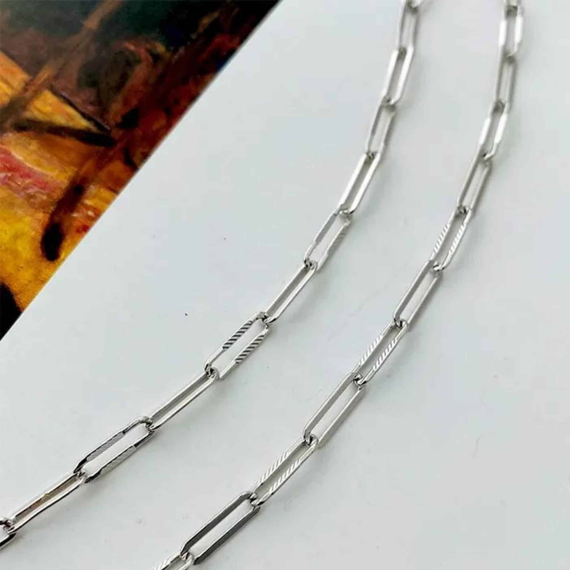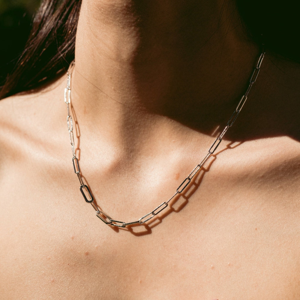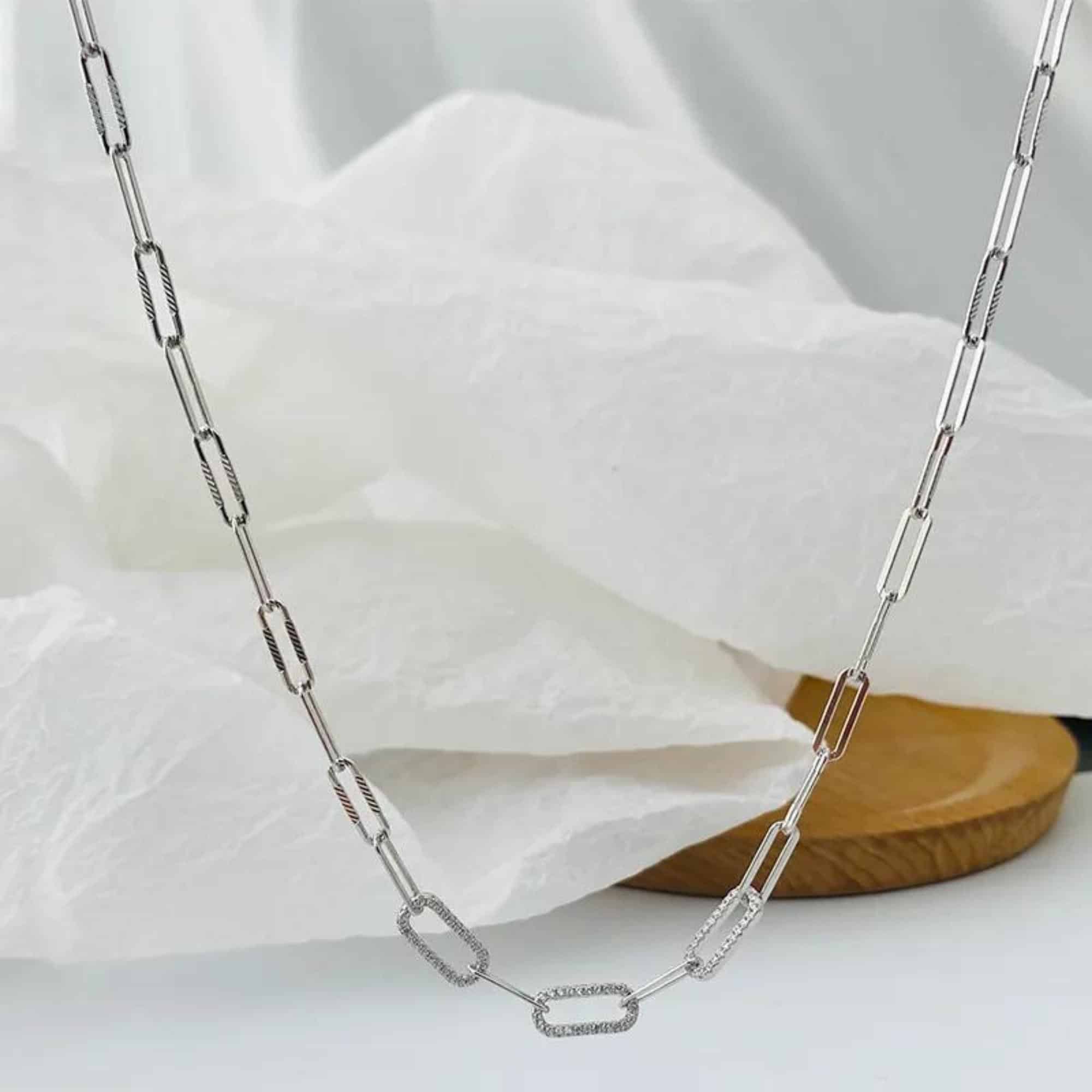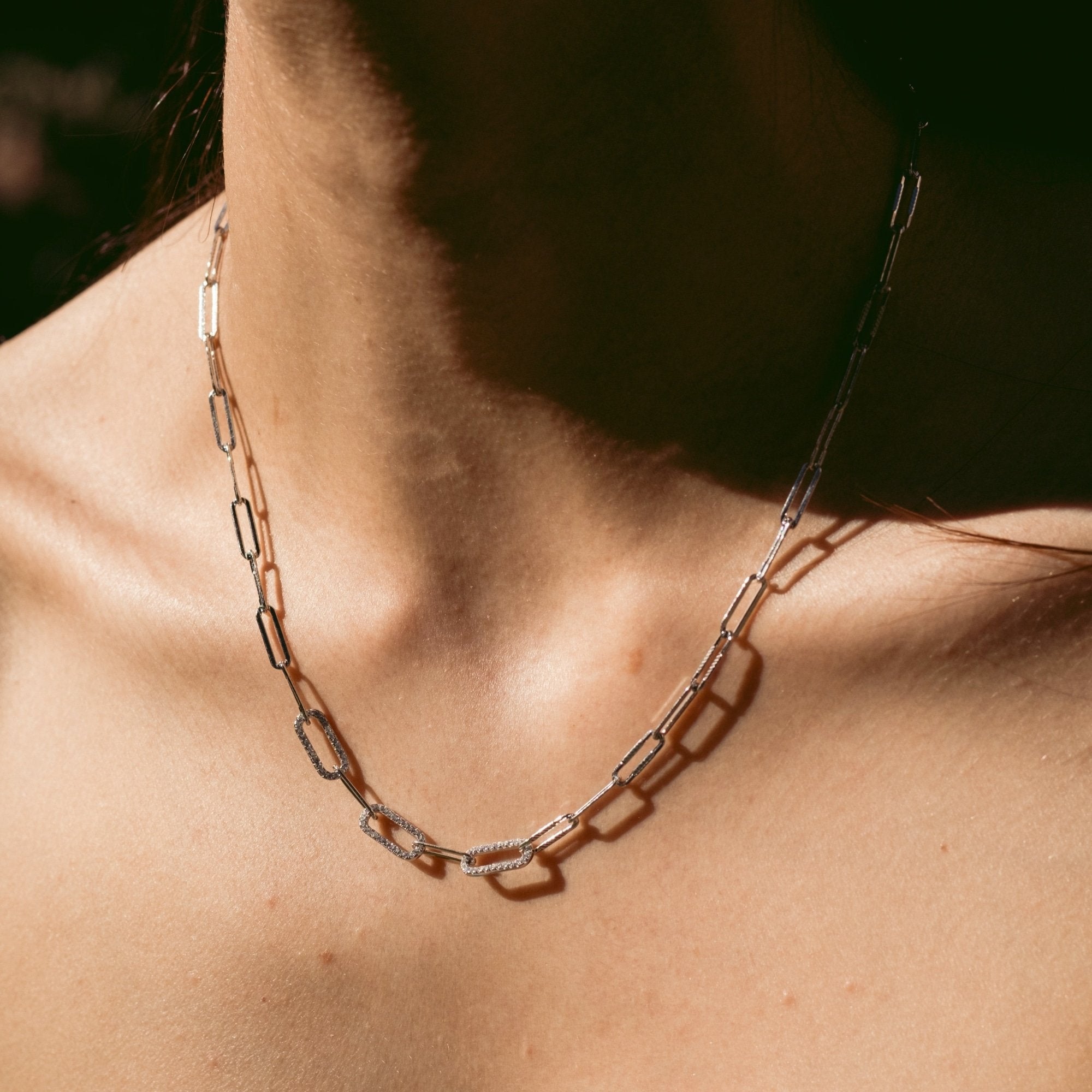 Silver necklace with elongated links, some in plain metal and others set with small cubic zirconia. The variation in texture gives the piece a contemporary character, making it a suitable choice for wearing on its own or layering with other chains.