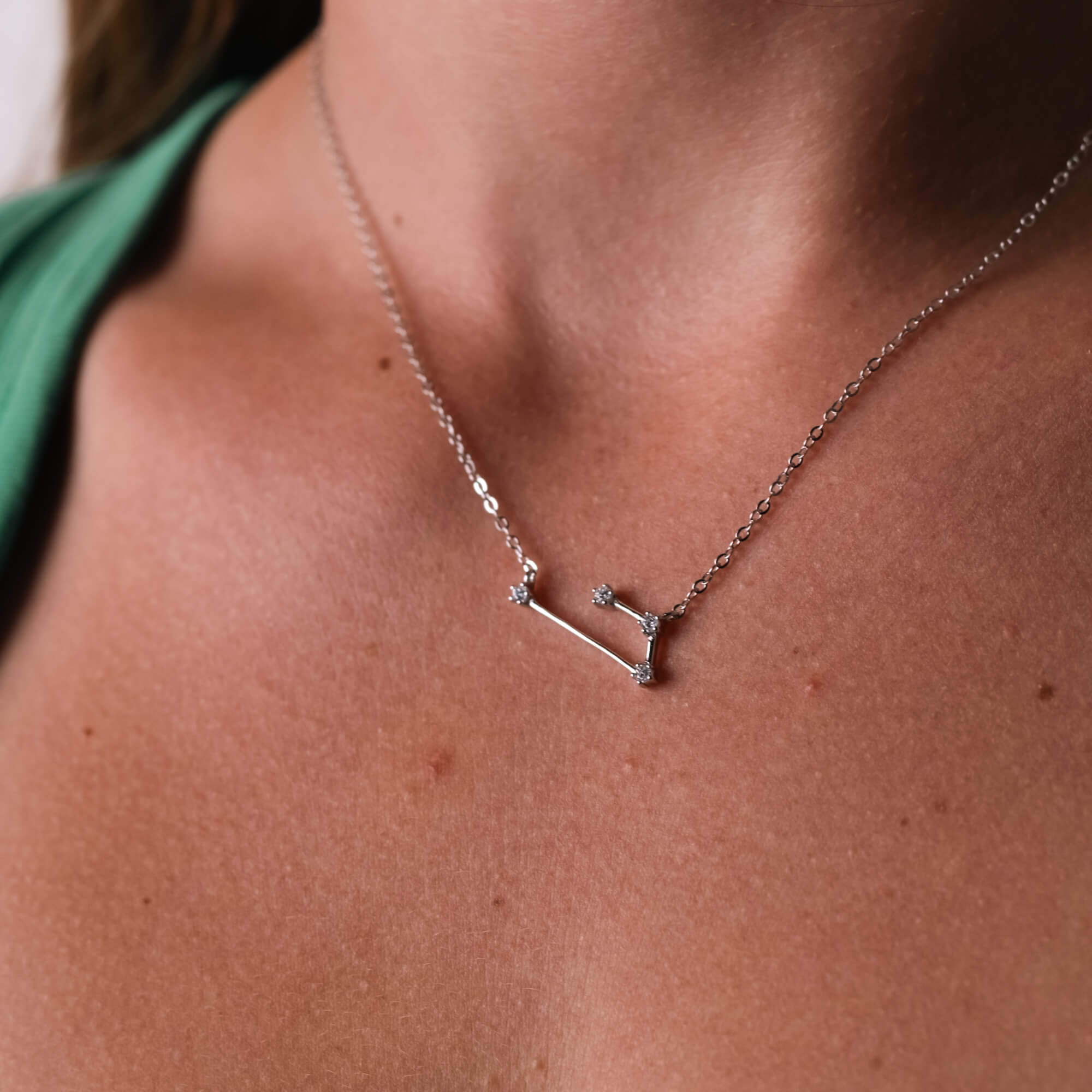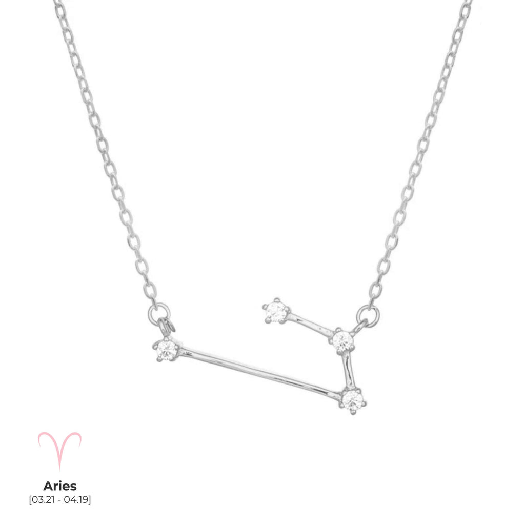 Sterling silver necklace featuring the Aries constellation, representing those born between March 21 and April 19. A design that reflects the sign’s connection to new beginnings, bold energy, and a love for adventure. Ideal for celebrating the spirited and determined nature of Aries women.