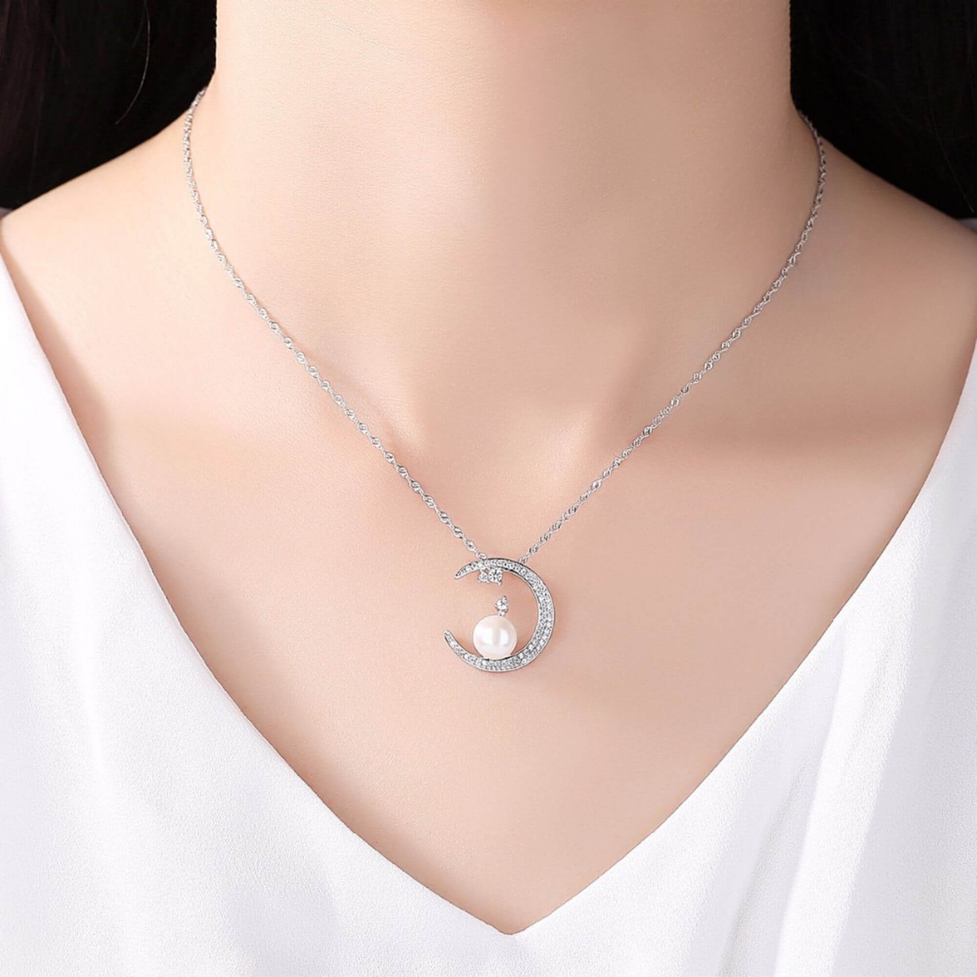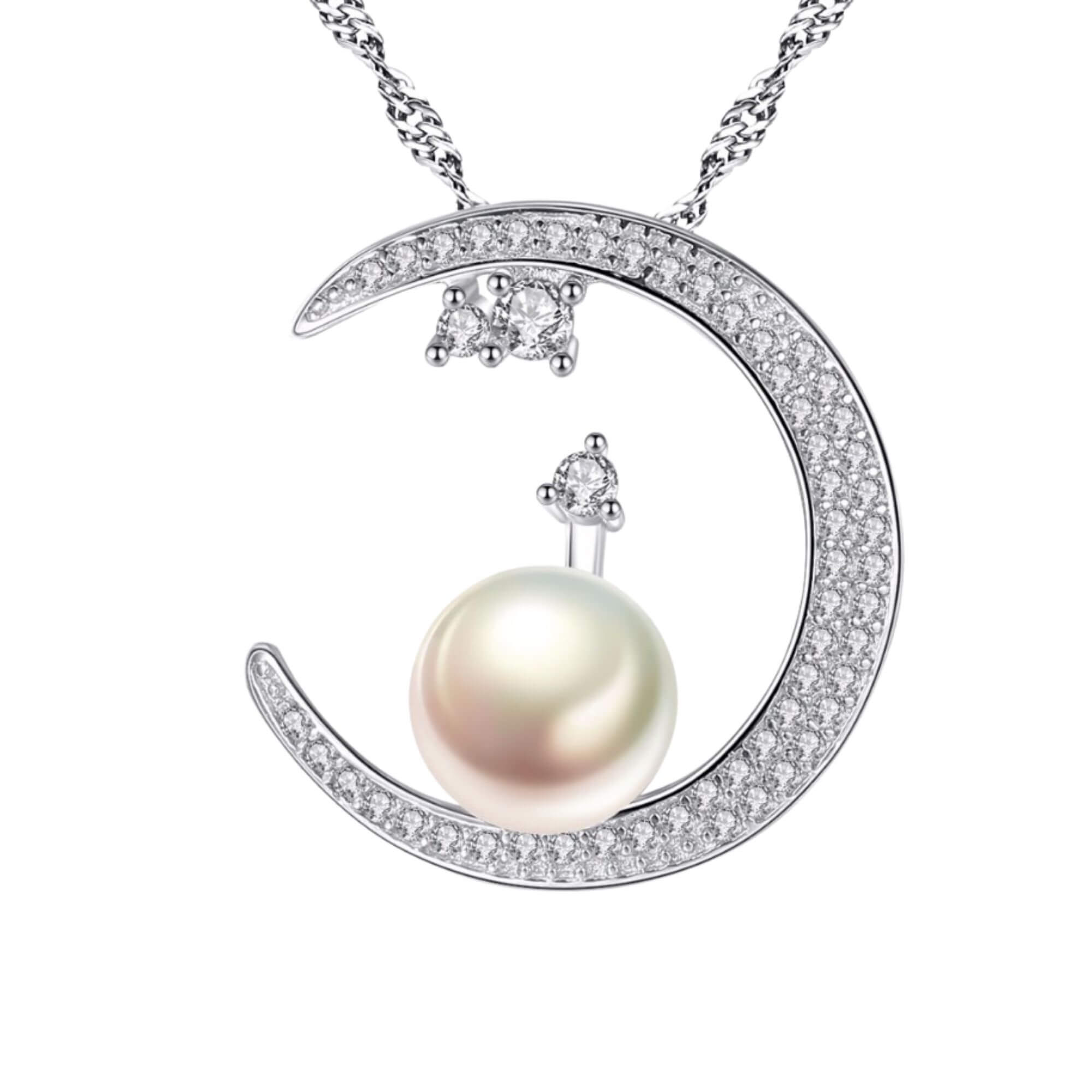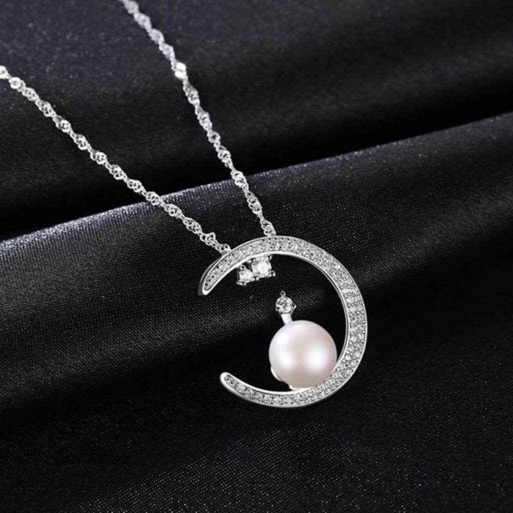 Sterling silver necklace with a pearl at the center, framed by cubic zirconia for added brightness. The pendant is shaped like a crescent moon and paired with a fine chain, each element working together for a balanced, elegant look. A piece that combines the appeal of a classic gemstone with a fresh, modern design.