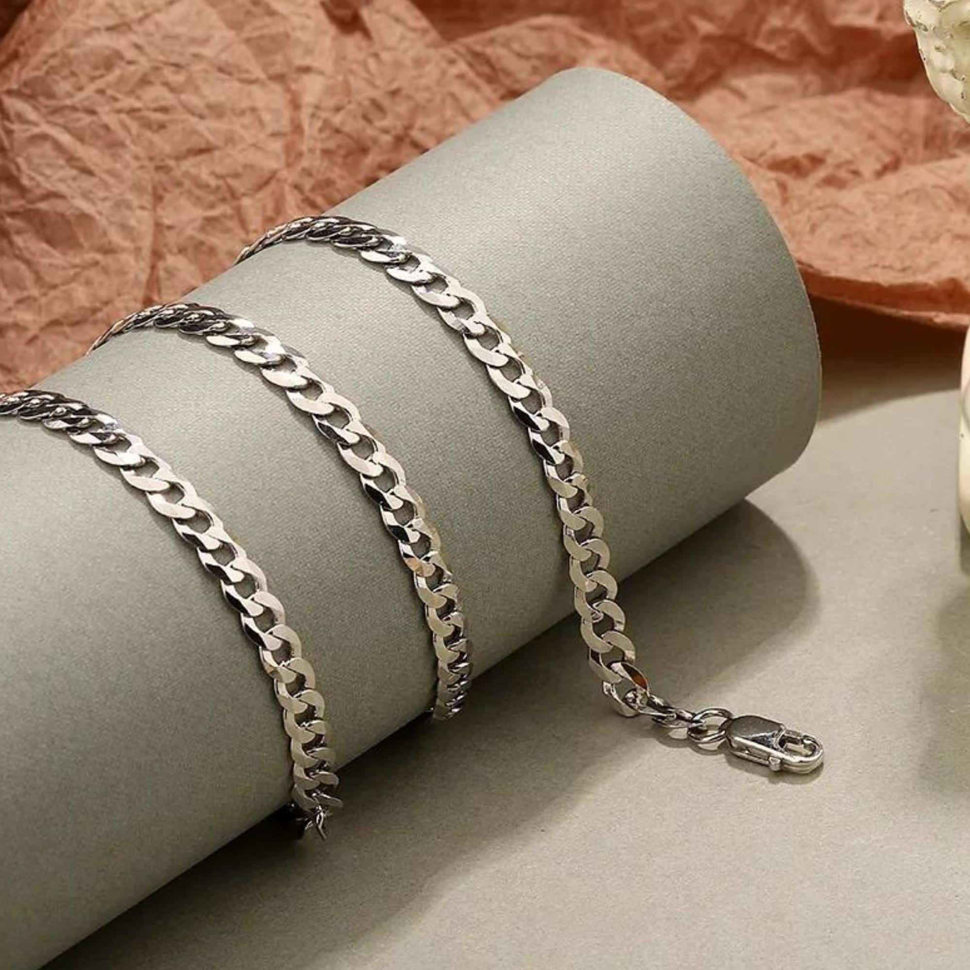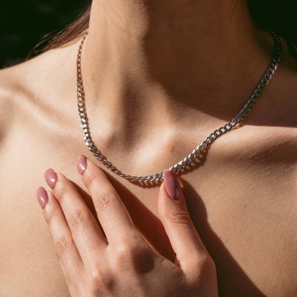 Silver Cuban link necklace with a width of 0.48 cm, offering a classic and versatile design. Easy to style for both casual and formal looks, it can be worn alone or layered with other chains.