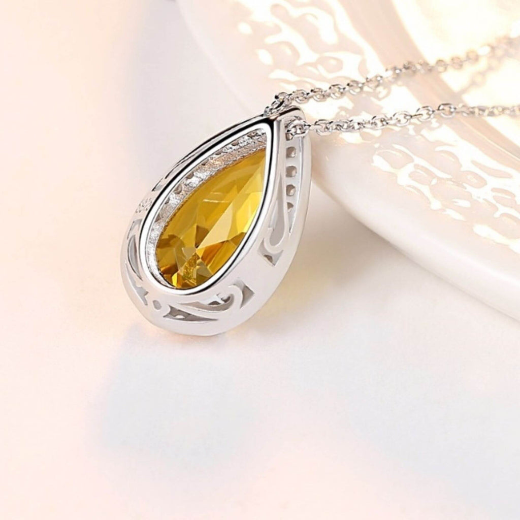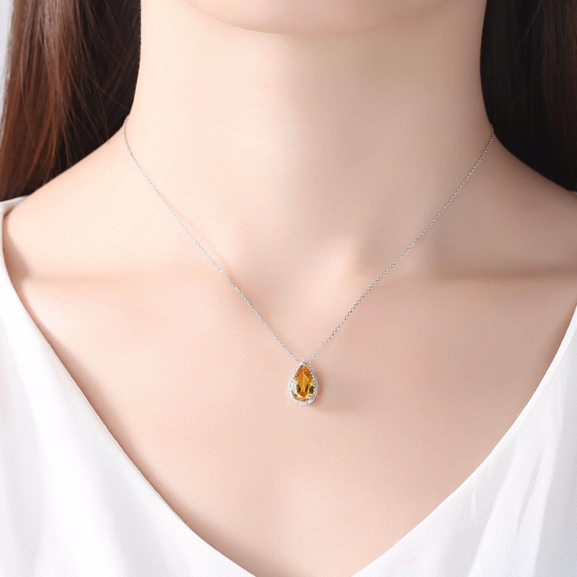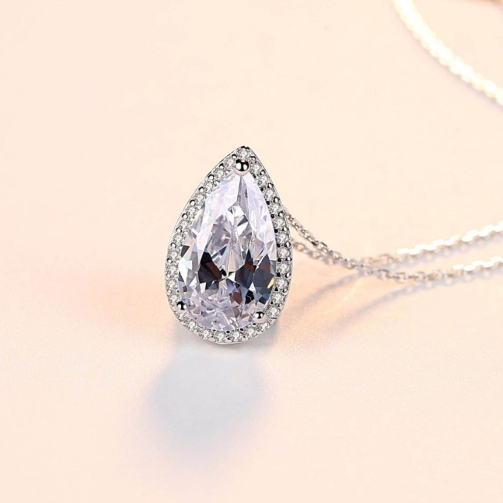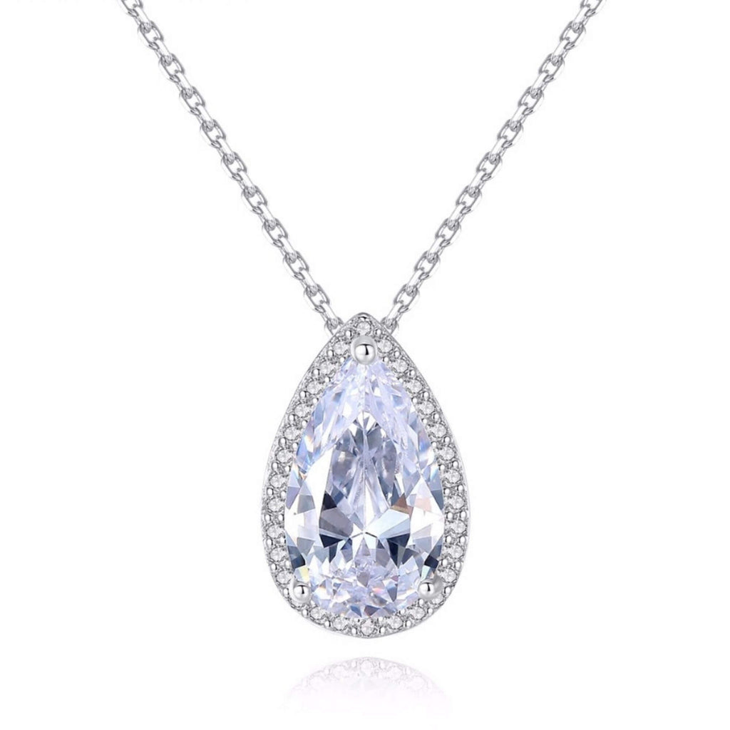 Sterling silver necklace with a teardrop-shaped pendant in your choice of silver or orange. A larger cubic zirconia sits in the center, surrounded by a ring of smaller stones, resulting in a design that feels rich in detail without being overwhelming.