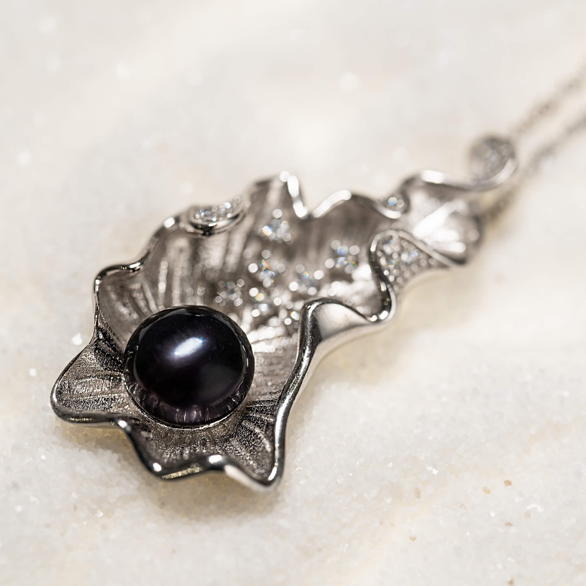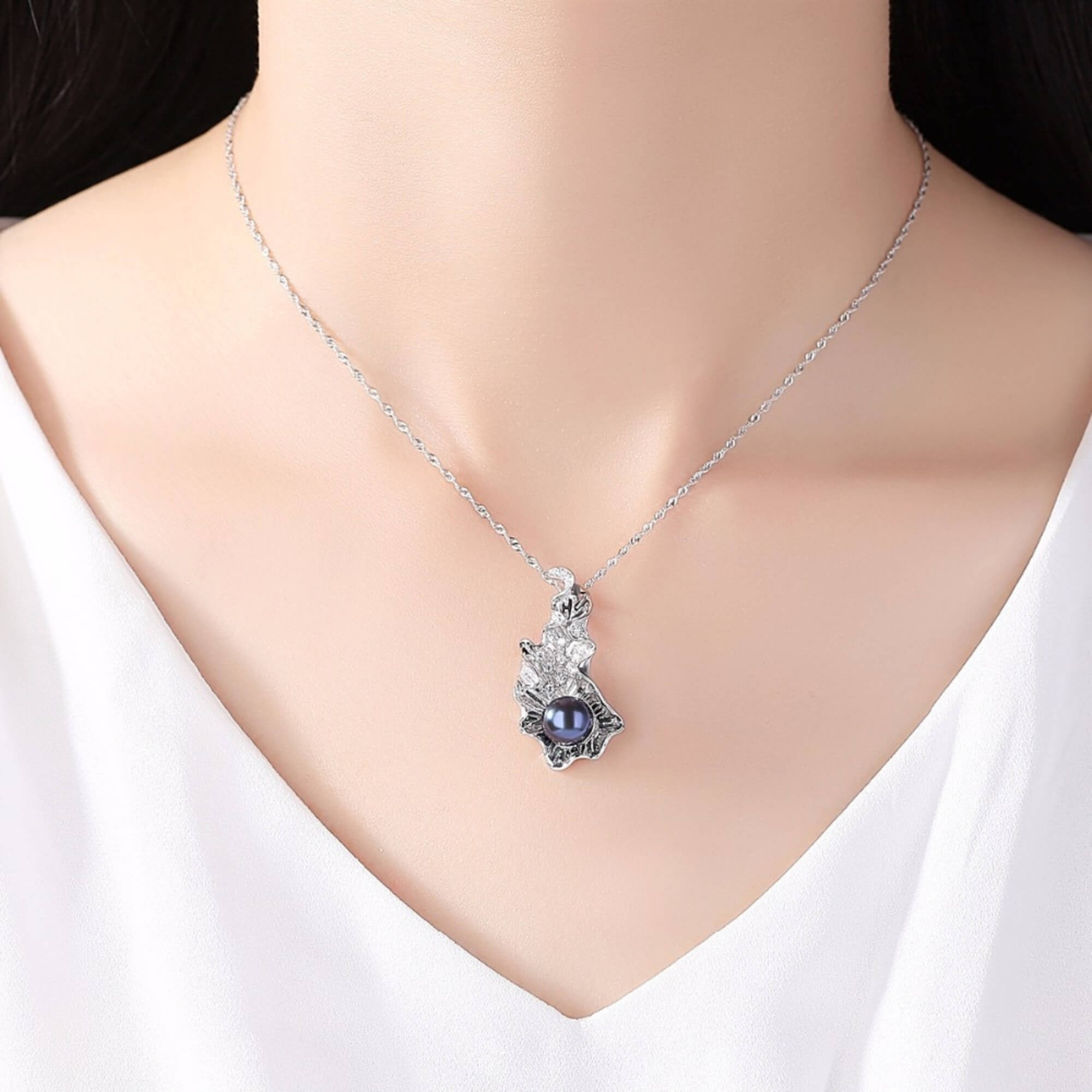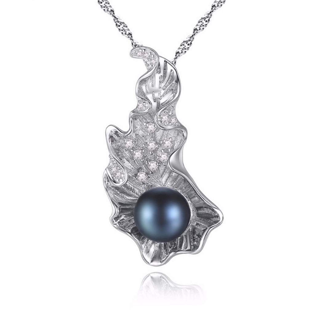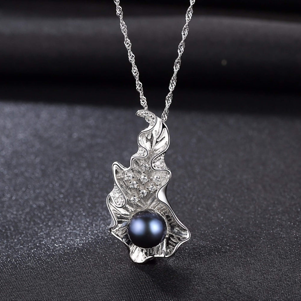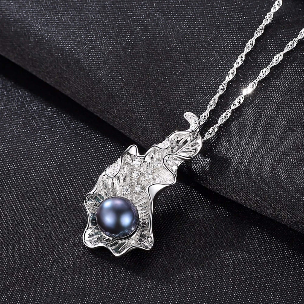 Sterling silver necklace with a bold leaf-shaped pendant and a single navy pearl resting at its center. The delicate shape and deep color create a striking contrast, offering a standout piece with a contemporary edge.