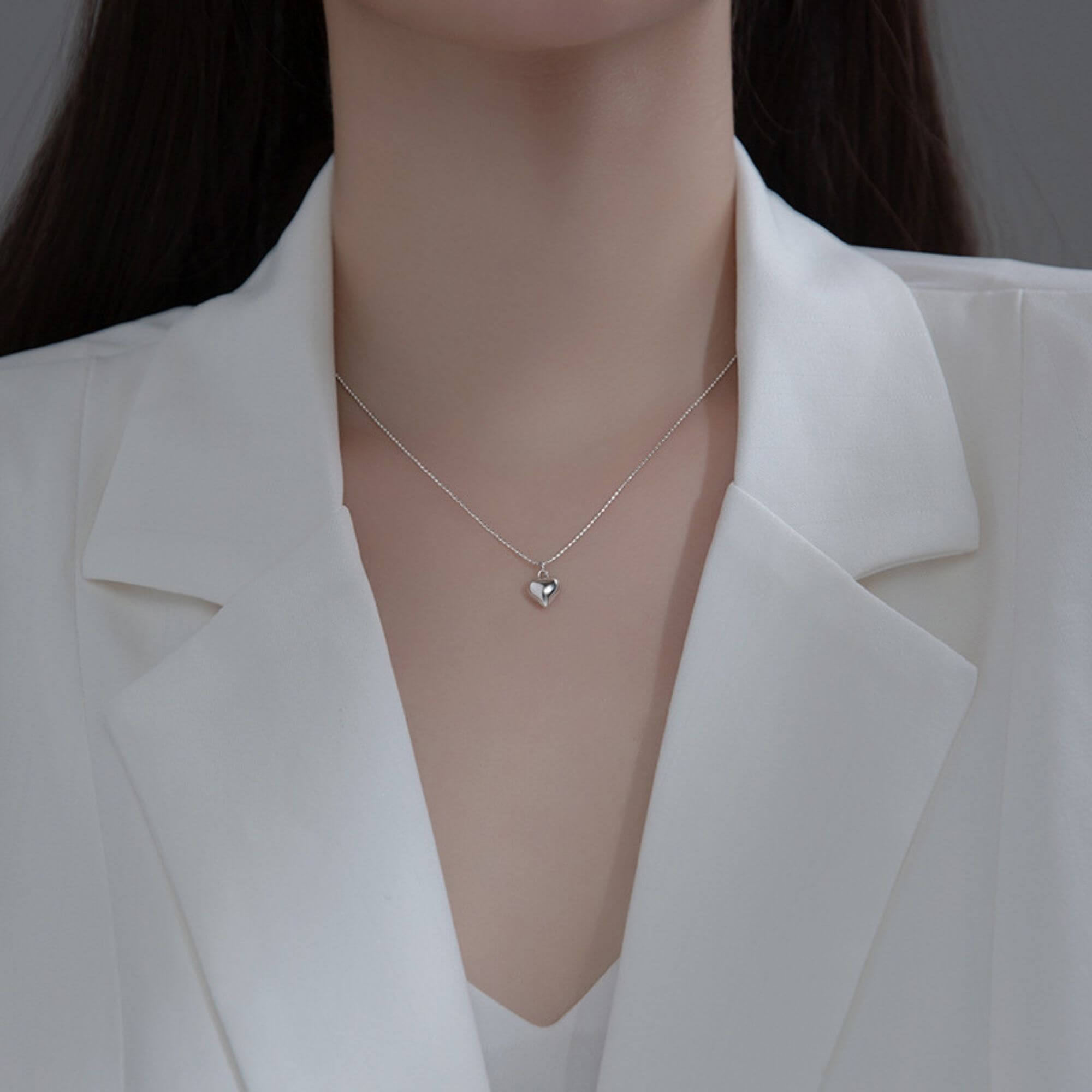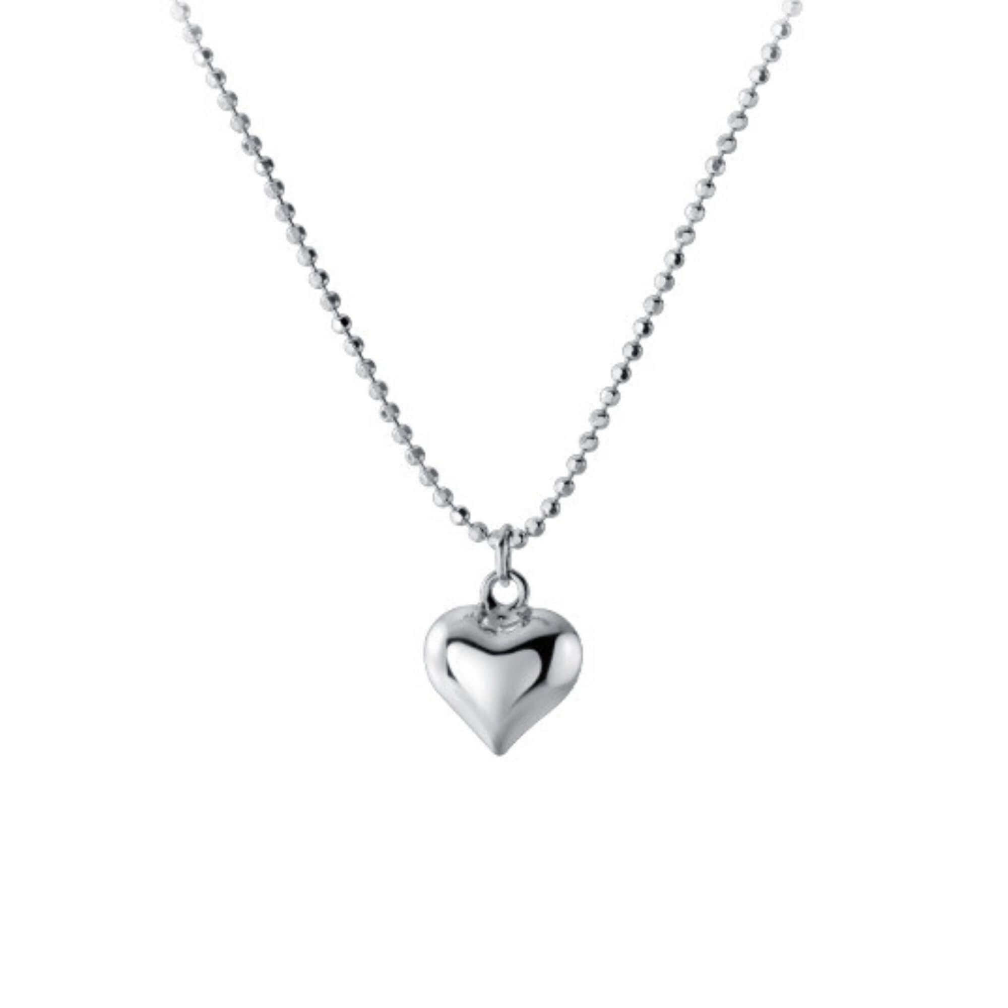Silver necklace with a small, smooth heart pendant hanging from a beaded chain. The simple design and compact size make it easy to wear every day, whether on its own or paired with other necklaces for a layered look.