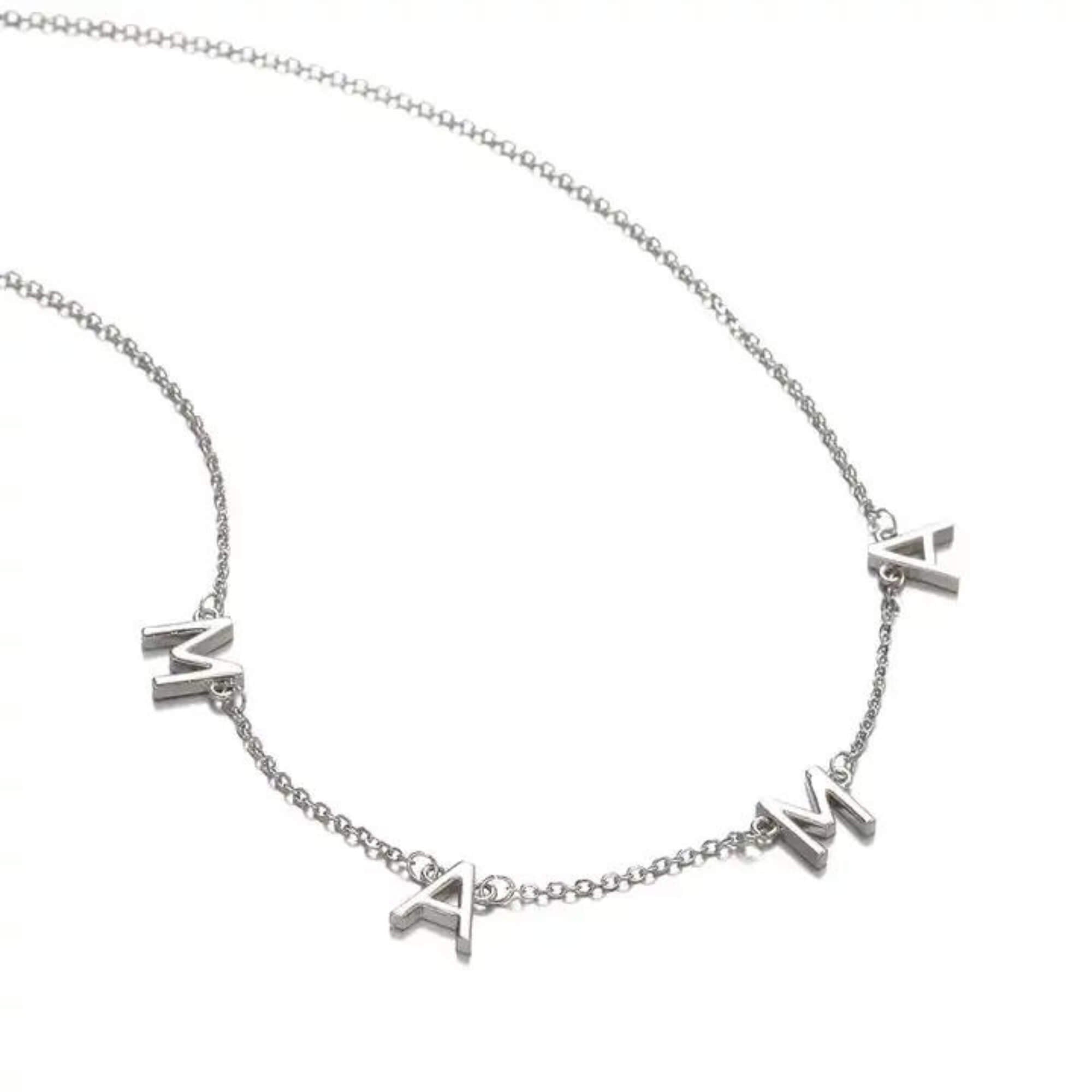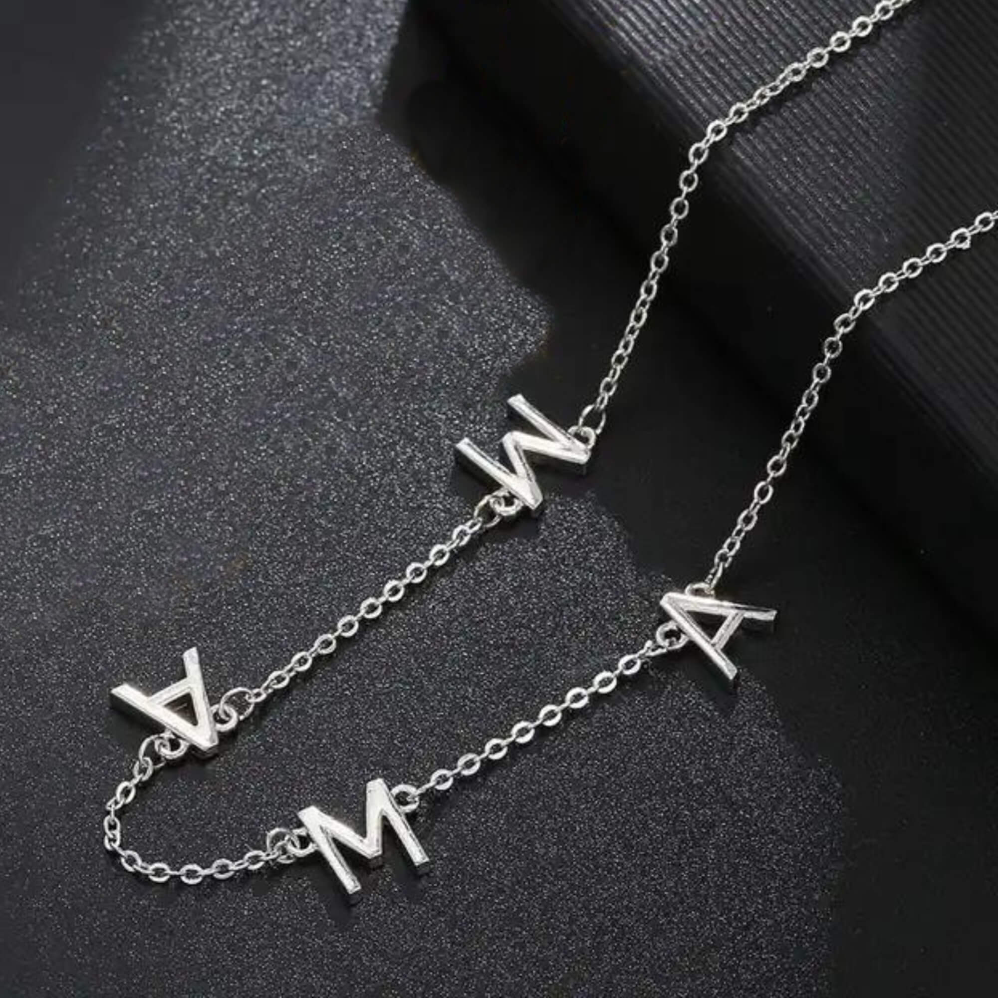 Sterling silver necklace featuring letter charms that spell “MAMA.” A simple yet meaningful design that celebrates motherhood and the deep connection it represents. An ideal gift for any mom, it serves as a daily reminder of love, care, and family.