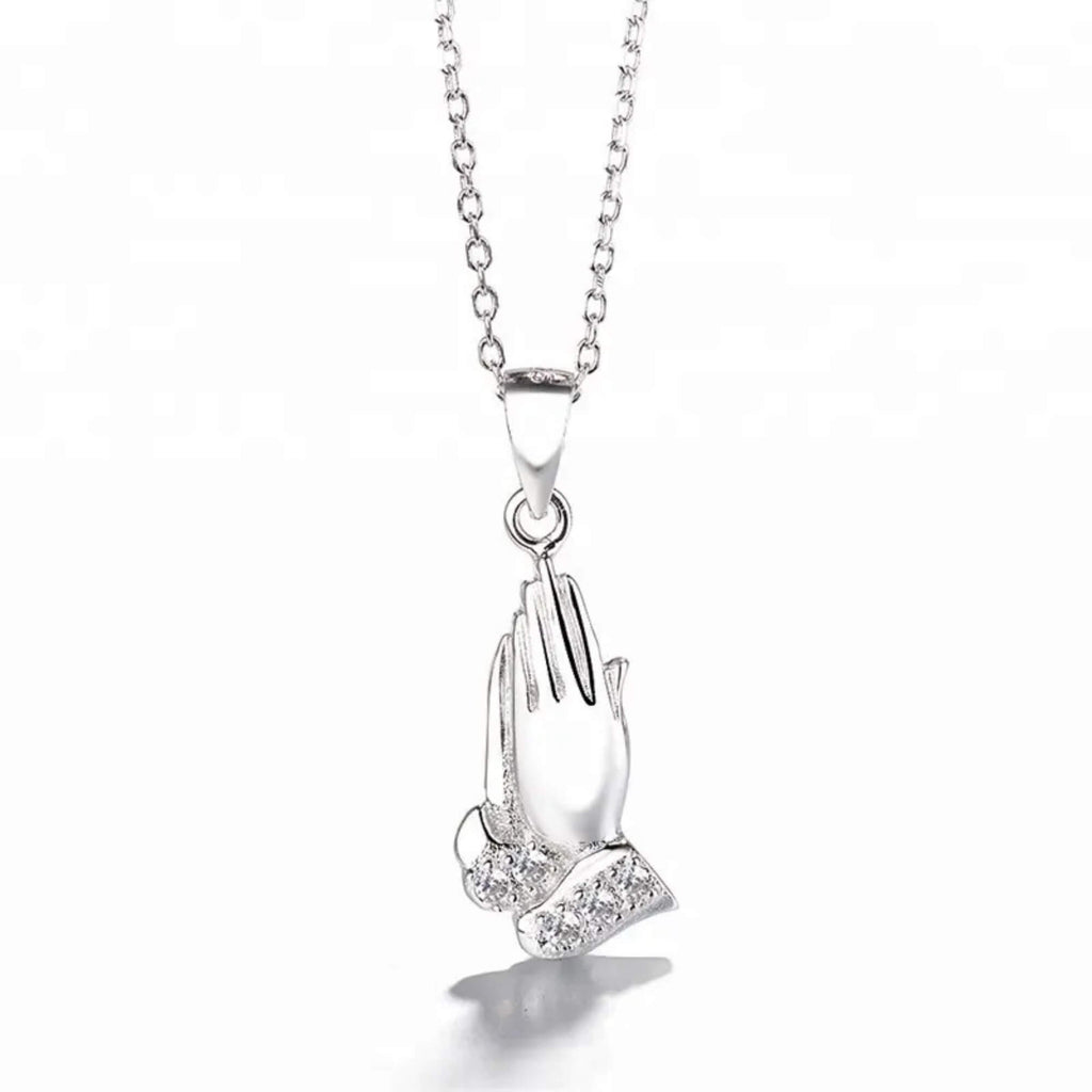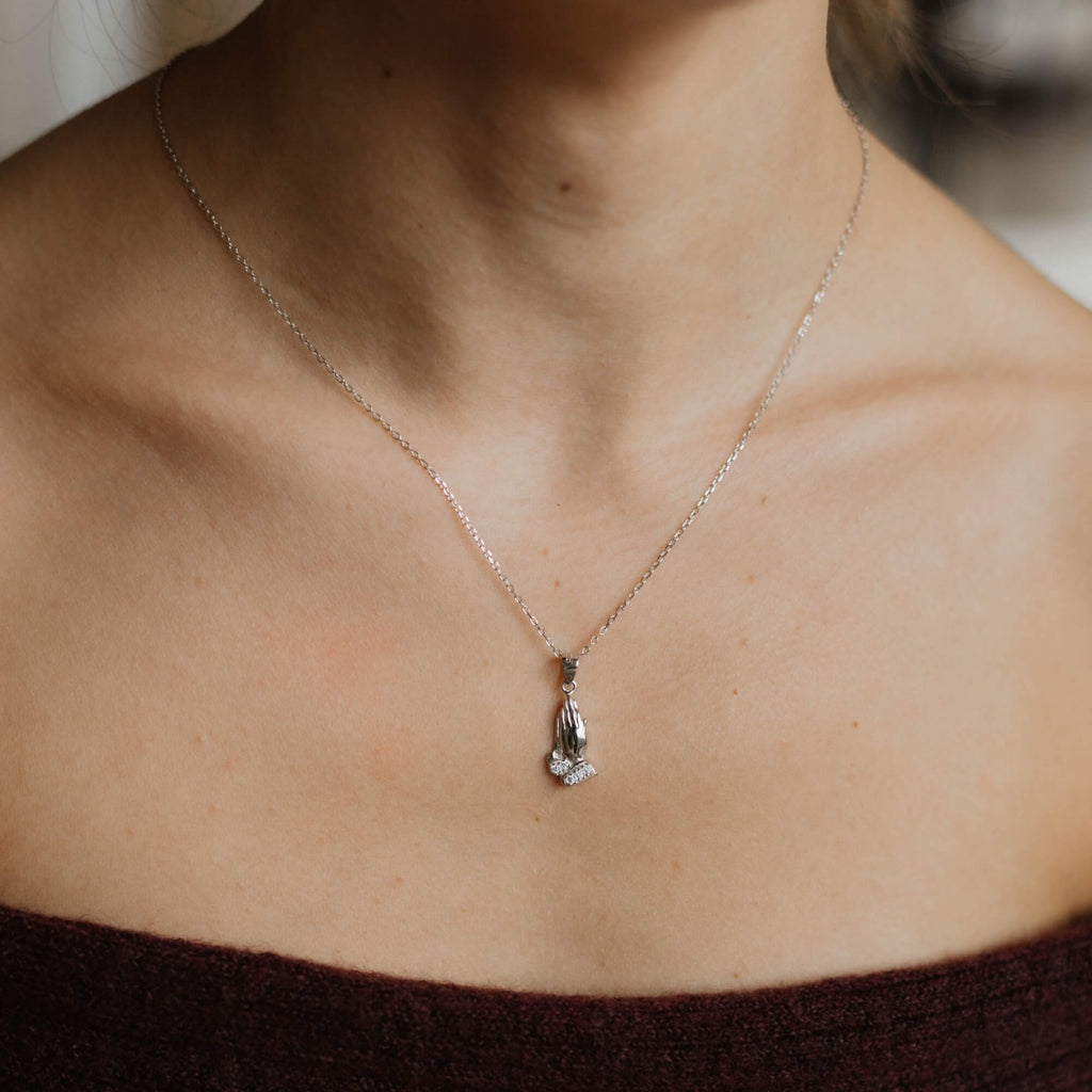 Sterling silver necklace featuring a pendant in the shape of praying hands, detailed with cubic zirconia for a subtle sparkle. A meaningful piece that represents faith, hope, and devotion, it is ideal for those who wish to keep a symbol of their beliefs close at all times.