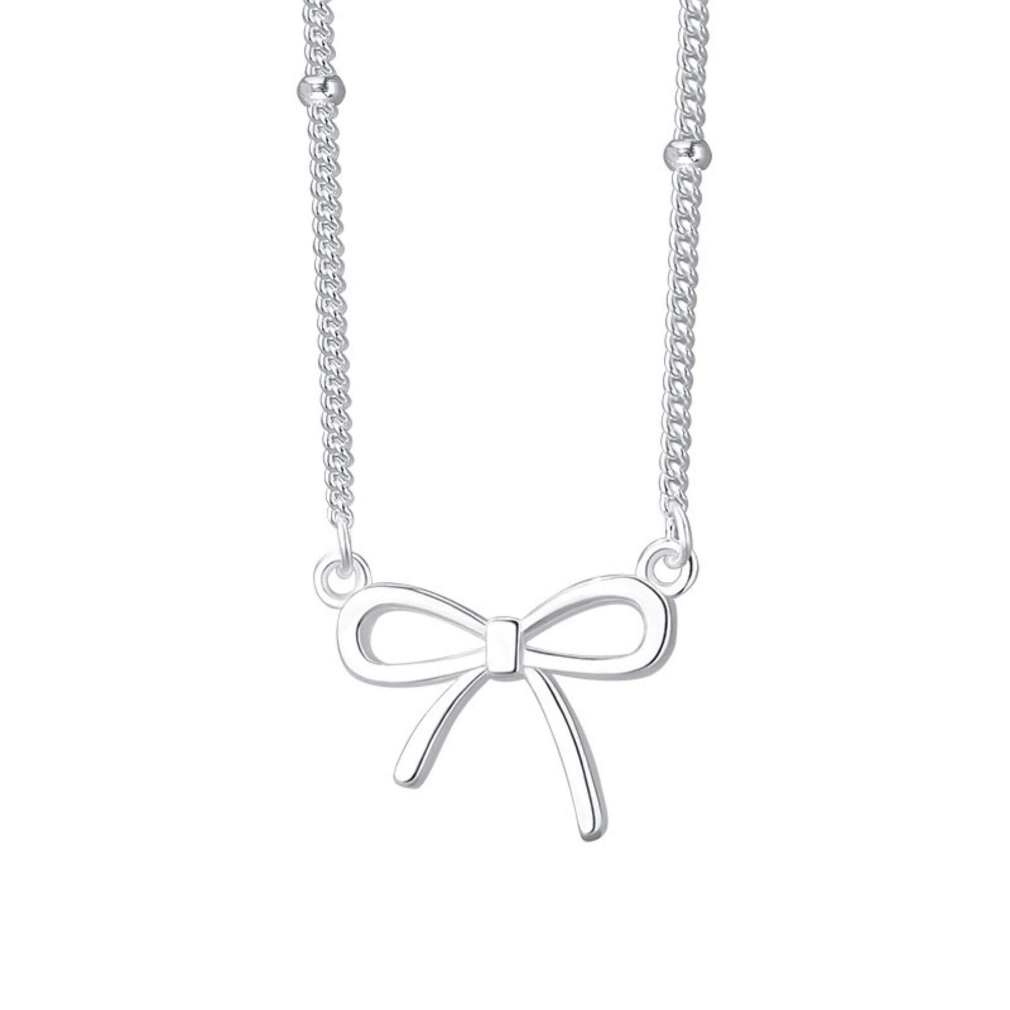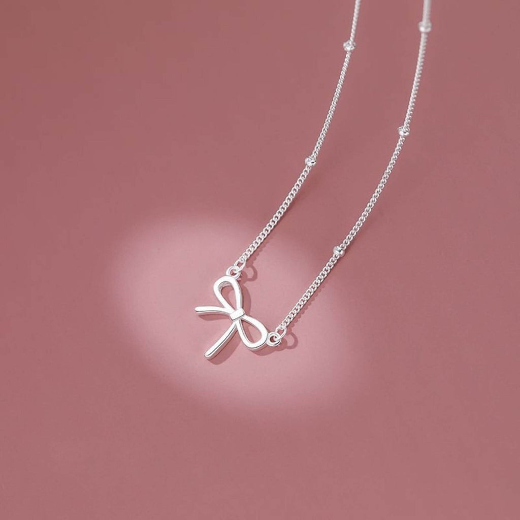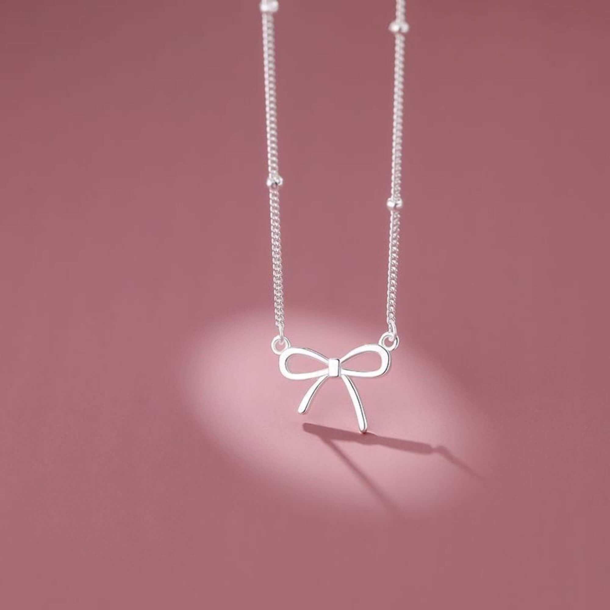 Sterling silver necklace featuring a delicate ribbon-shaped pendant. Small, evenly spaced beads are placed along the chain, complimenting the pendant’s outline. The design has a soft, feminine look that sits neatly at the collarbone.