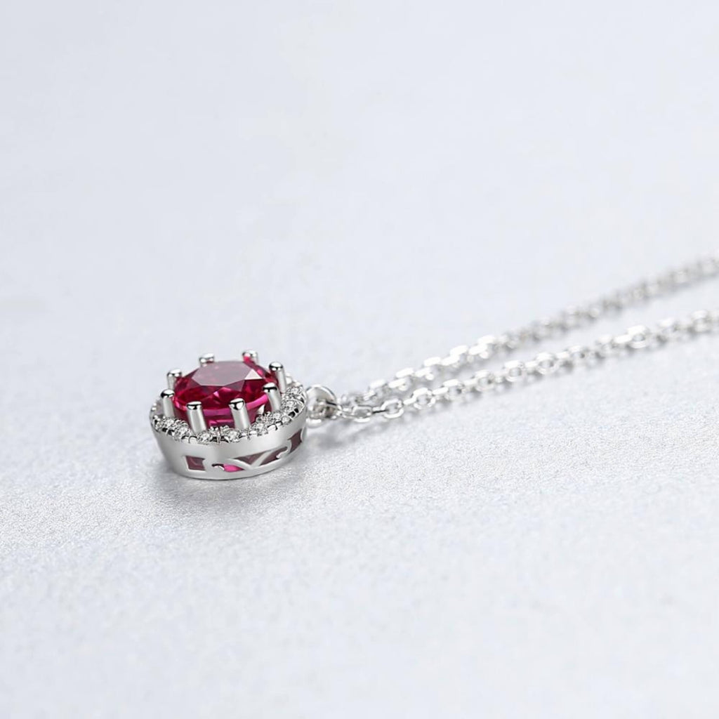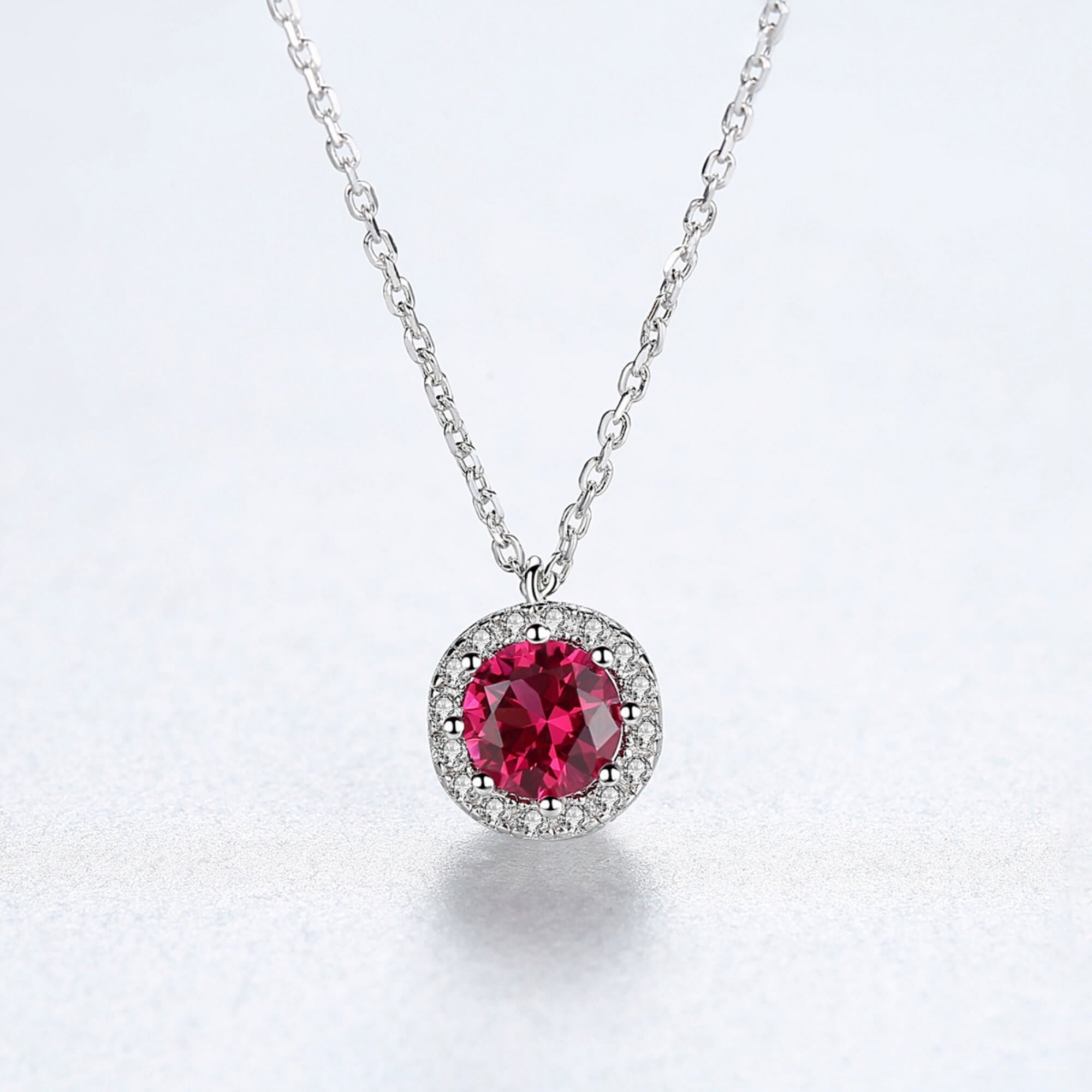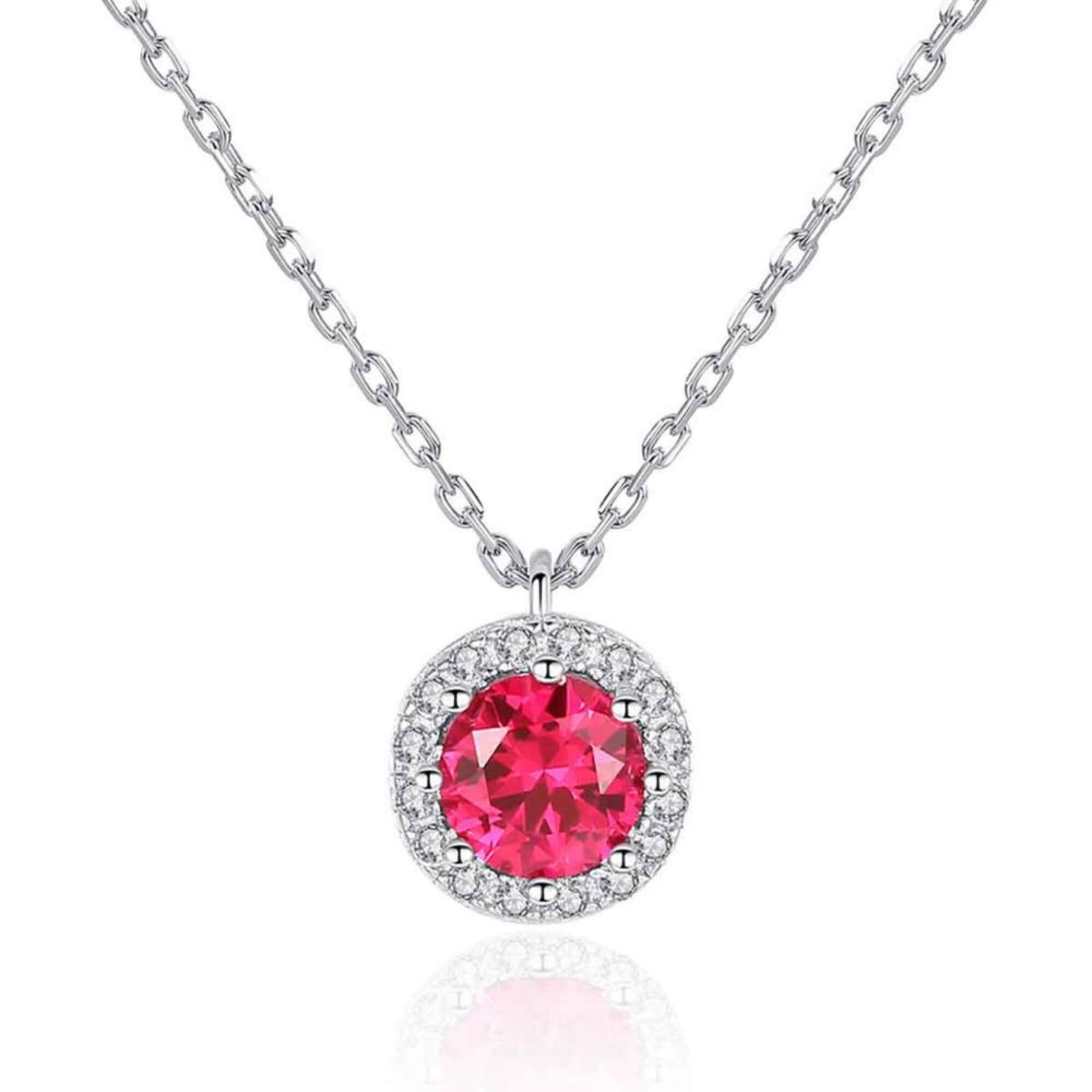 Sterling silver necklace with a round pendant featuring a deep red synthetic ruby at the center, framed by a border of clear cubic zirconia. The fine chain keeps the look clean and classic, while the vivid centerpiece brings color and focus to the design.
