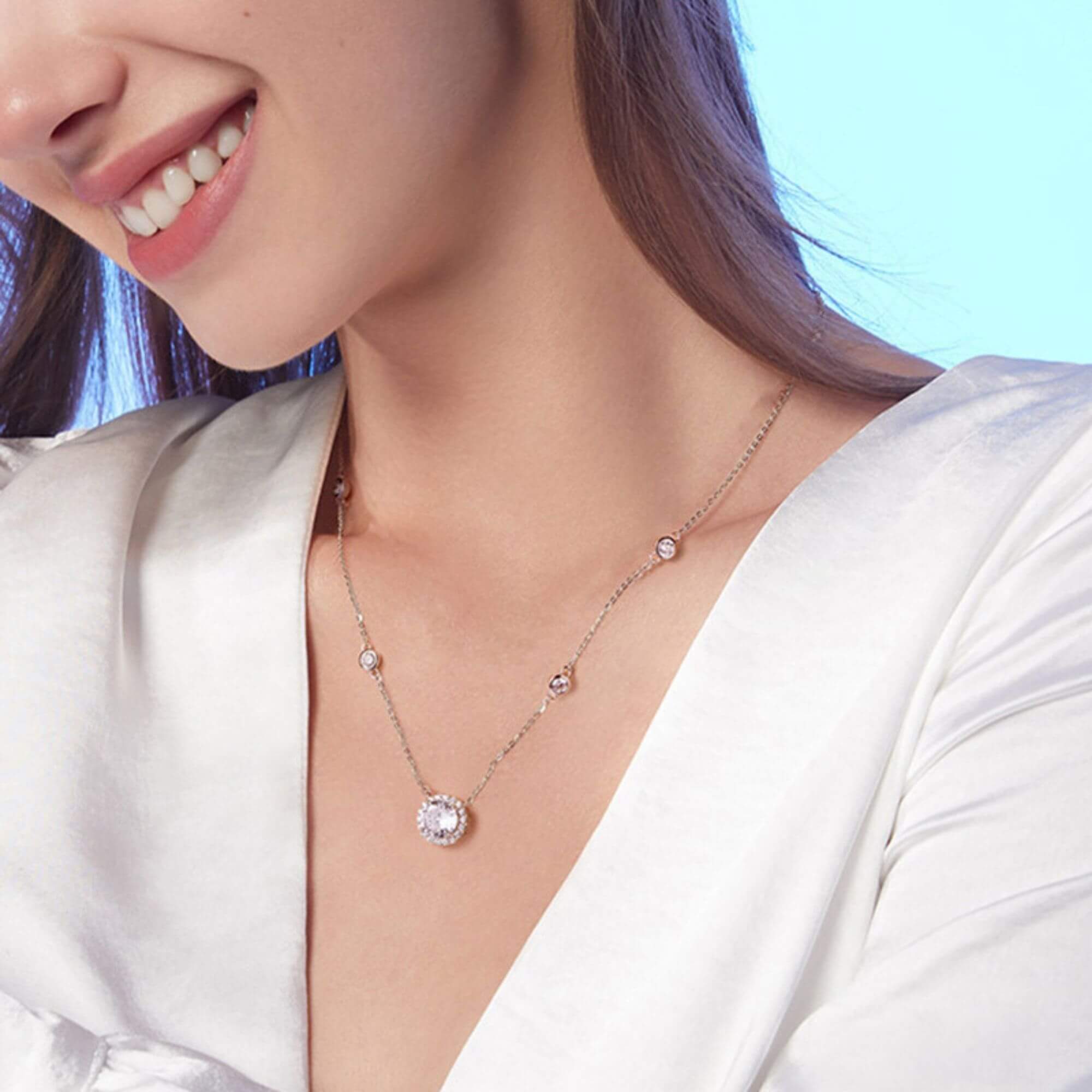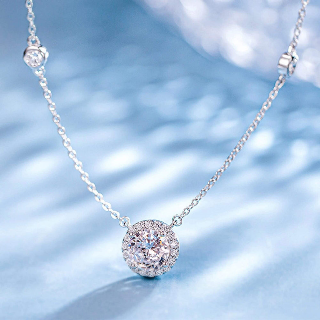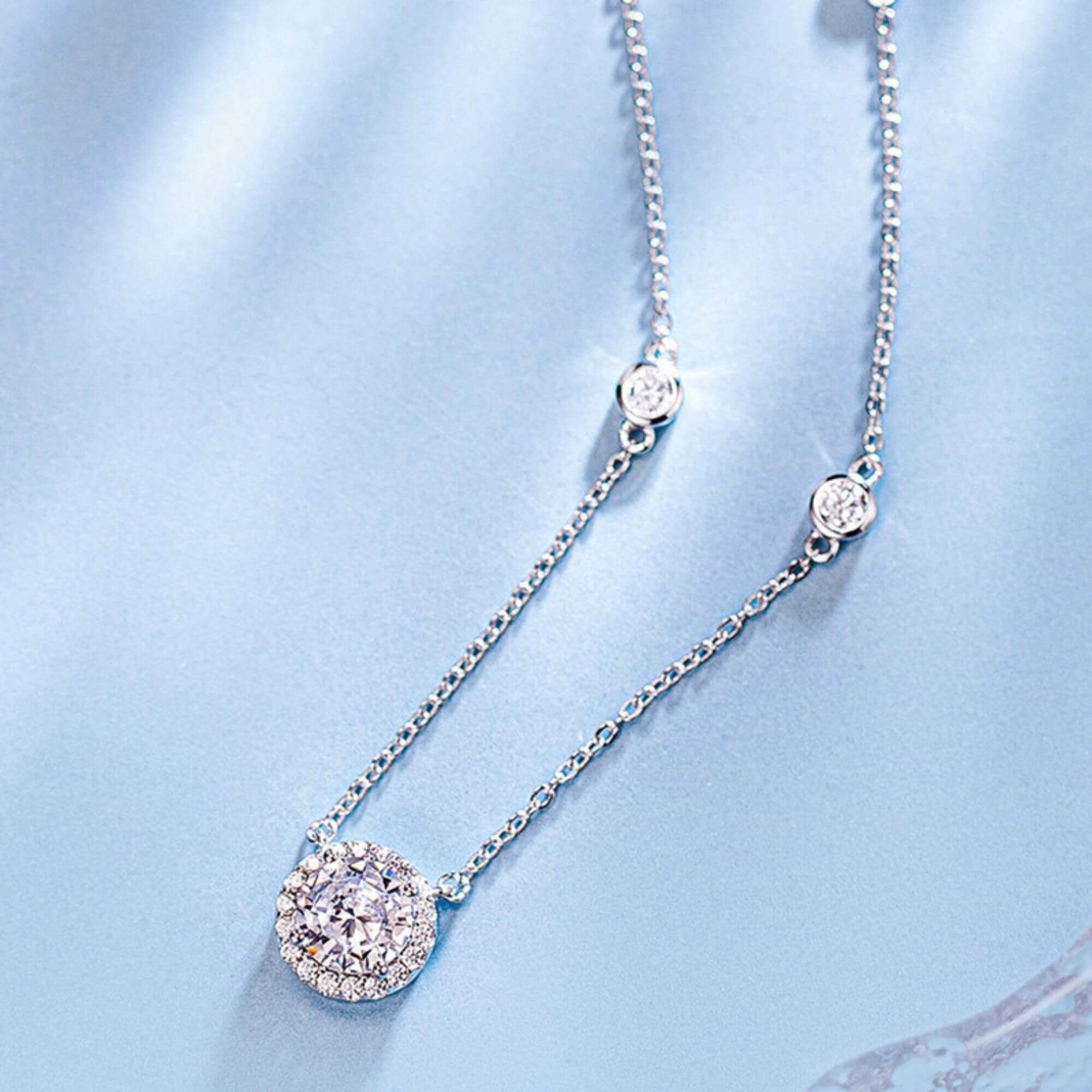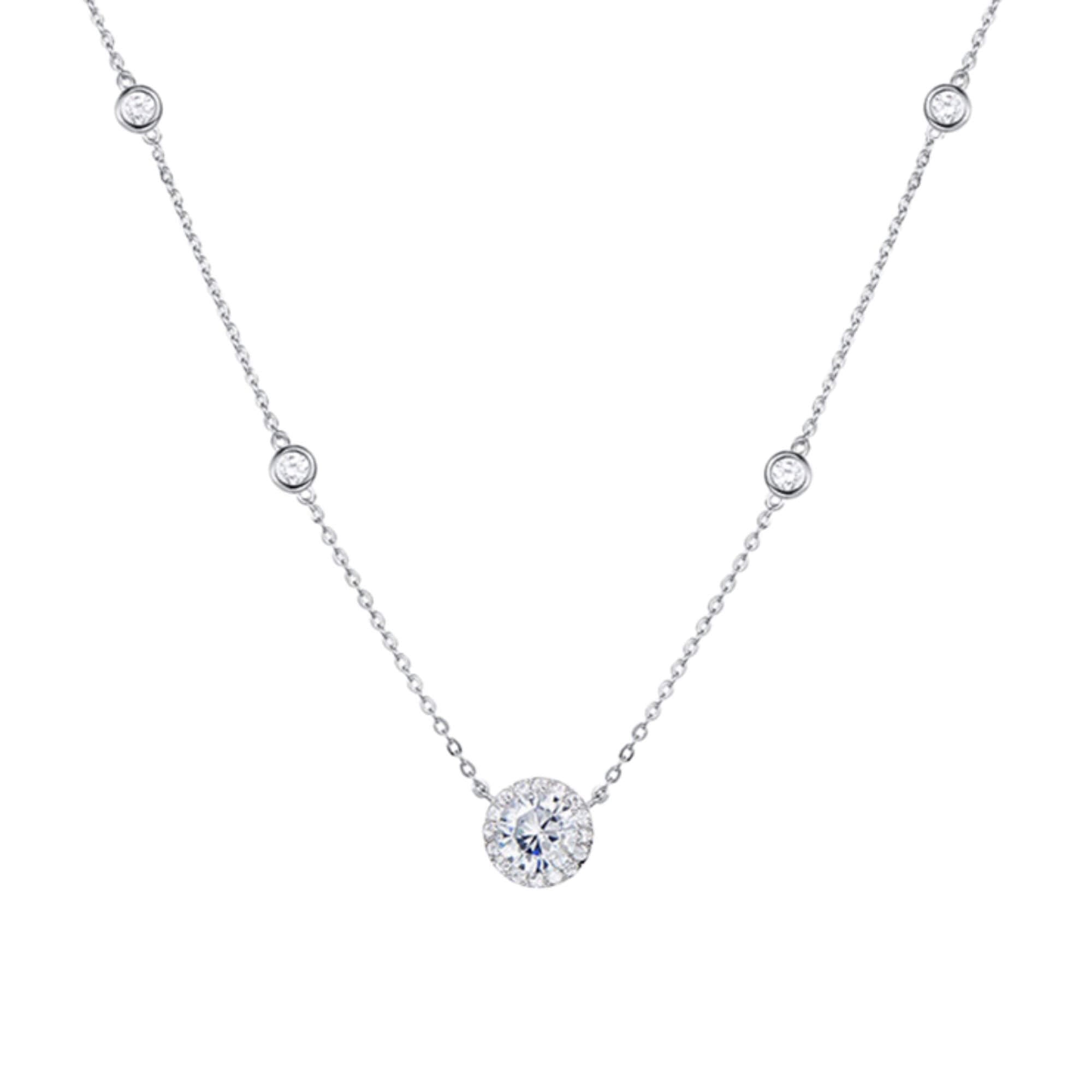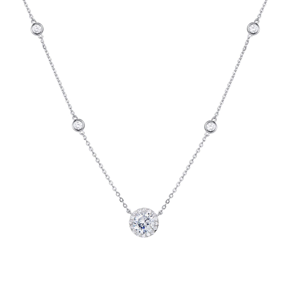 Sterling silver necklace with a round cubic zirconia at the center, framed by smaller stones for added brilliance. Four additional gems are evenly spaced along the chain, creating a balanced and eye-catching design that works beautifully for both daily wear and more formal moments.