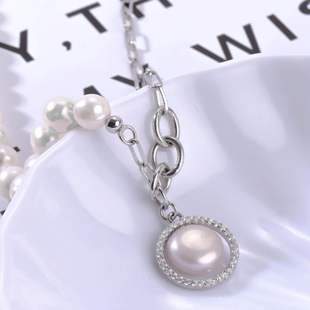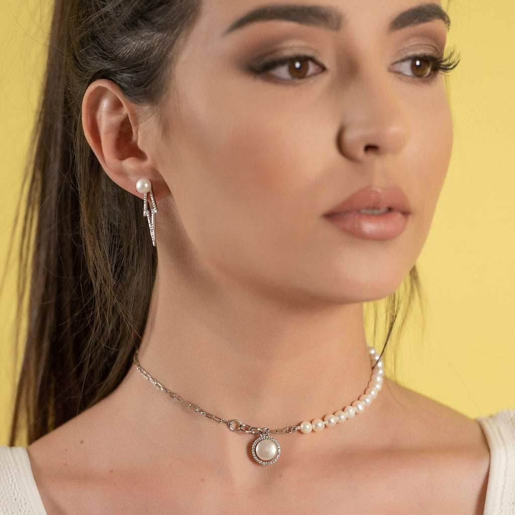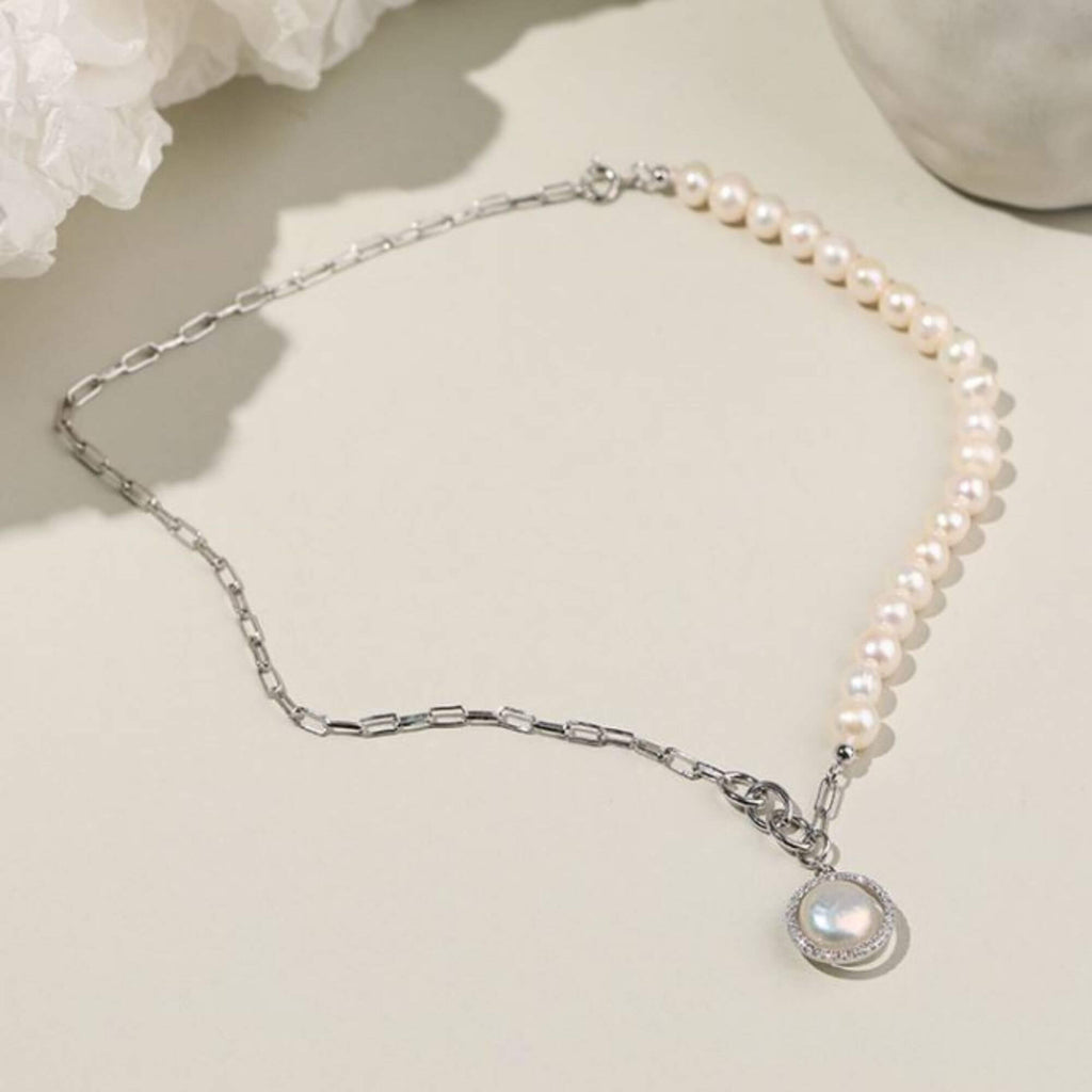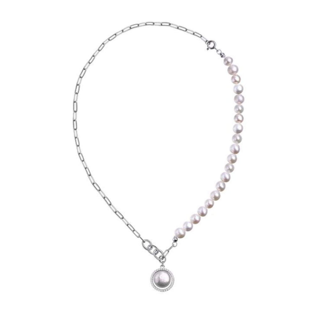 Silver necklace combining elongated chain links with a row of freshwater pearls. A round pendant with a central pearl surrounded by small clear stones completes the piece. The mix of materials creates a contemporary design with a classic influence.