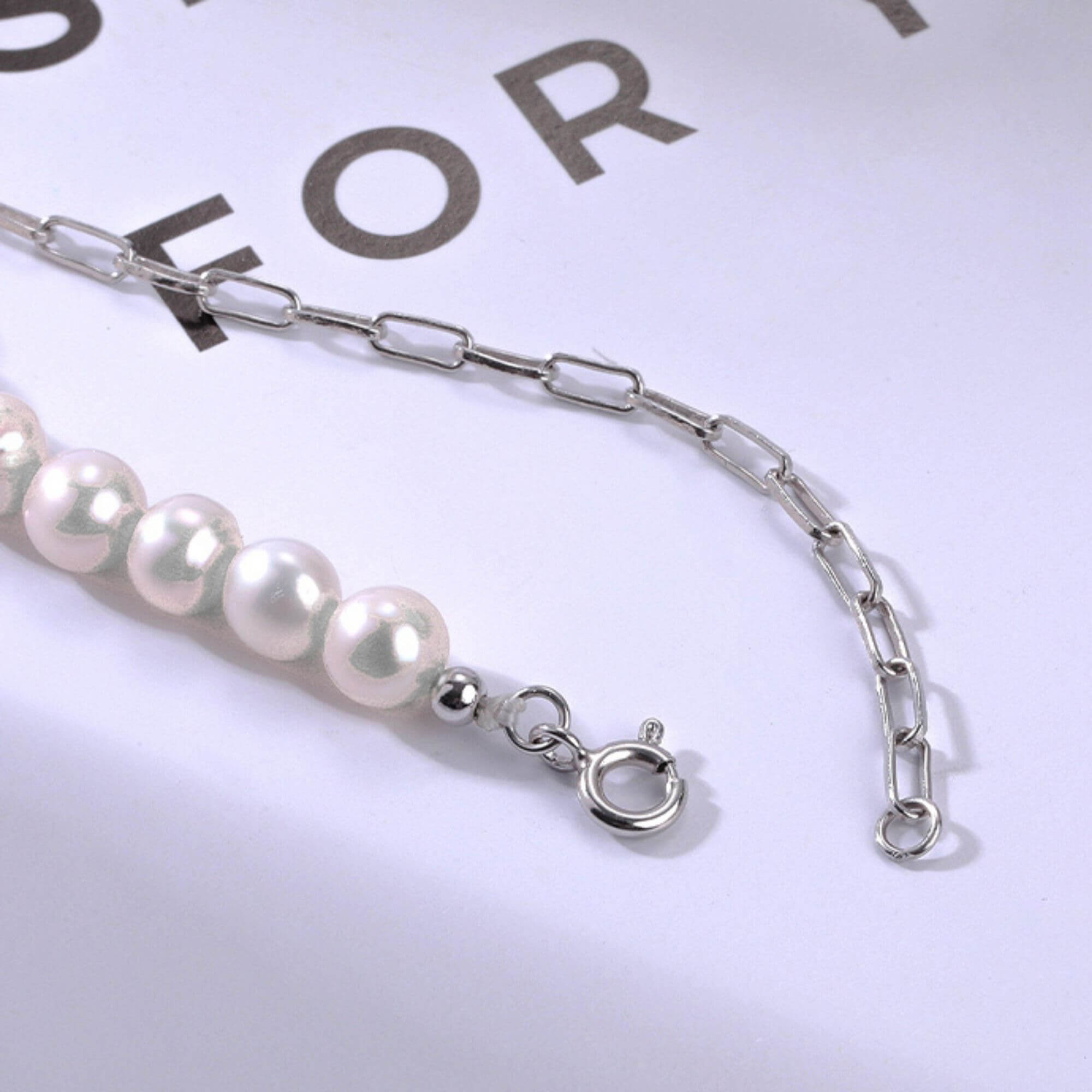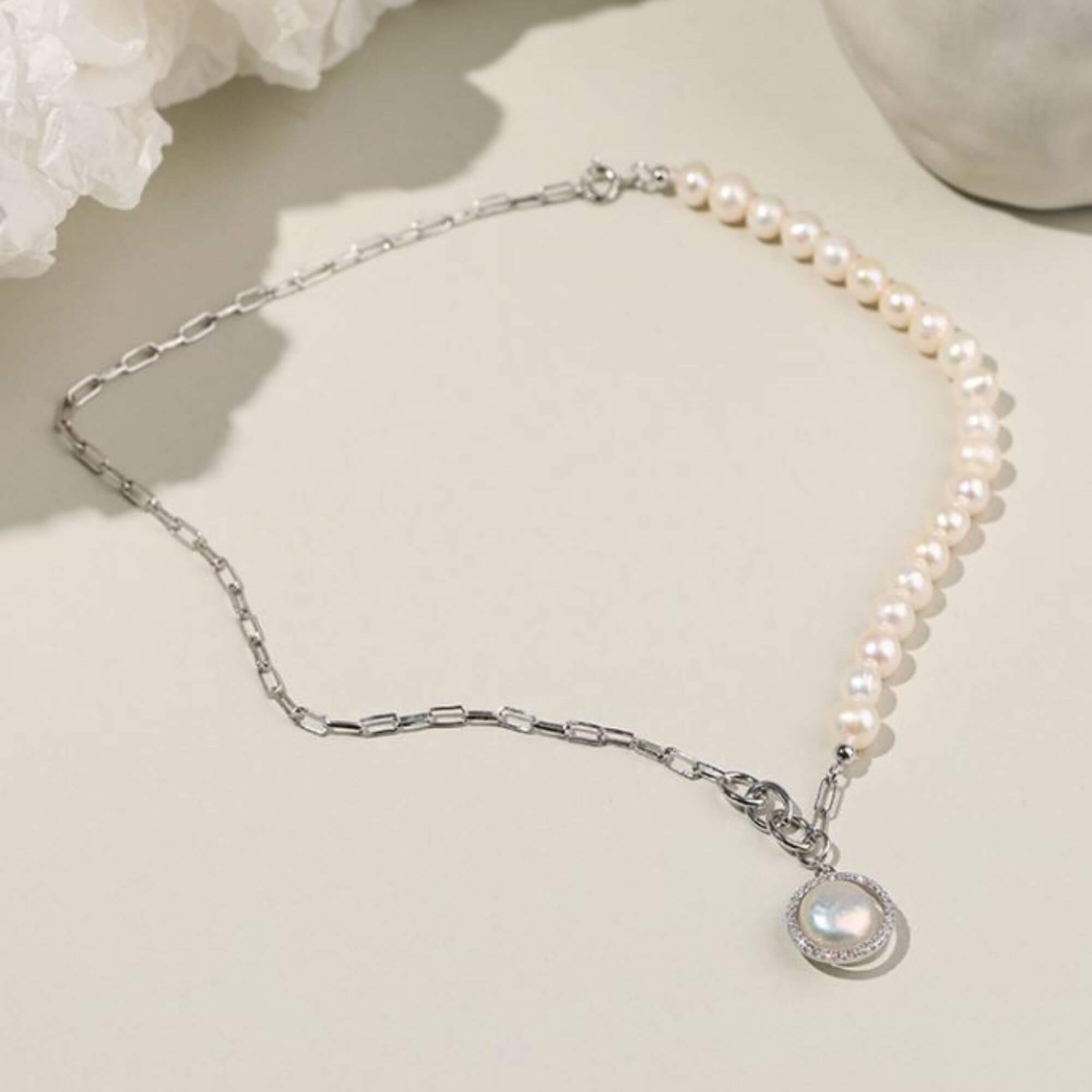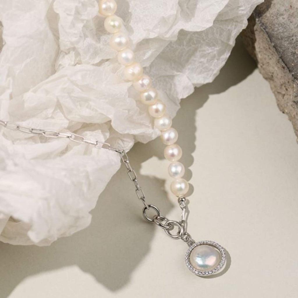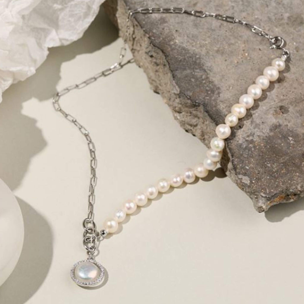 Silver necklace combining elongated chain links with a row of freshwater pearls. A round pendant with a central pearl surrounded by small clear stones completes the piece. The mix of materials creates a contemporary design with a classic influence.