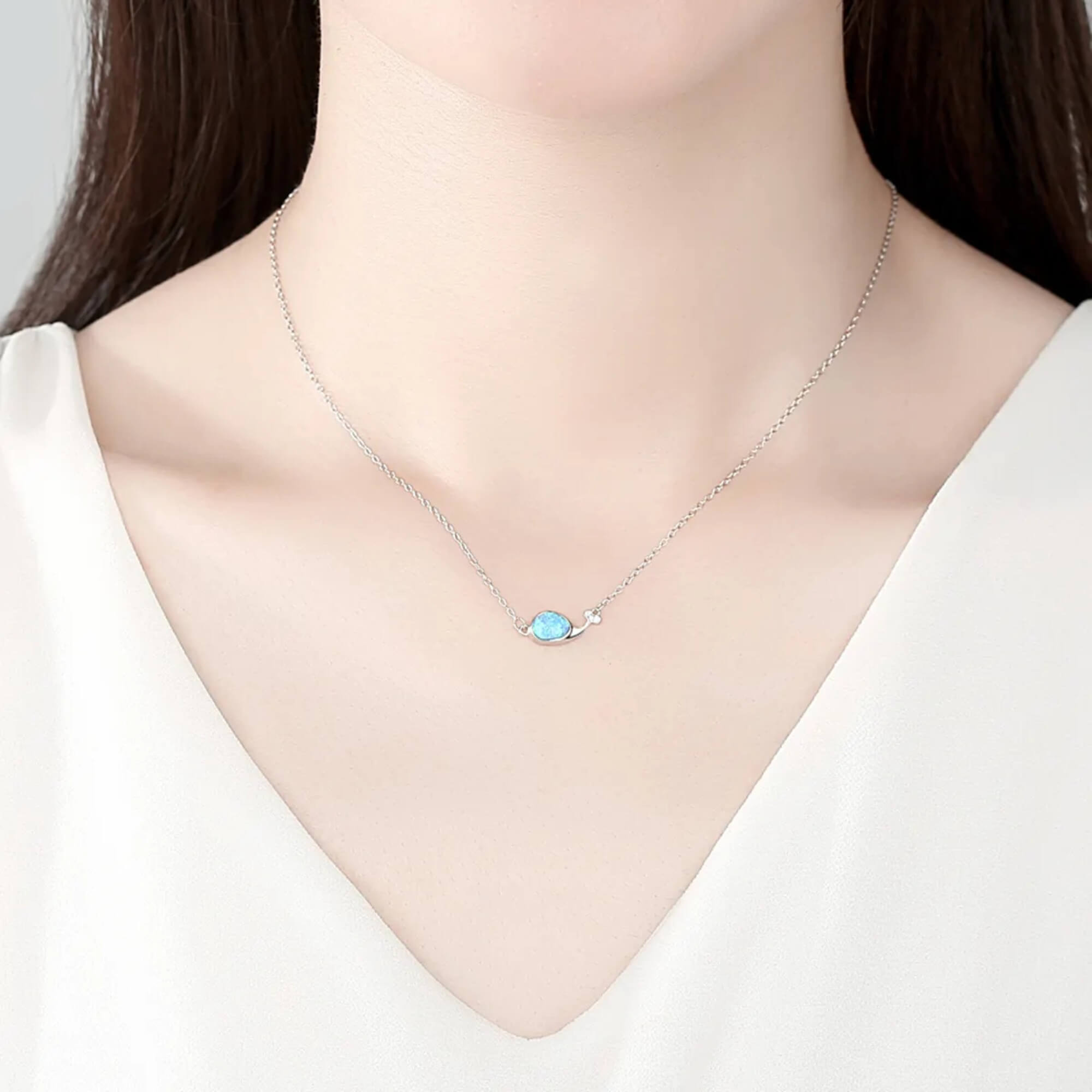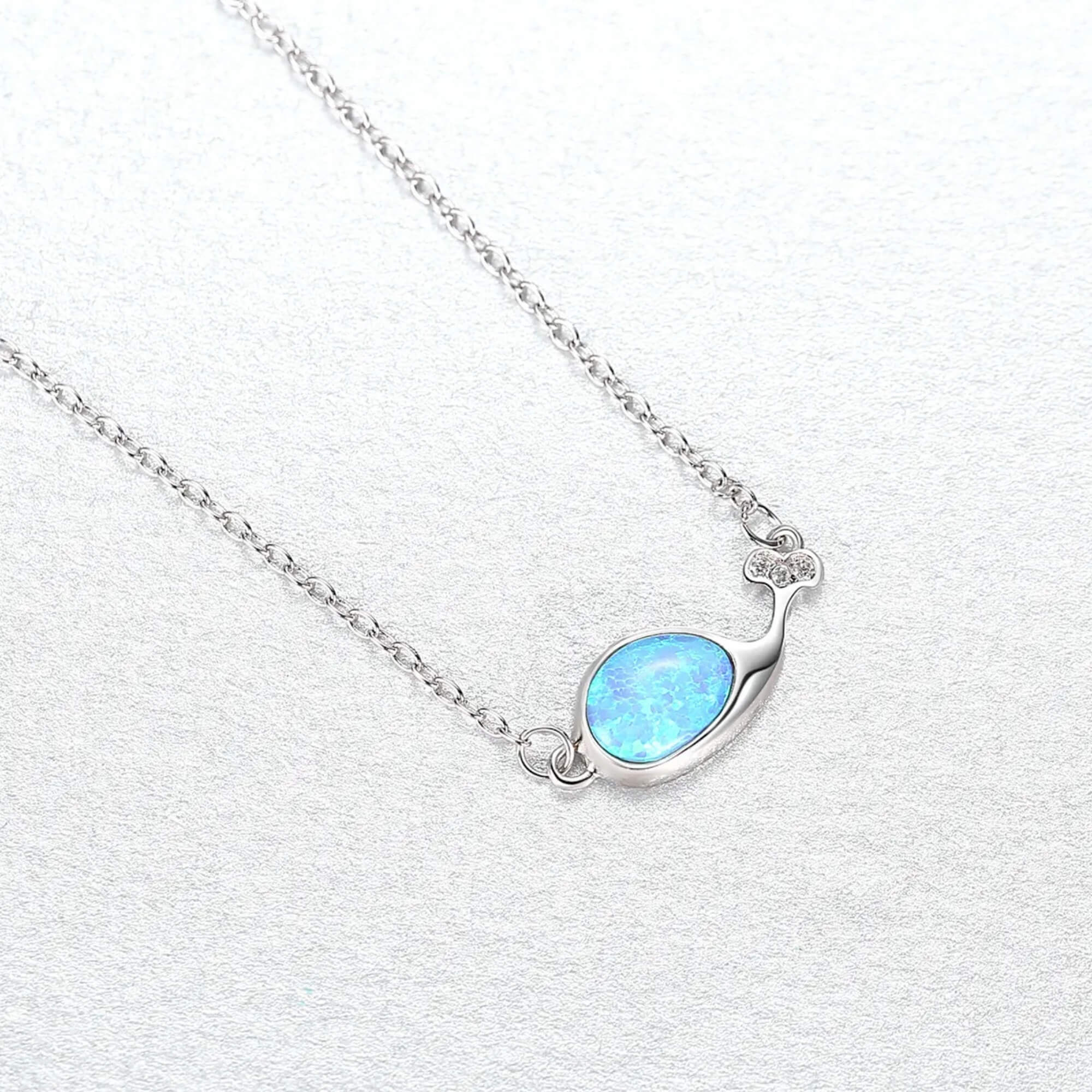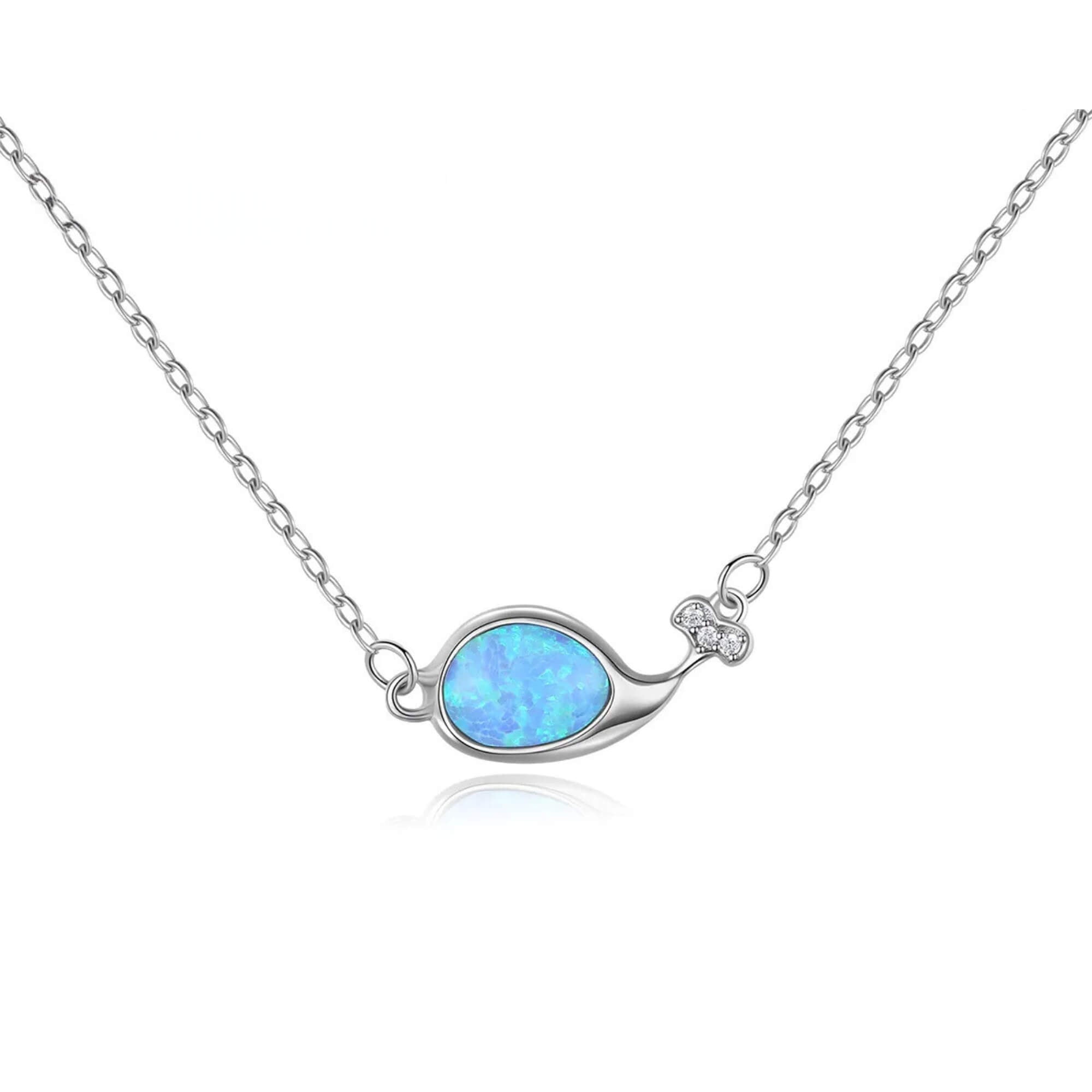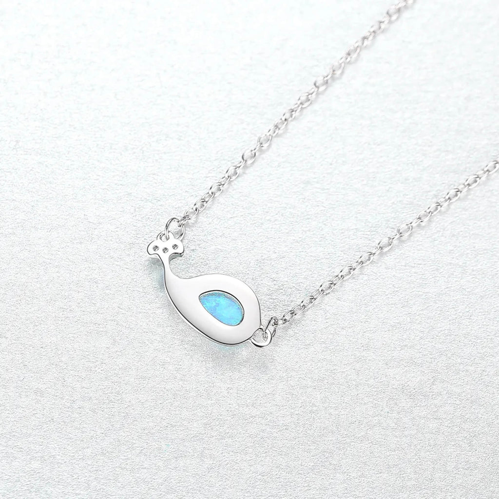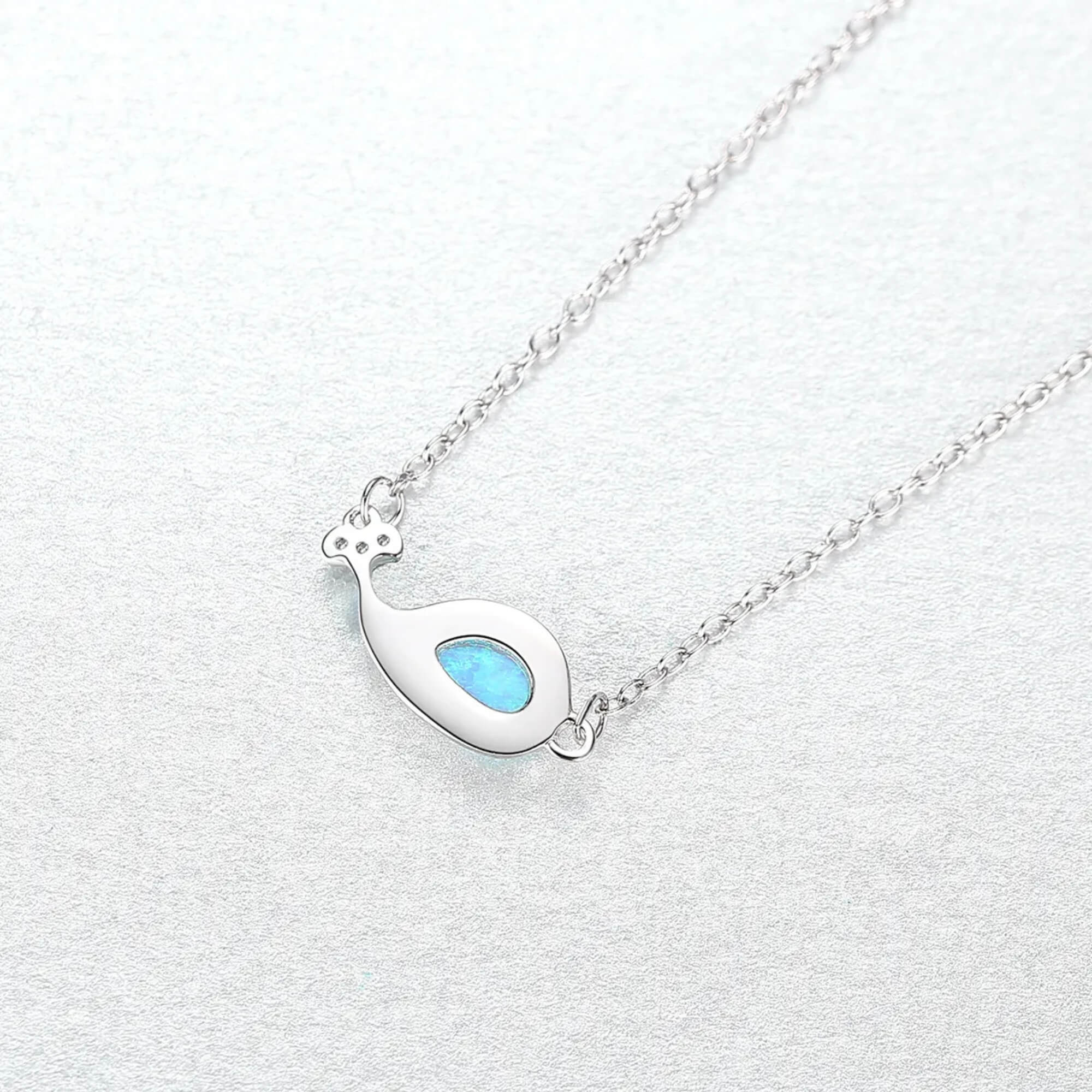 Sterling silver necklace featuring a delicate whale design, set with a captivating blue opal and accented with cubic zirconia stones on the tail. A symbol of freedom and serenity, this piece carries the calm and beauty of the sea, making it a charming choice for ocean lovers.