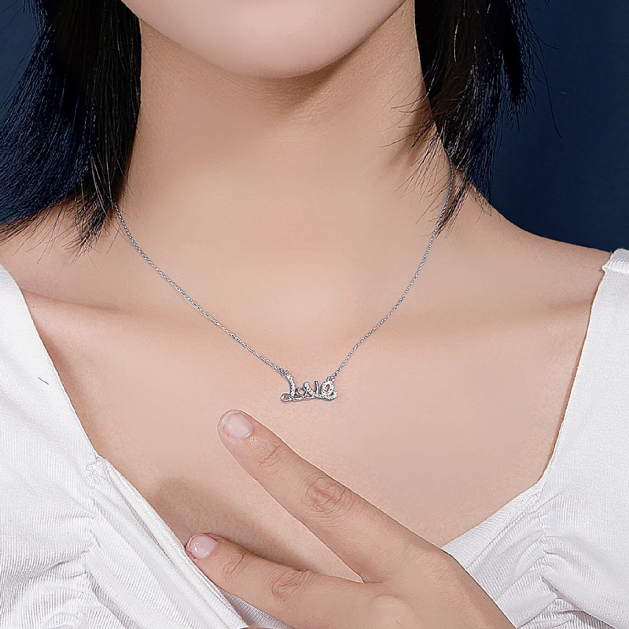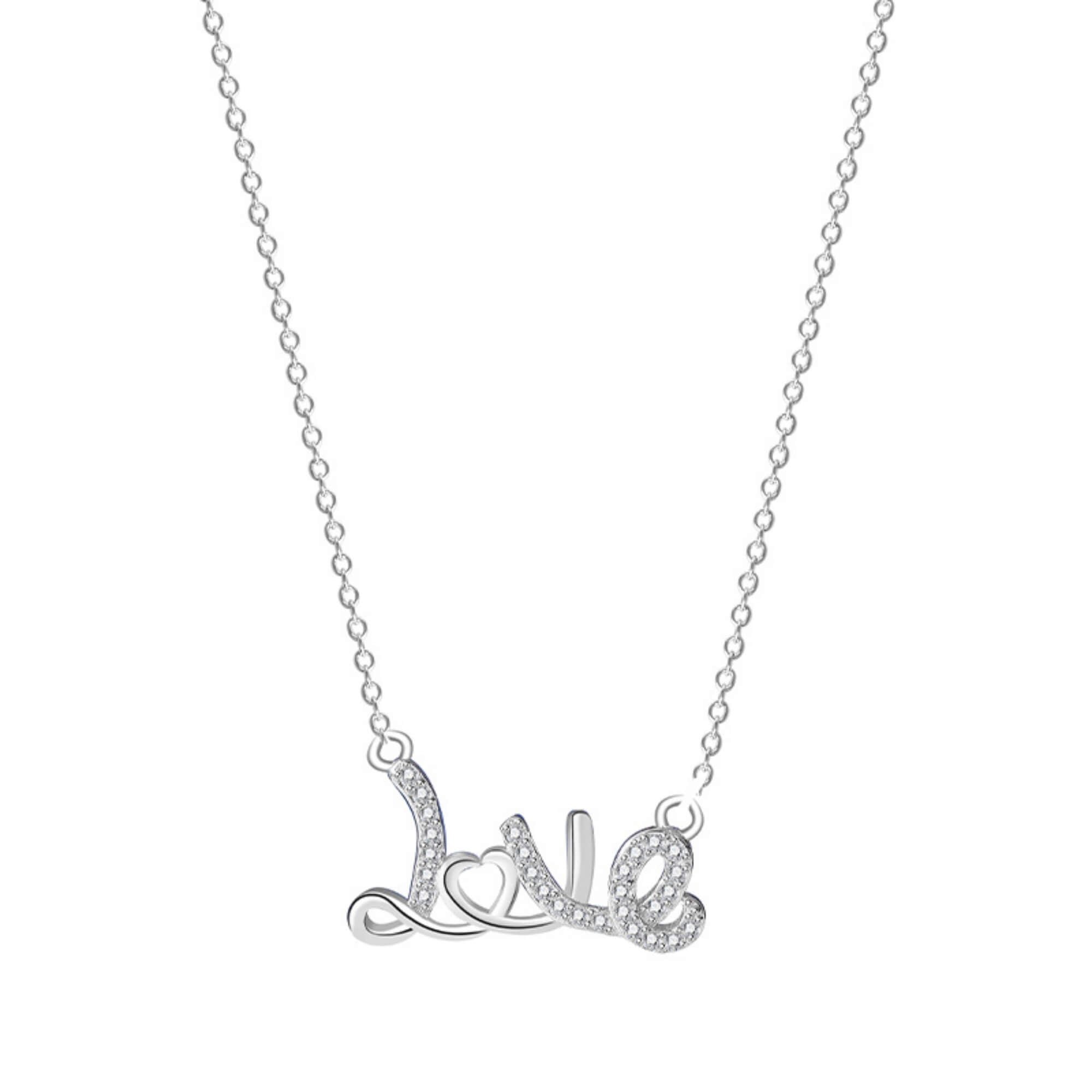 Sterling silver necklace with a pendant spelling the word “Love” in a flowing script, accented with cubic zirconia stones for a gentle sparkle. The heart-shaped detail within the design adds a warm, personal touch, making this piece a meaningful choice whether given as a gift or kept as a daily reminder of someone special.