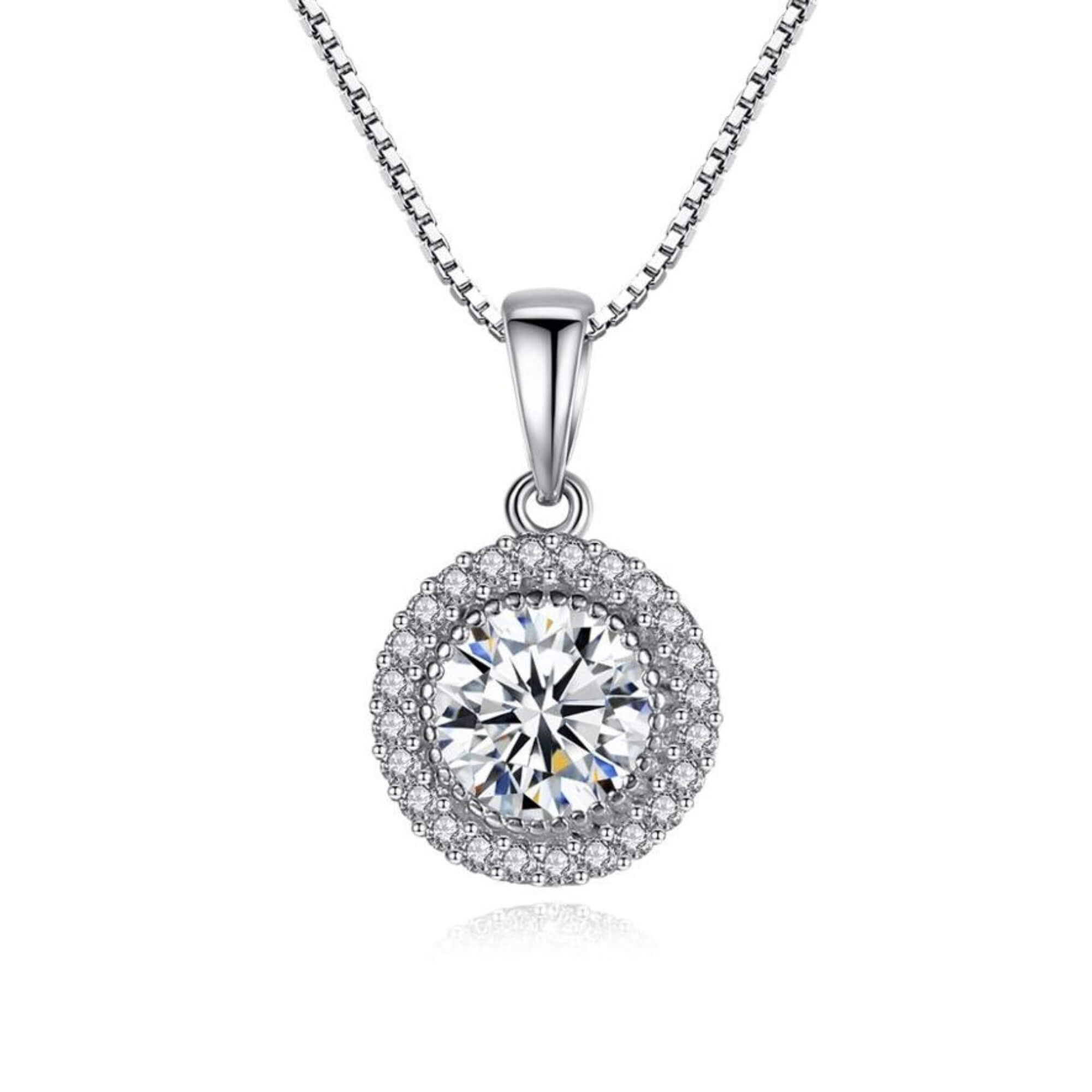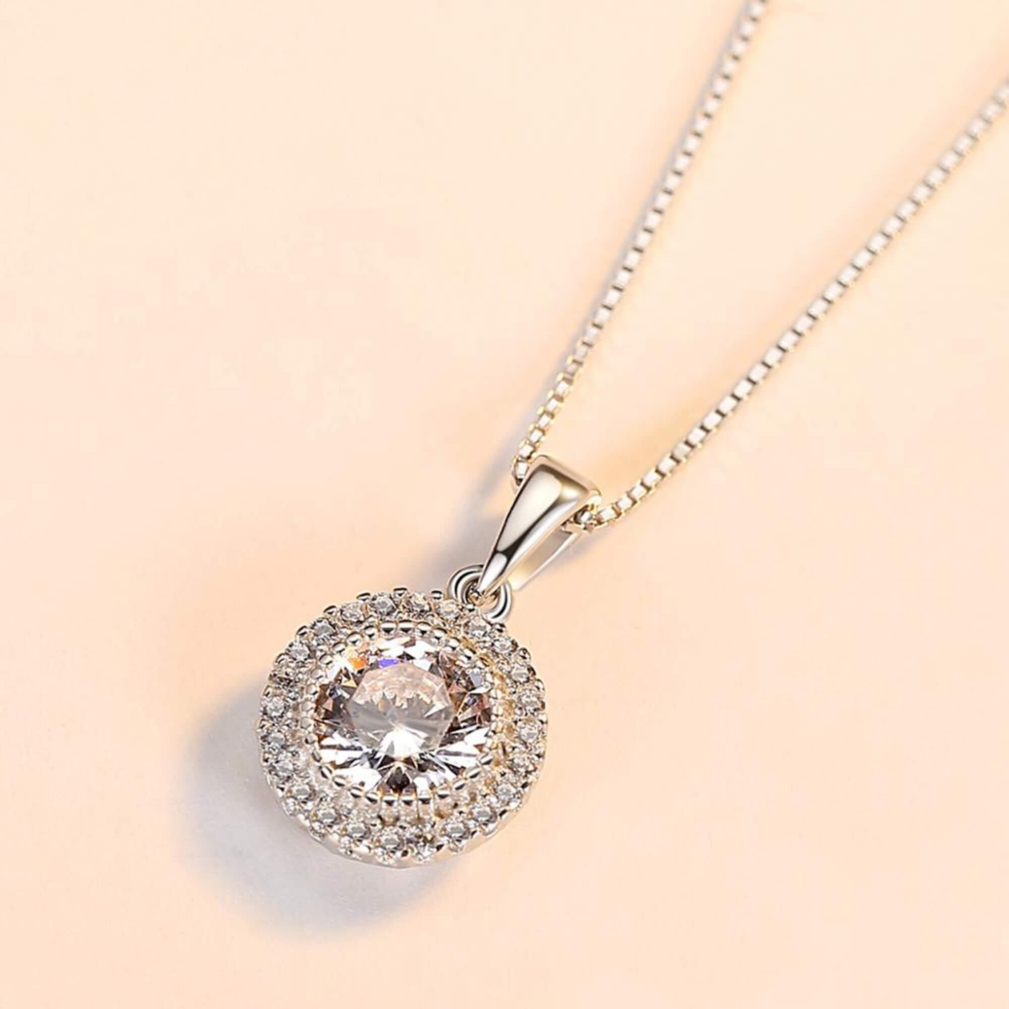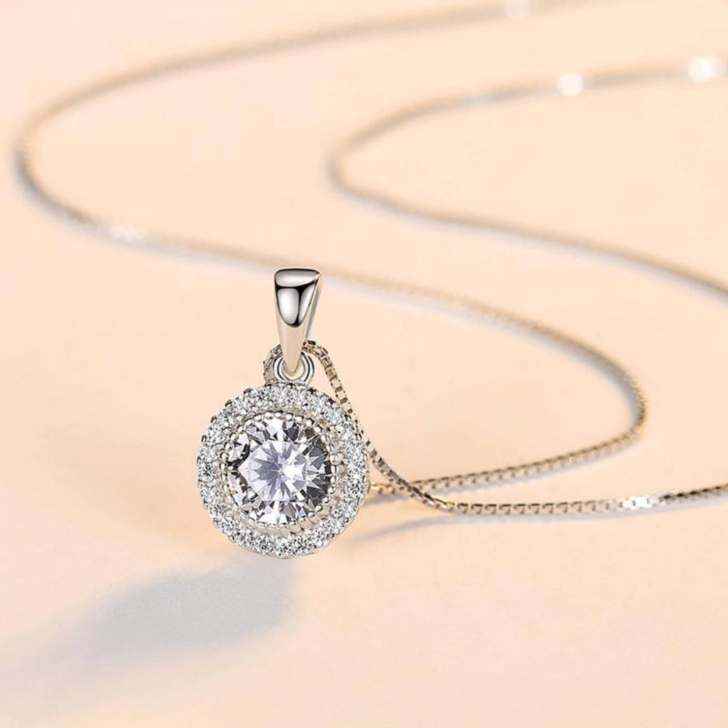 Sterling silver necklace with a box chain and a round pendant centered with a brilliant cubic zirconia, surrounded by a halo of smaller stones. The combination of the bright centerpiece and the surrounding sparkle creates a striking yet timeless design.