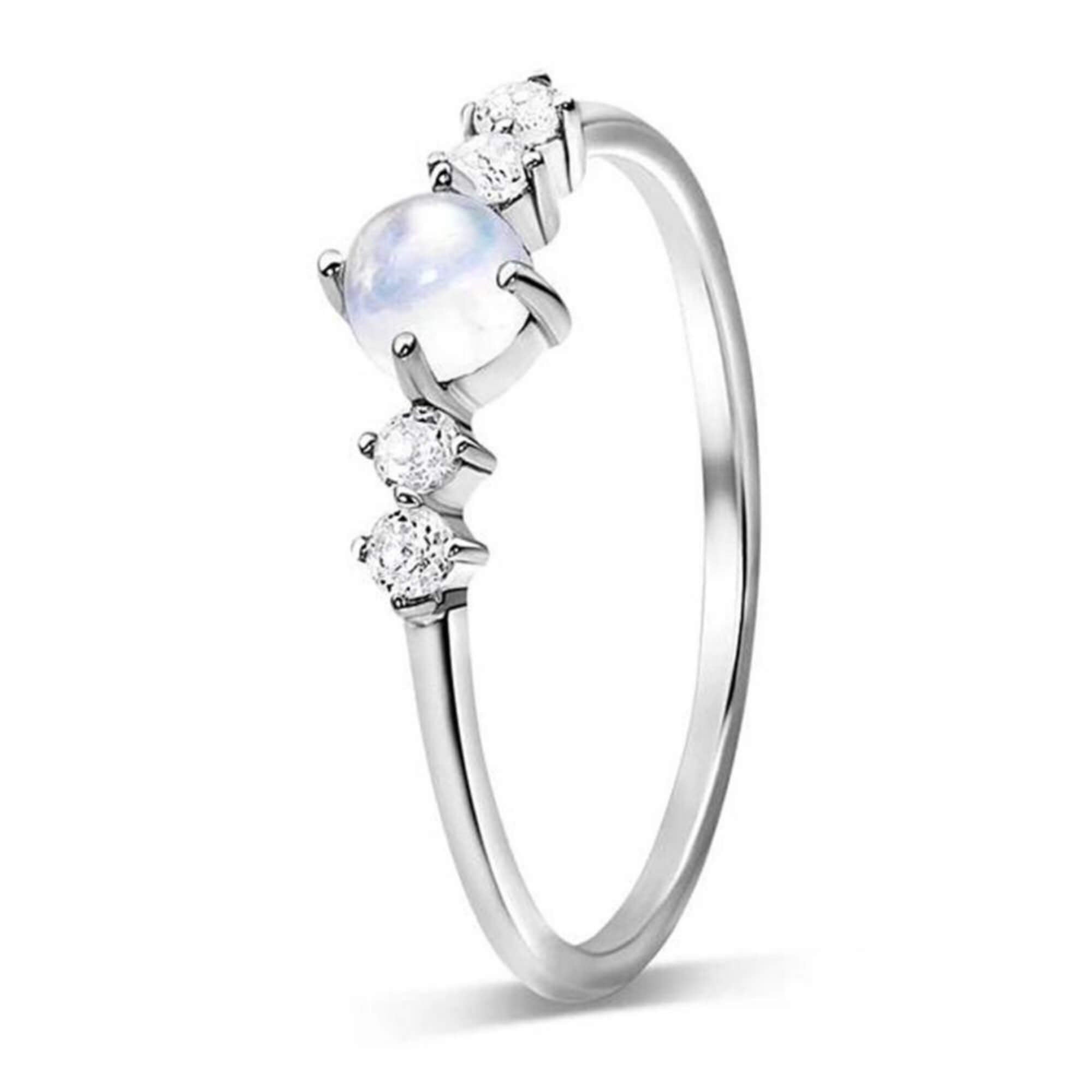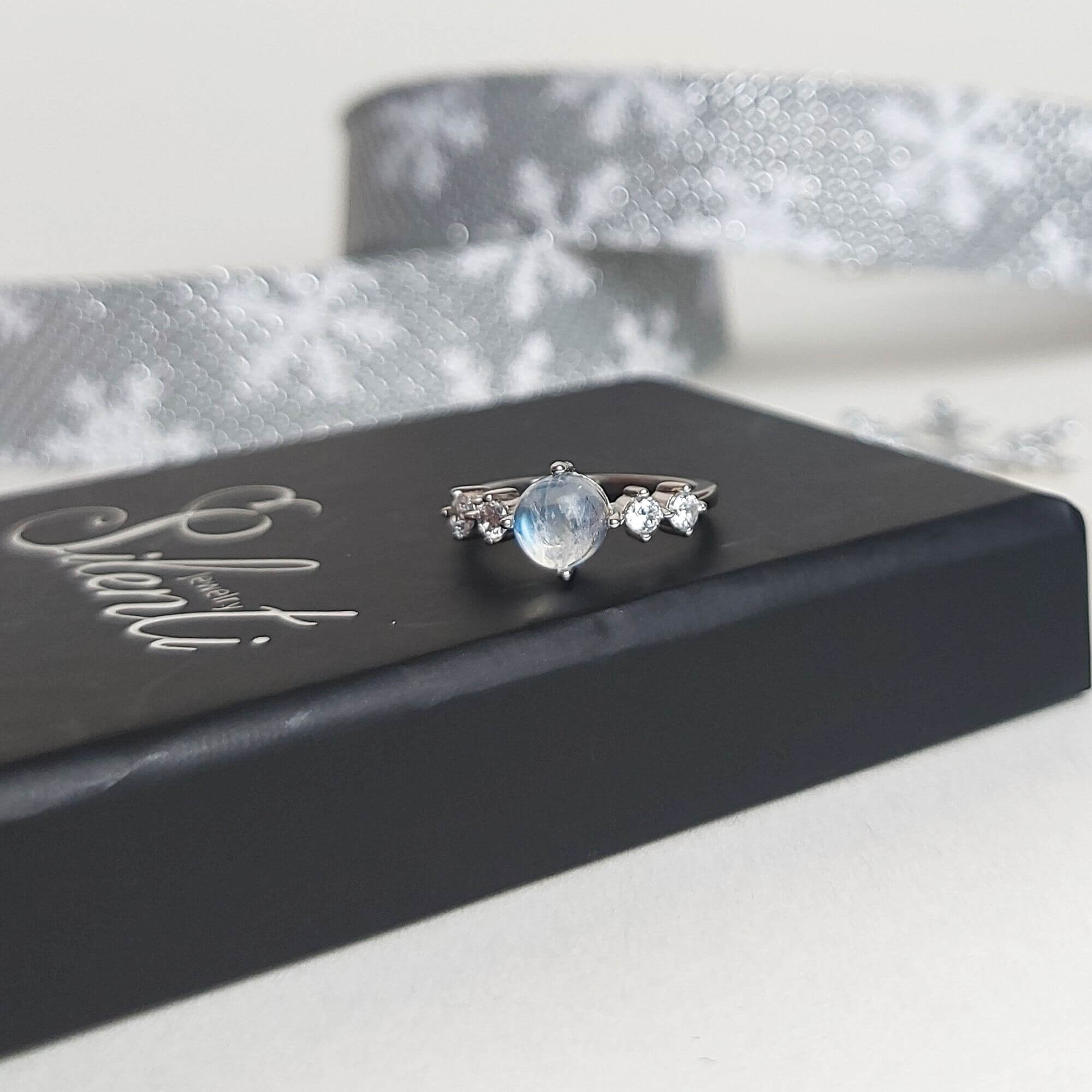 Sterling silver ring with an oval-cut natural moonstone at the center and two small topaz stones on each side. The mix of soft color and clear sparkle gives the ring a calm, balanced look.