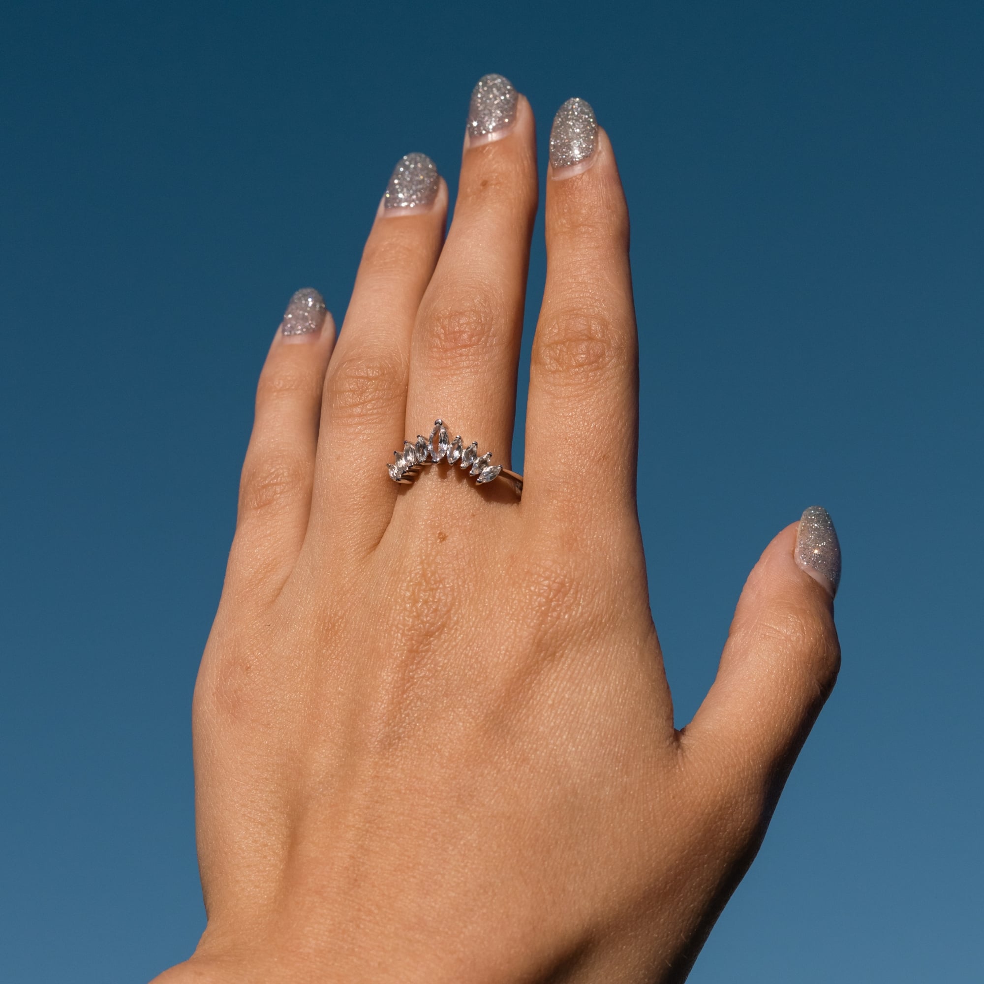 Sterling silver ring set with nine topaz gemstones in a mix of shapes. The varied arrangement adds color and energy, offering a design that feels both vibrant and intentional. A distinctive piece for those who enjoy jewelry with personality.