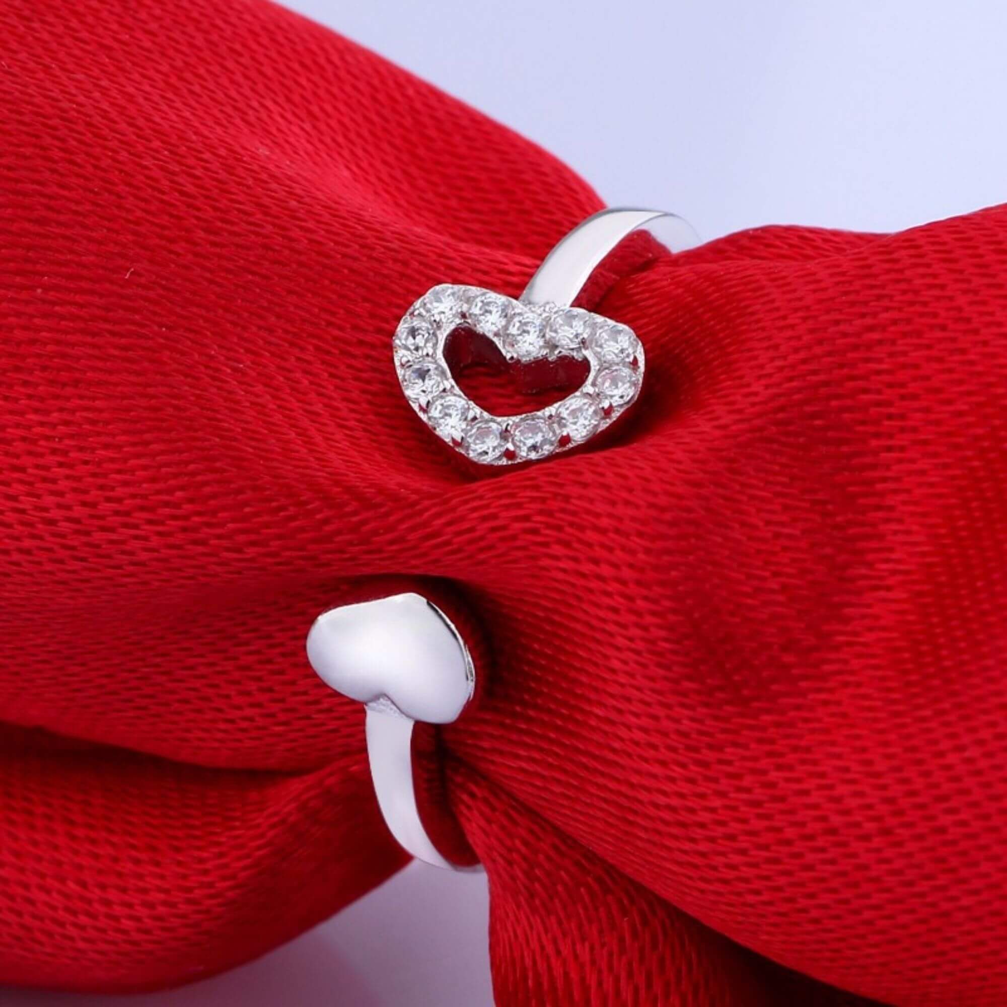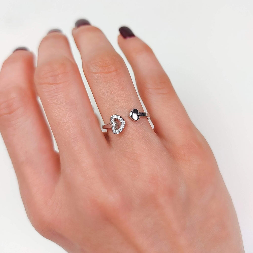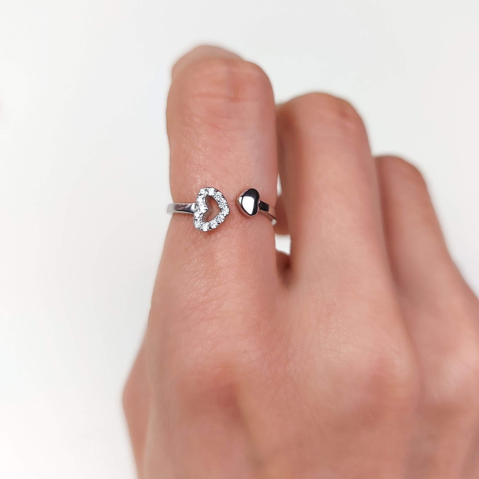 Sterling silver ring with two hearts at each end of the open band. One is solid, the other outlined with small cubic zirconia stones. The adjustable design allows for a flexible fit, making it easy to wear across different sizes.