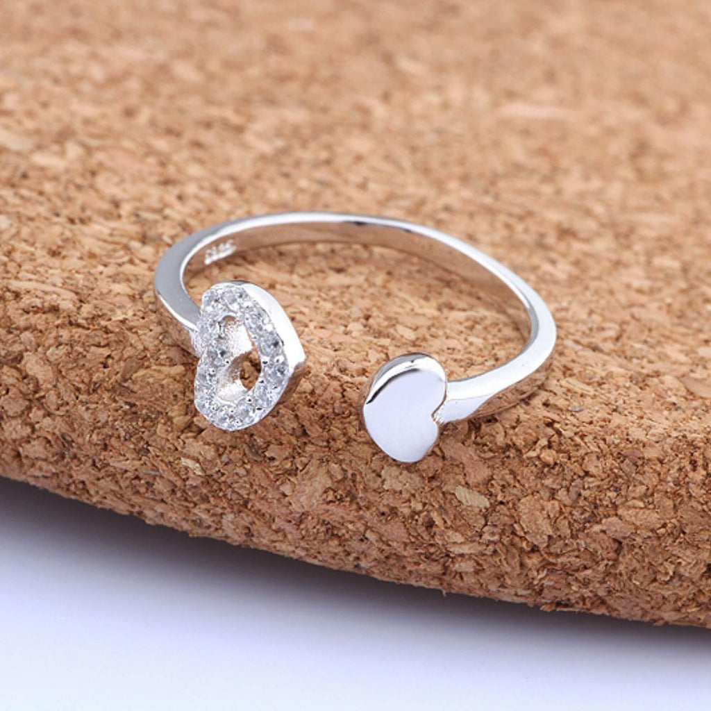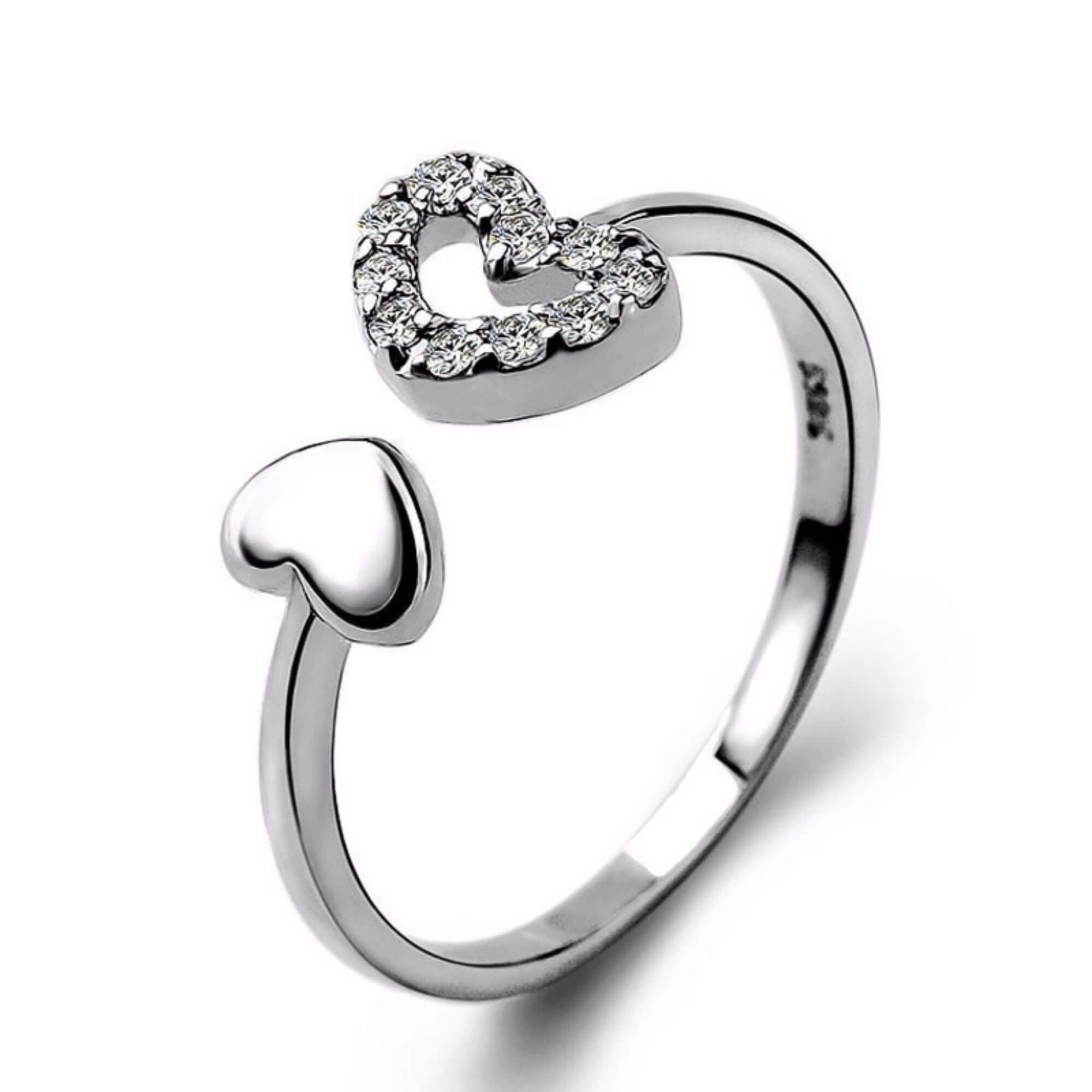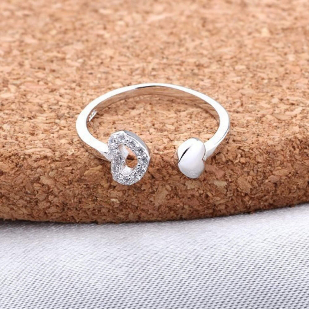 Sterling silver ring with two hearts at each end of the open band. One is solid, the other outlined with small cubic zirconia stones. The adjustable design allows for a flexible fit, making it easy to wear across different sizes.