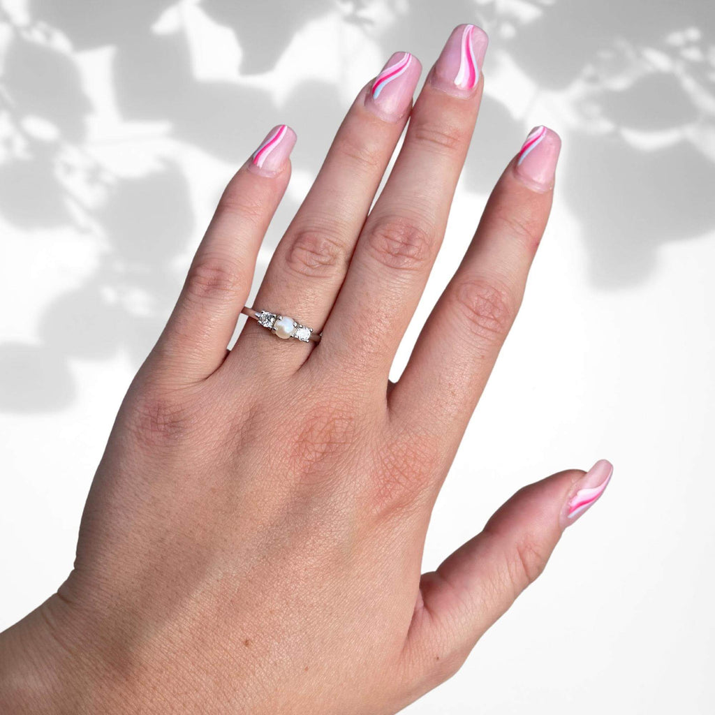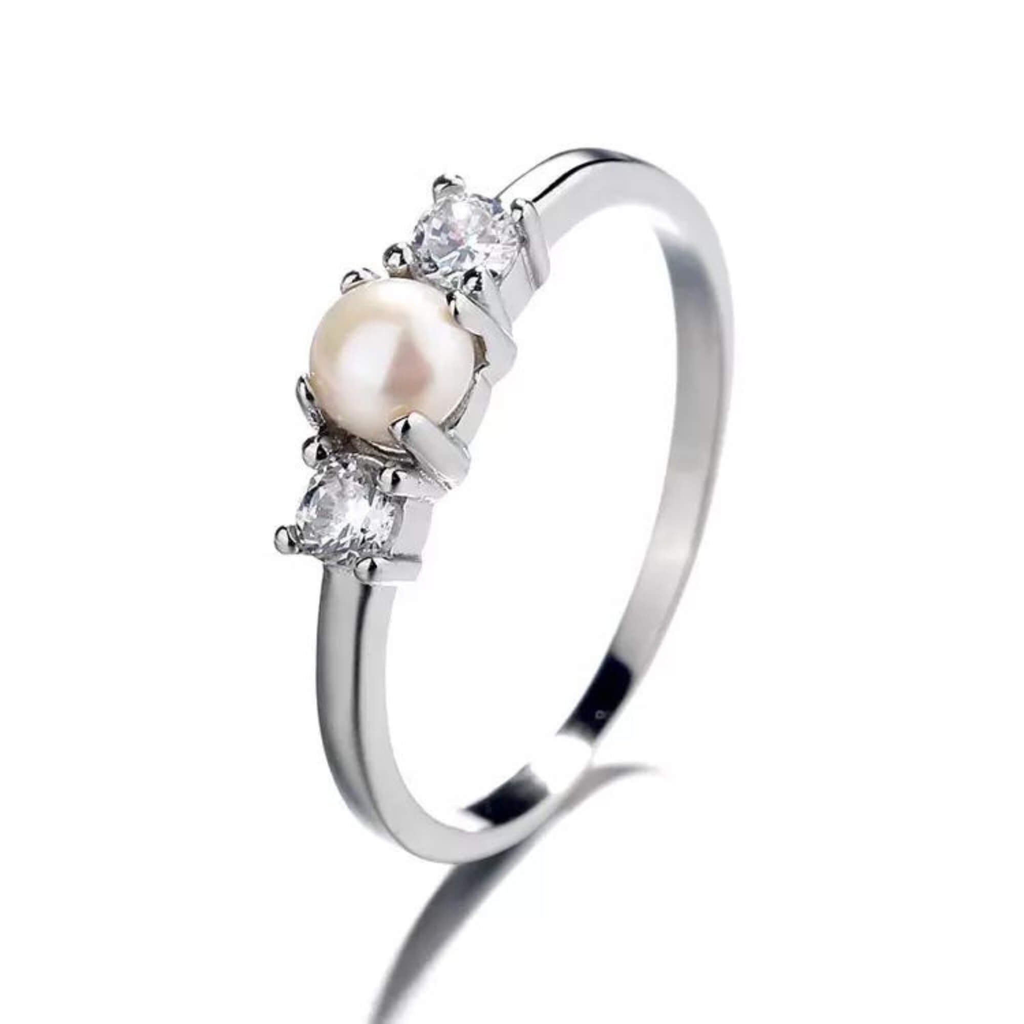 Sterling silver ring with a single pearl framed by two clear cubic zirconia gemstones. The mix of soft luster and light-reflective detail gives the piece a timeless quality with a contemporary edge.