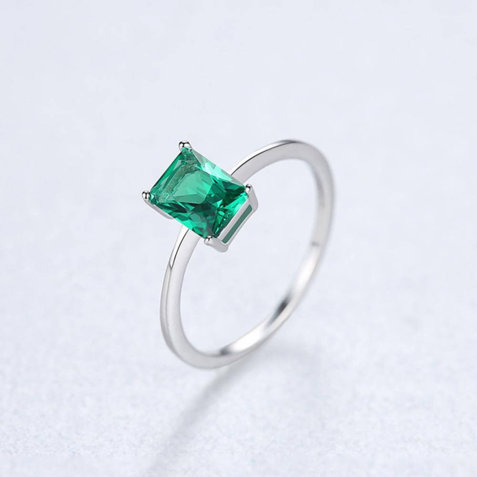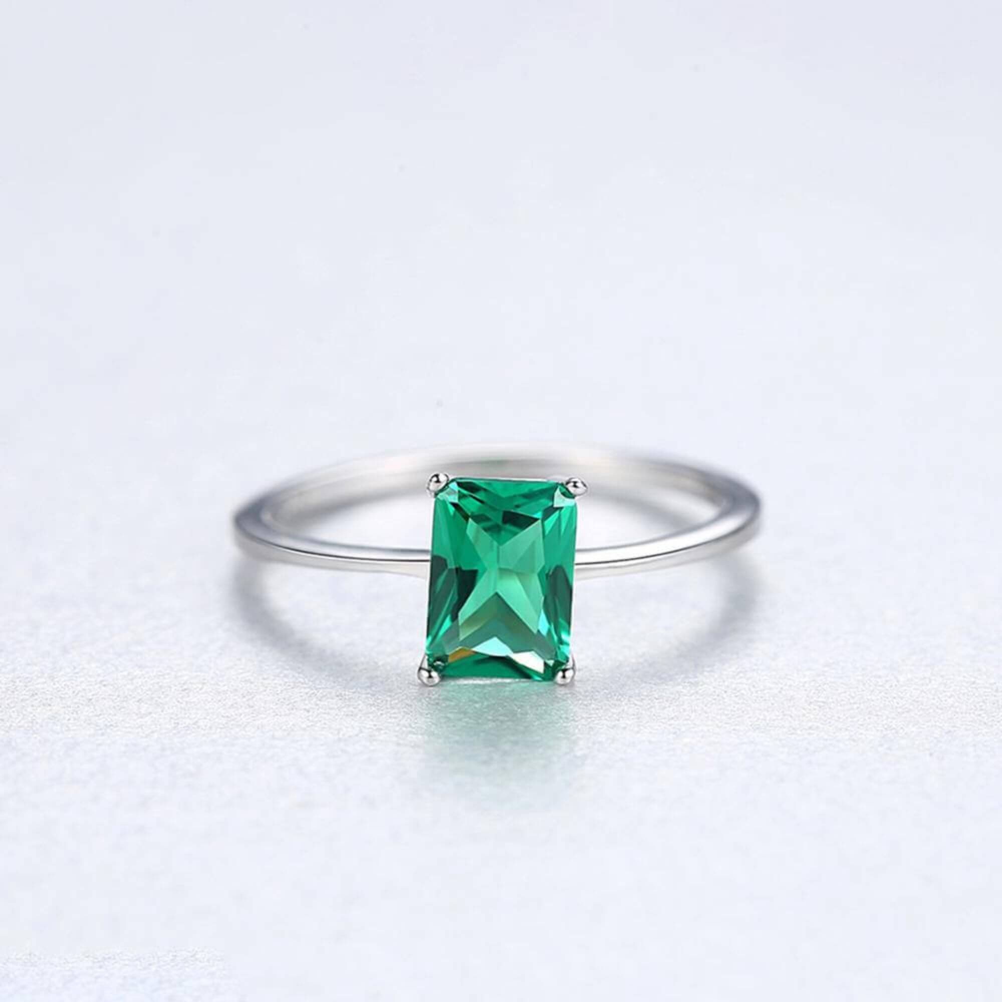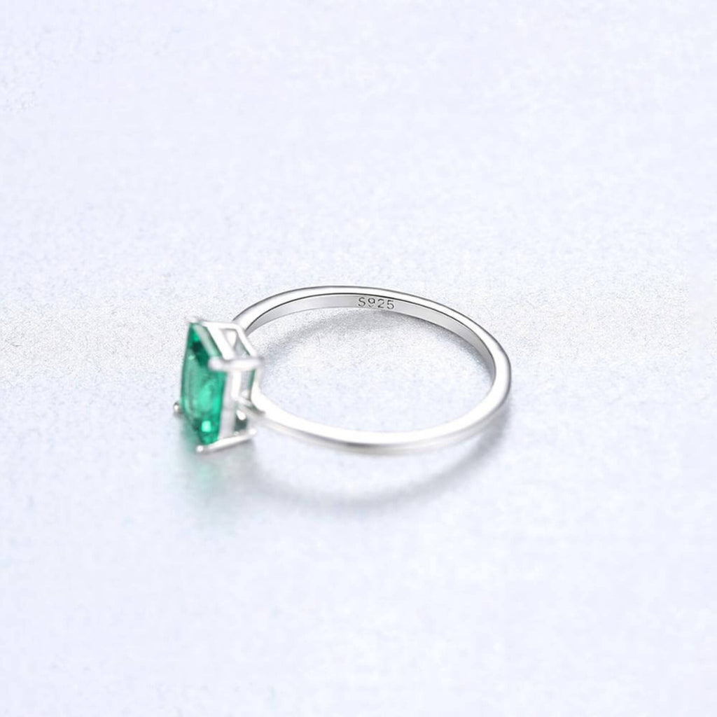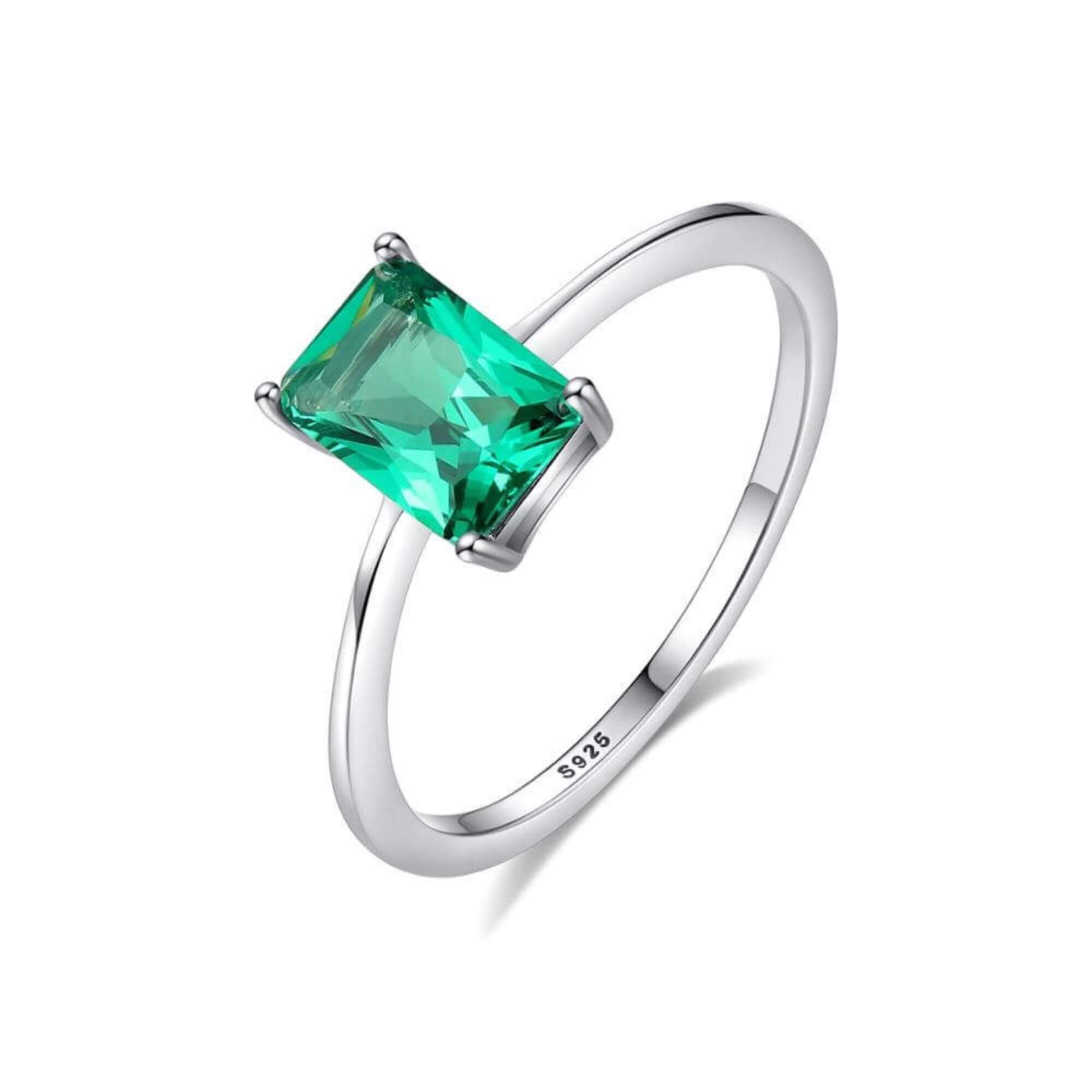 Sterling silver ring centered with a rectangular green crystal. Its straight shape and simple setting make it a versatile piece, easy to dress up or wear casually.