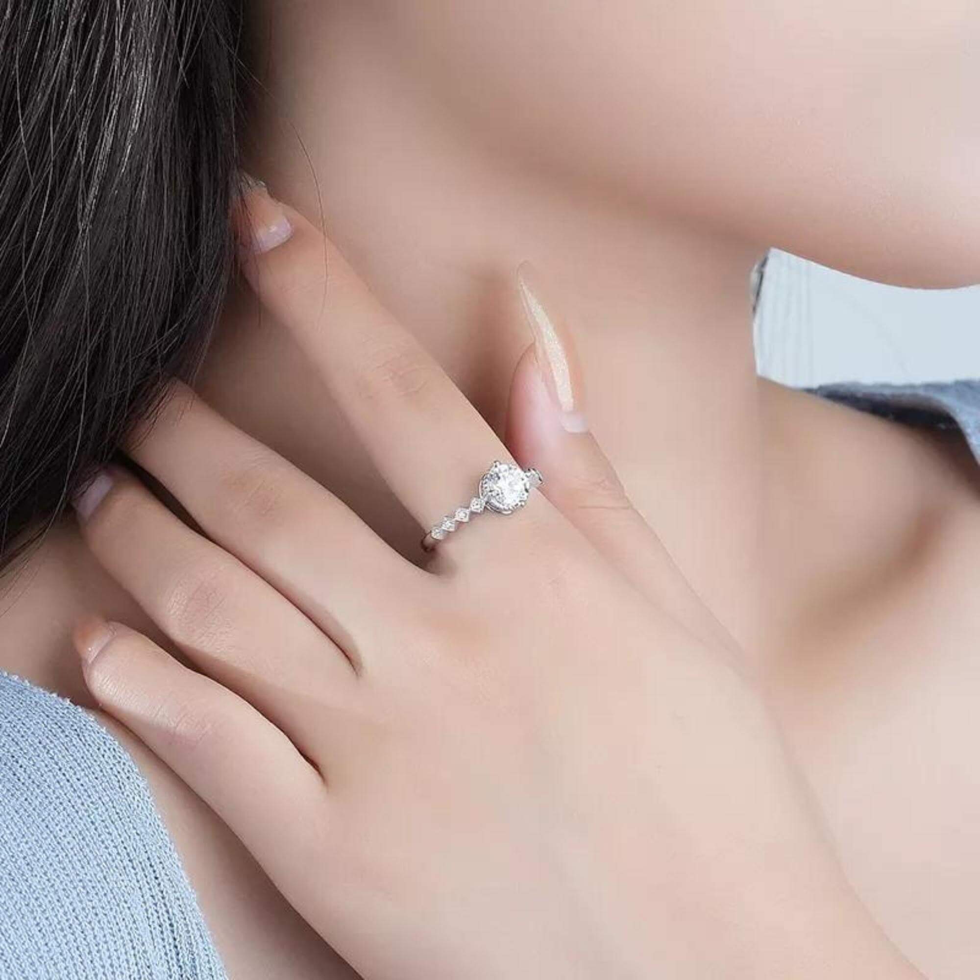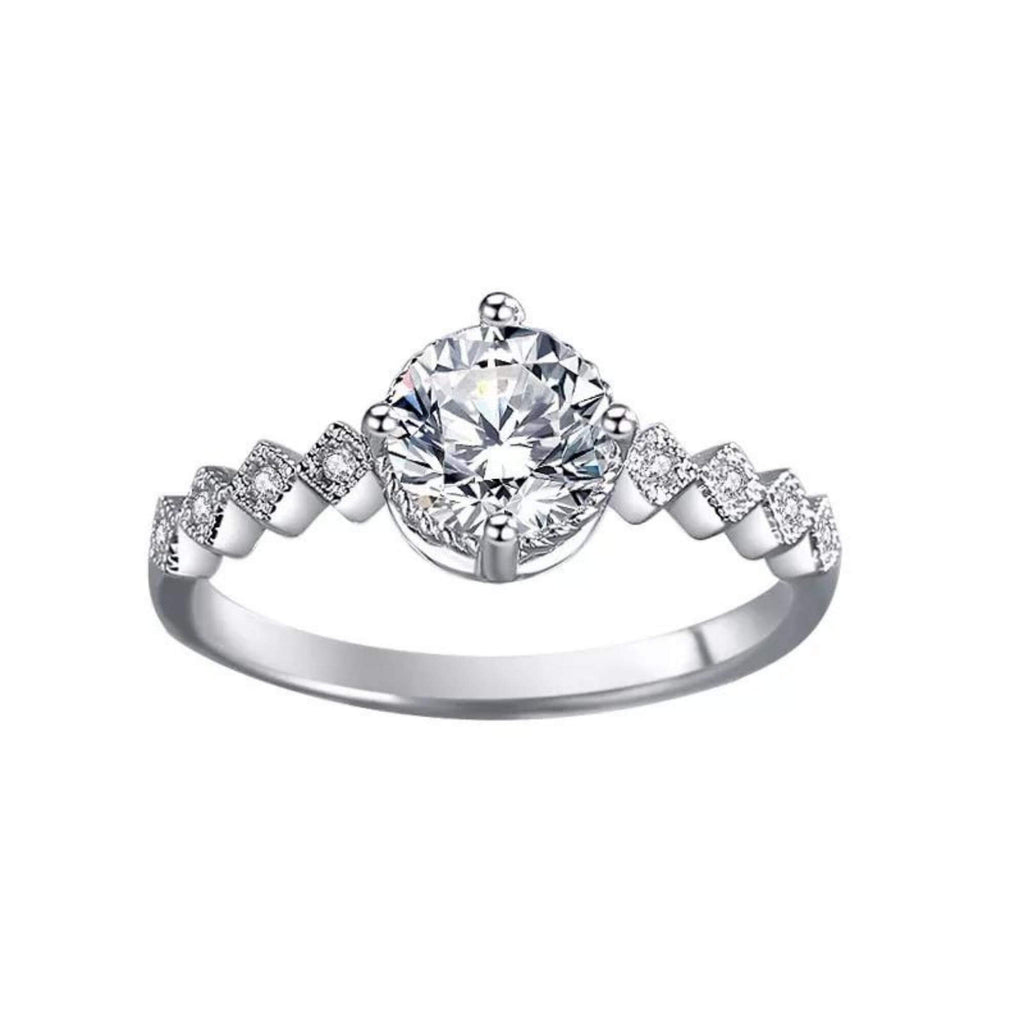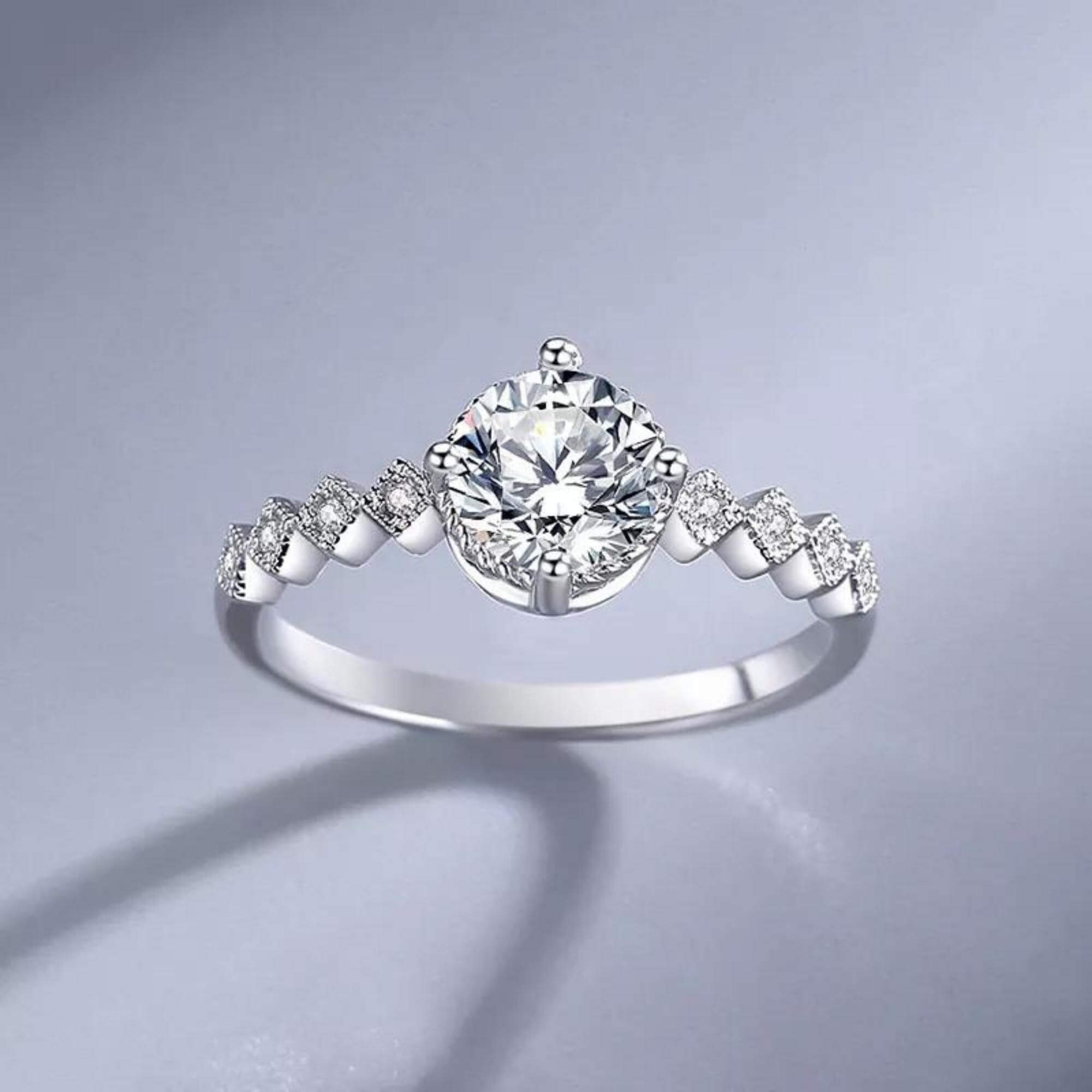 Sterling silver ring featuring a one-carat moissanite at the center, framed by a staggered row of cubic zirconia that highlights its sparkle. A standout design that blends modern edge with lasting elegance.