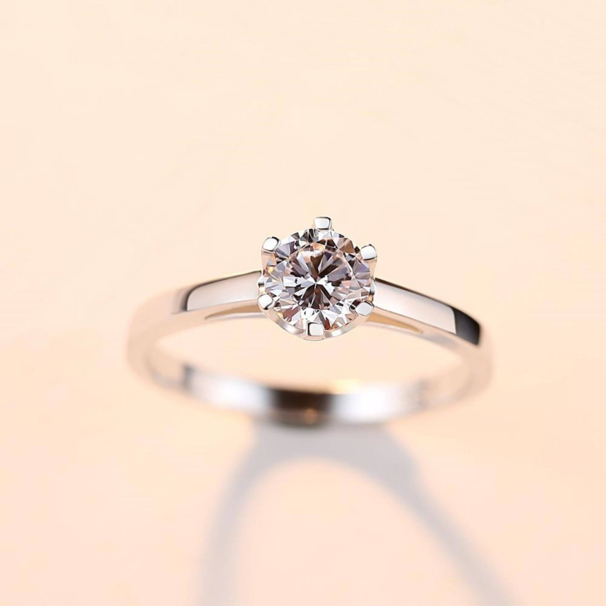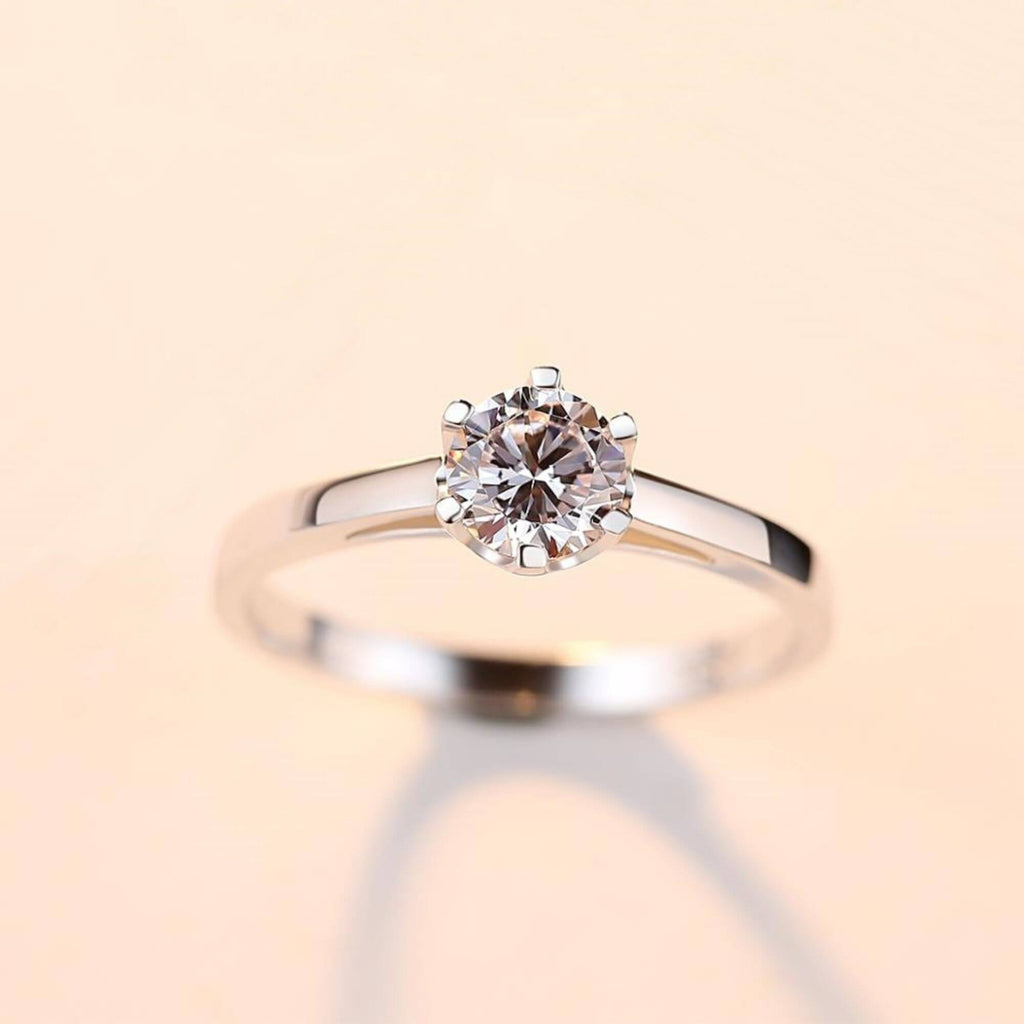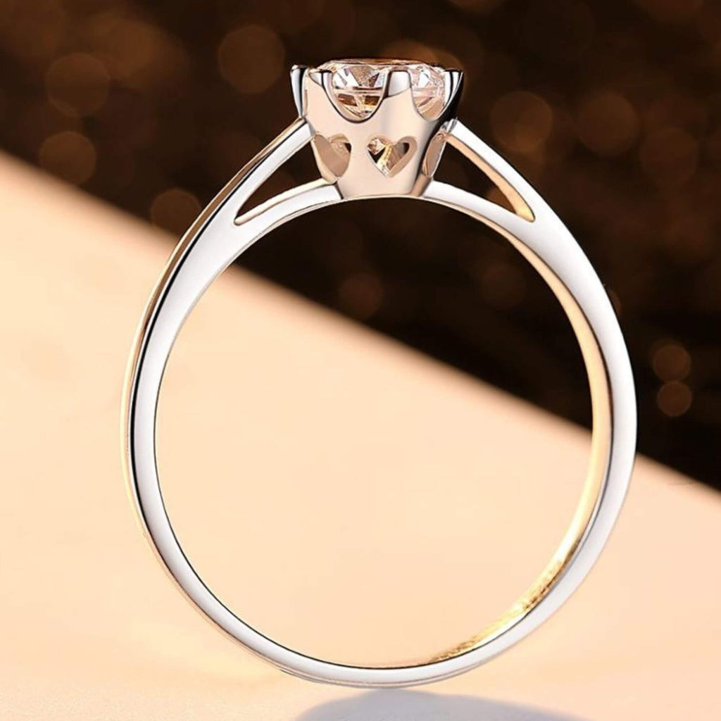 Sterling silver ring with a round cubic zirconia held in a classic six-prong setting. Look closely and you will find heart-shaped cutouts beneath the stone, adding a personal touch to an otherwise timeless design.