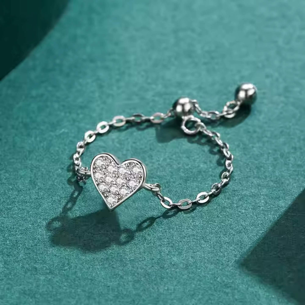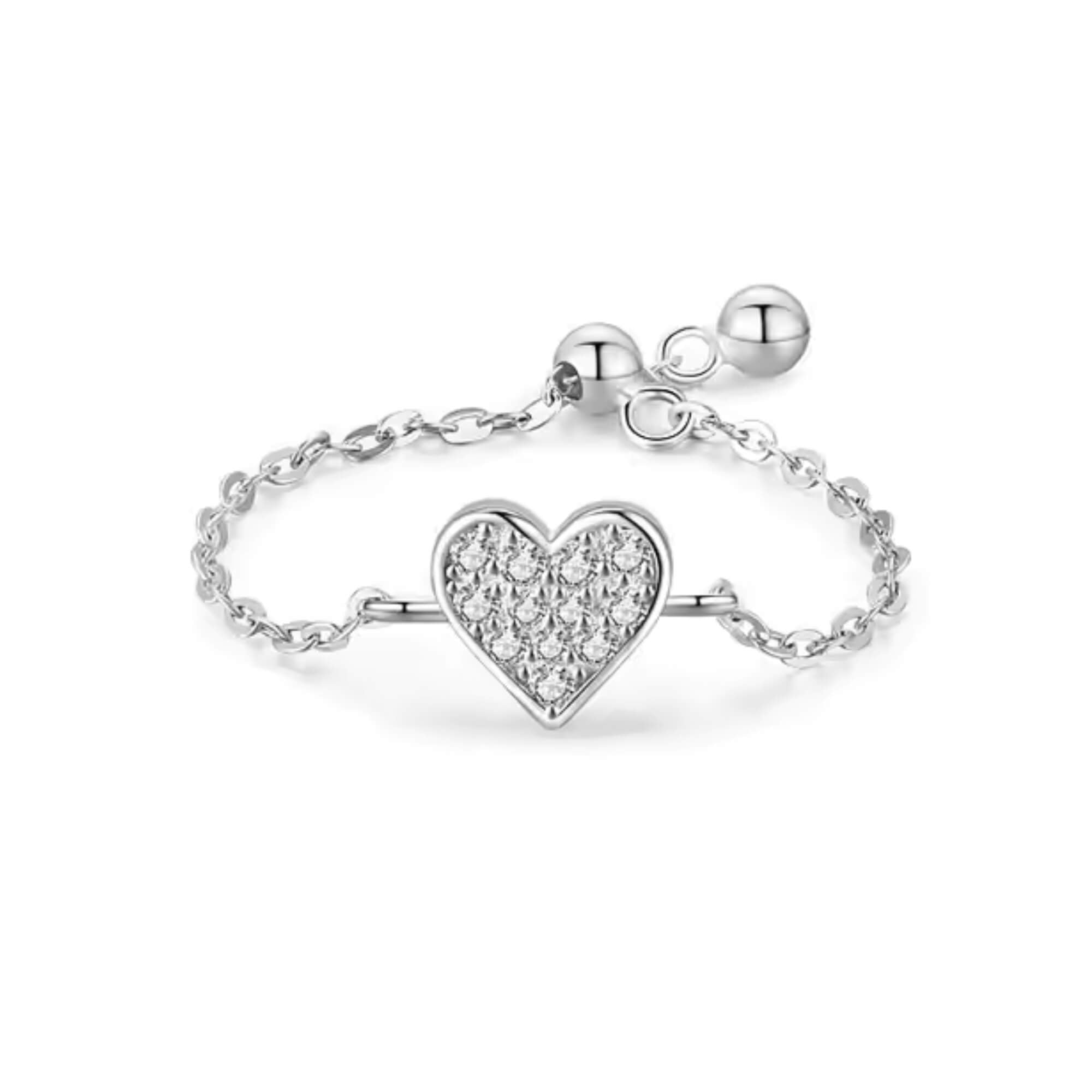 Sterling silver ring with a heart-shaped centerpiece set with cubic zirconia, attached to a delicate chain and finished with an adjustable slider. The design keeps the look contemporary and easy to wear, while the sparkling heart brings the perfect amount of sentiment.