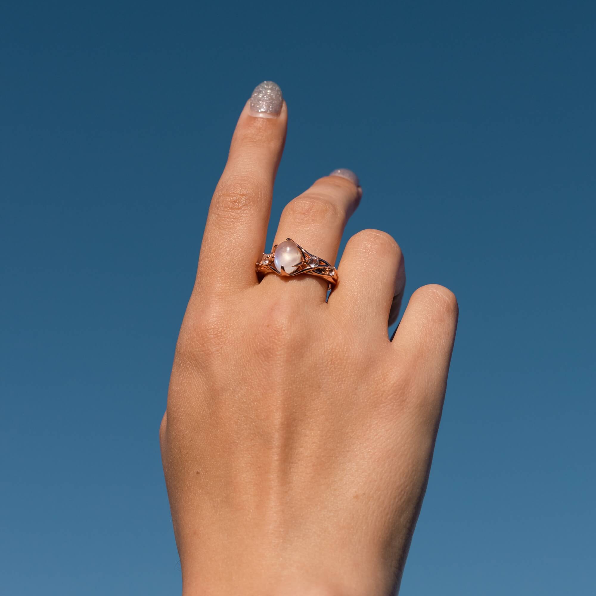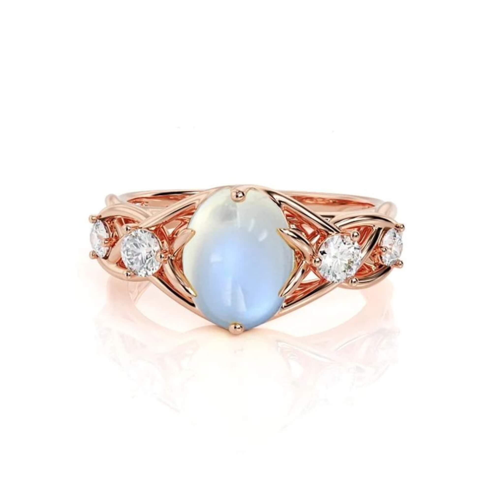 Sterling silver ring plated in rose gold, featuring a natural moonstone with a soft, shifting glow. Four white topaz stones are set along the sides, adding contrast and clarity. The openwork design feels light and thoughtful, giving the ring a distinctive look that draws on both elegance and ease.
