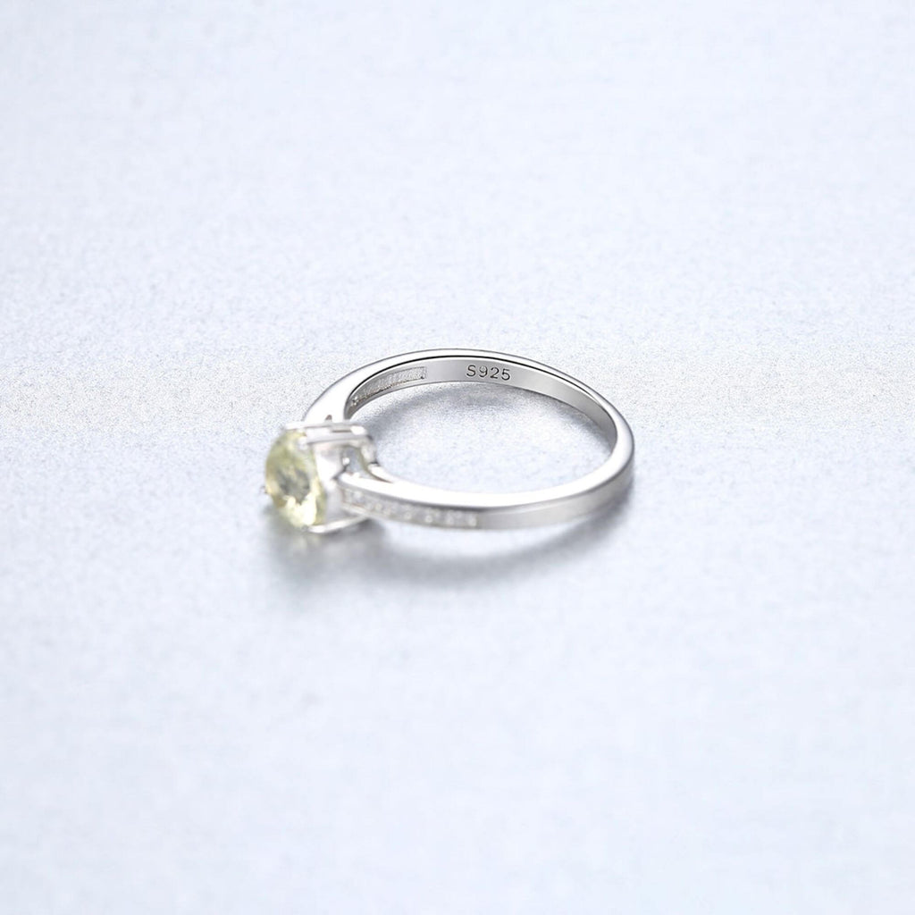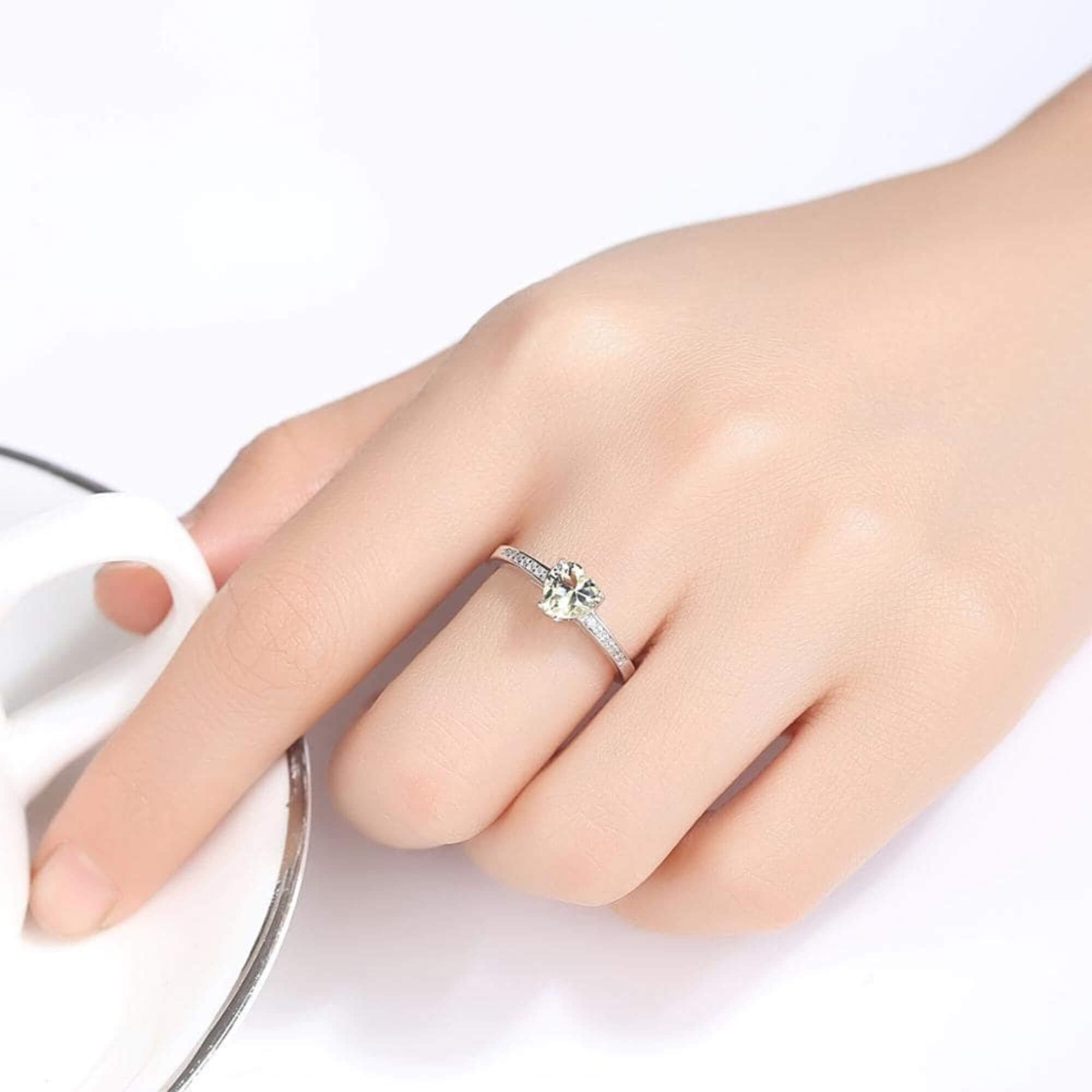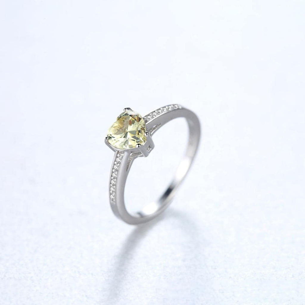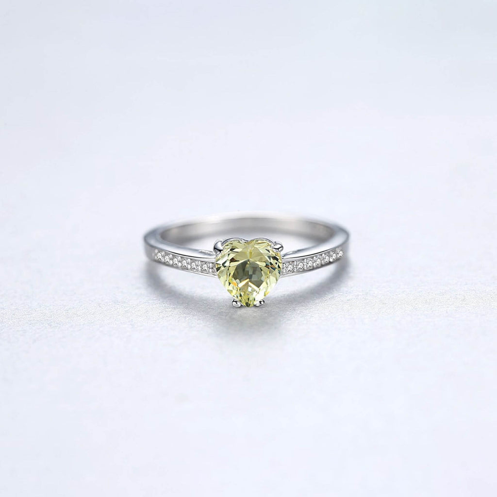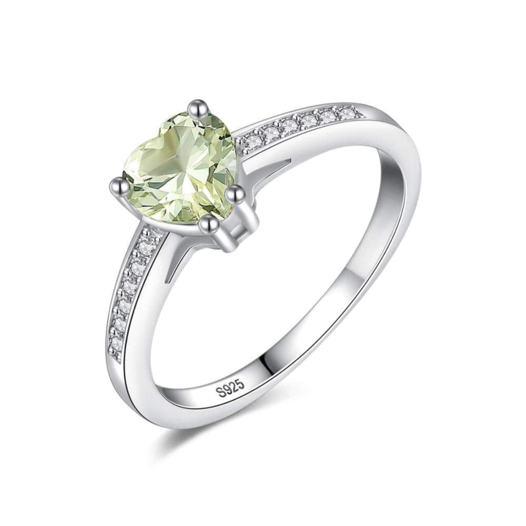 Sterling silver ring featuring a pale green, heart-shaped cubic zirconia. The soft color and romantic shape are complemented by small descending stones along the base, giving the piece a delicate finish.