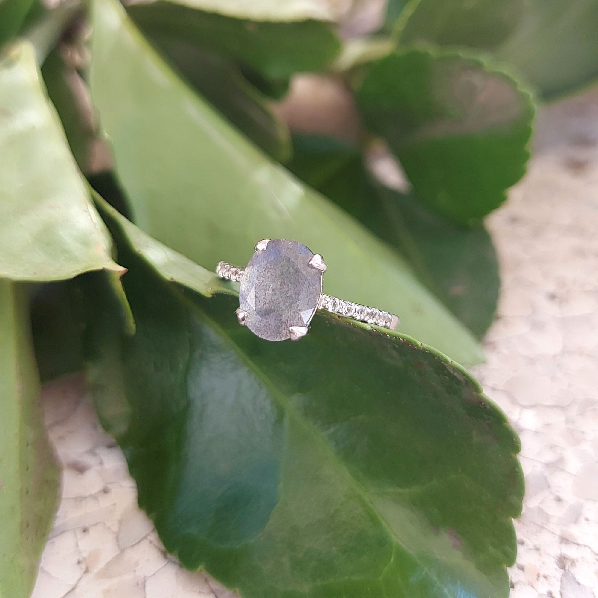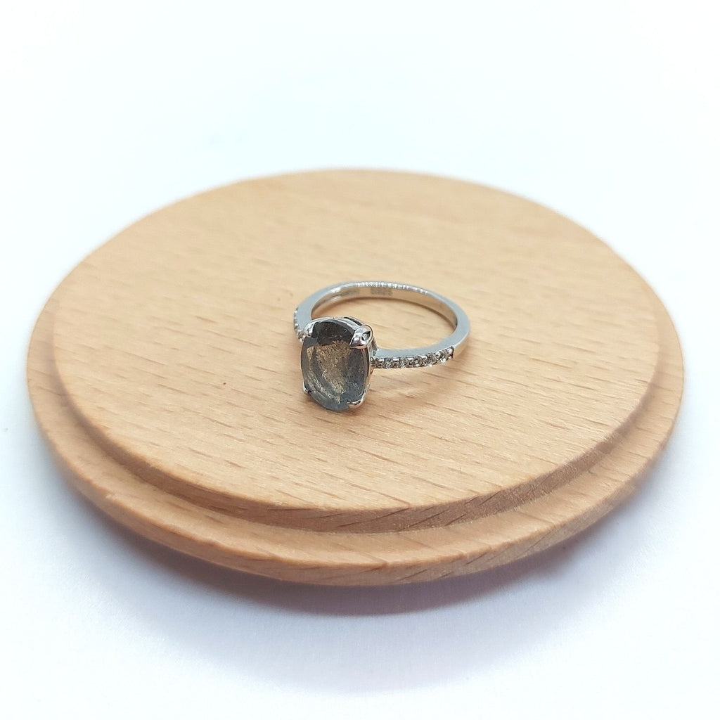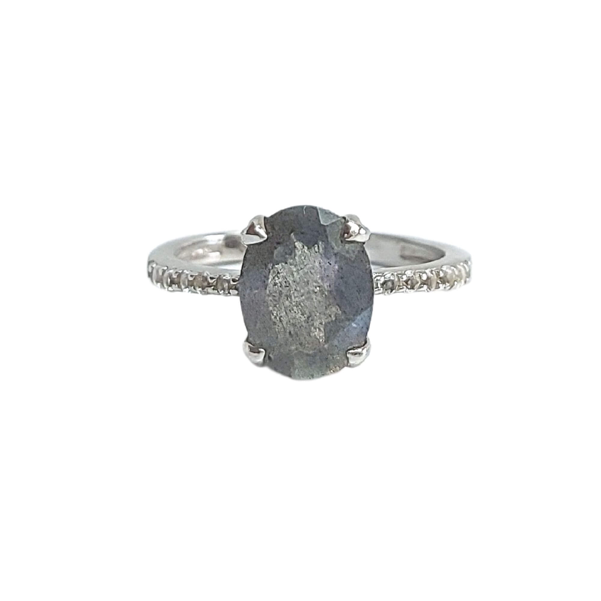 Sterling silver ring featuring natural labradorite, known for its shifting tones and inner glow. Paired with white topaz, the combination creates a design that feels calm yet bright, with a quiet sense of depth.