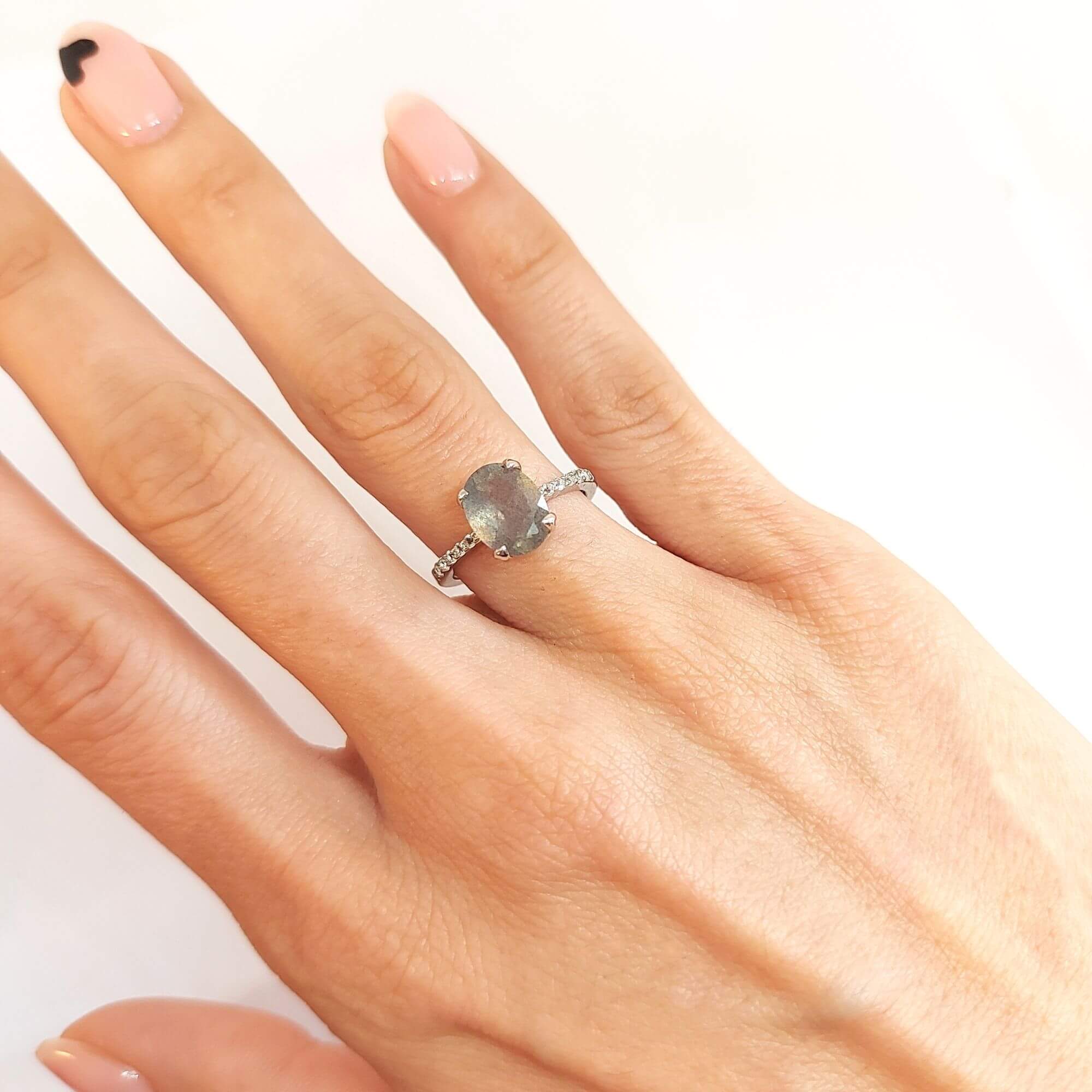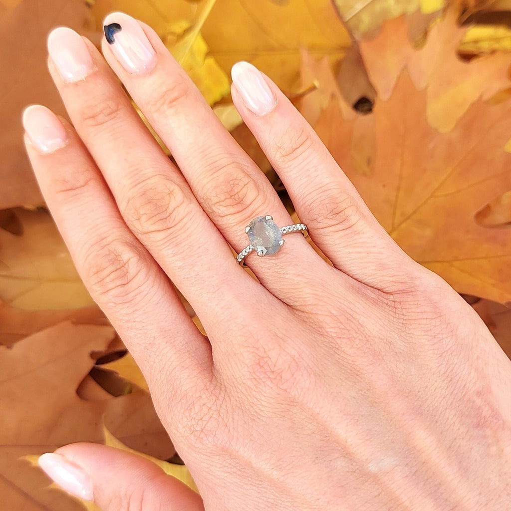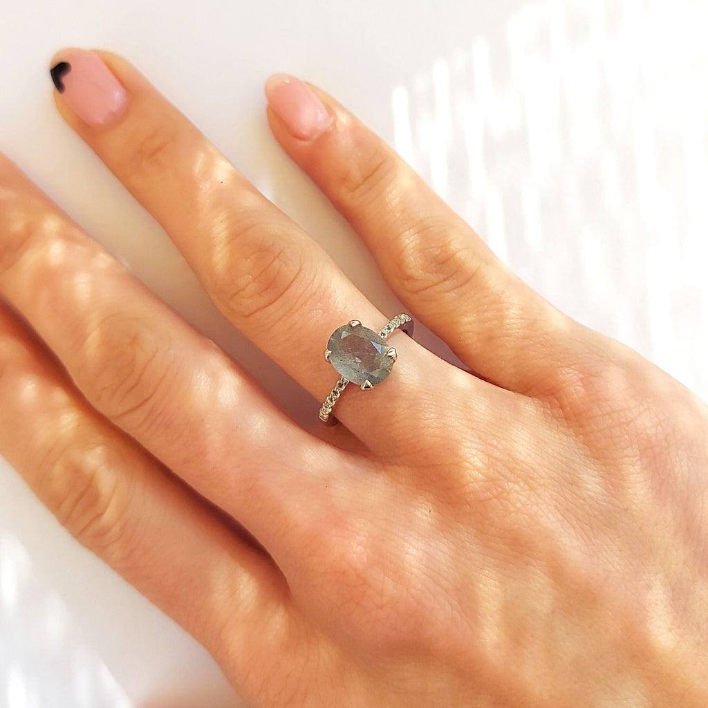 Sterling silver ring featuring natural labradorite, known for its shifting tones and inner glow. Paired with white topaz, the combination creates a design that feels calm yet bright, with a quiet sense of depth.