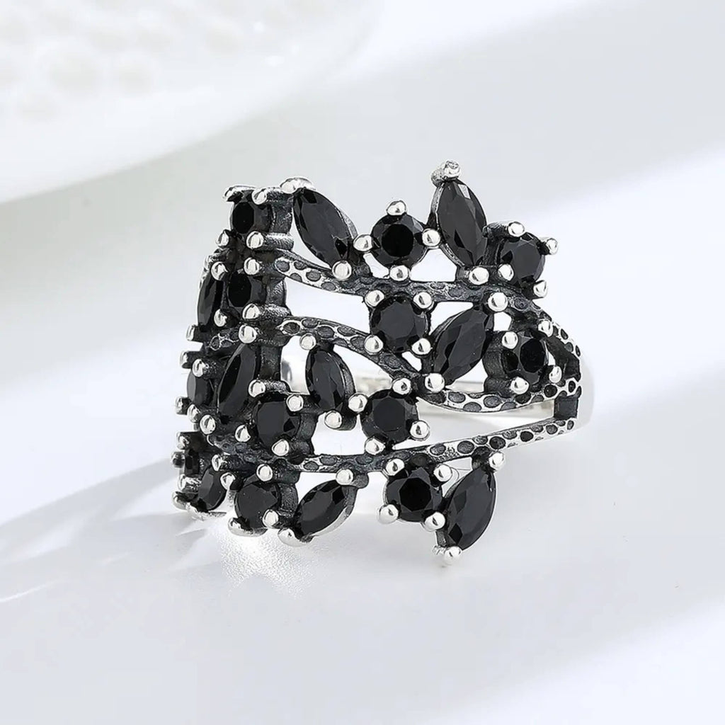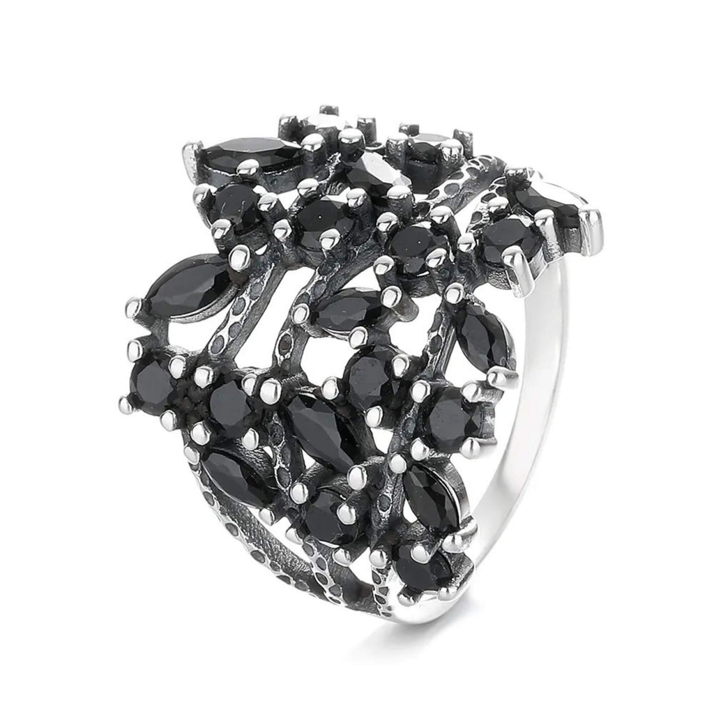 Sterling silver statement ring with black cubic zirconia stones set in a layered, nature-inspired design. The rich contrast and bold structure create a striking visual effect, offering a modern interpretation of organic forms. A powerful piece for those who prefer expressive and unconventional jewelry.